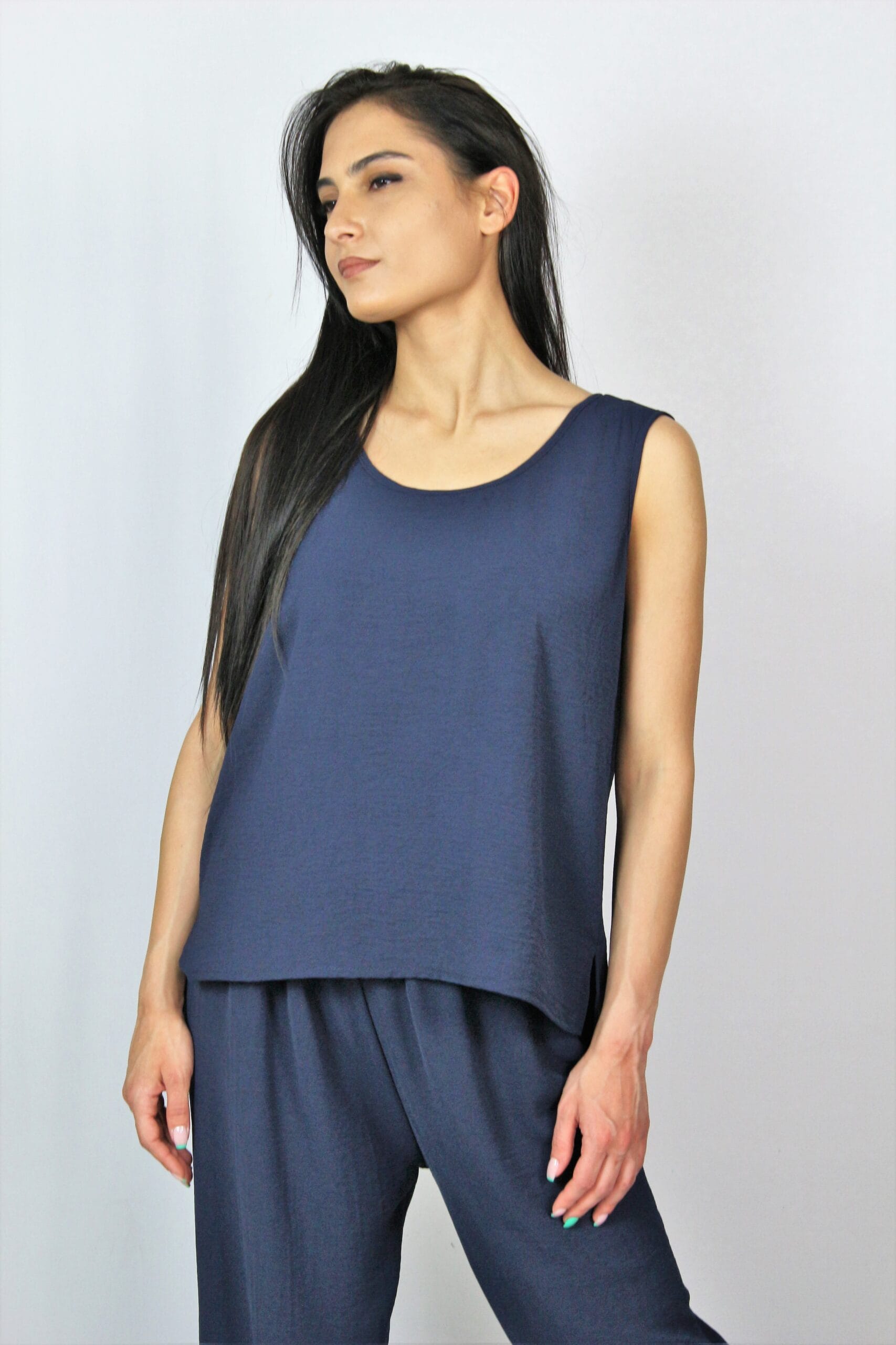 Асиметричен потник с обло деколте , широки презрамки.и цепки отстрани.