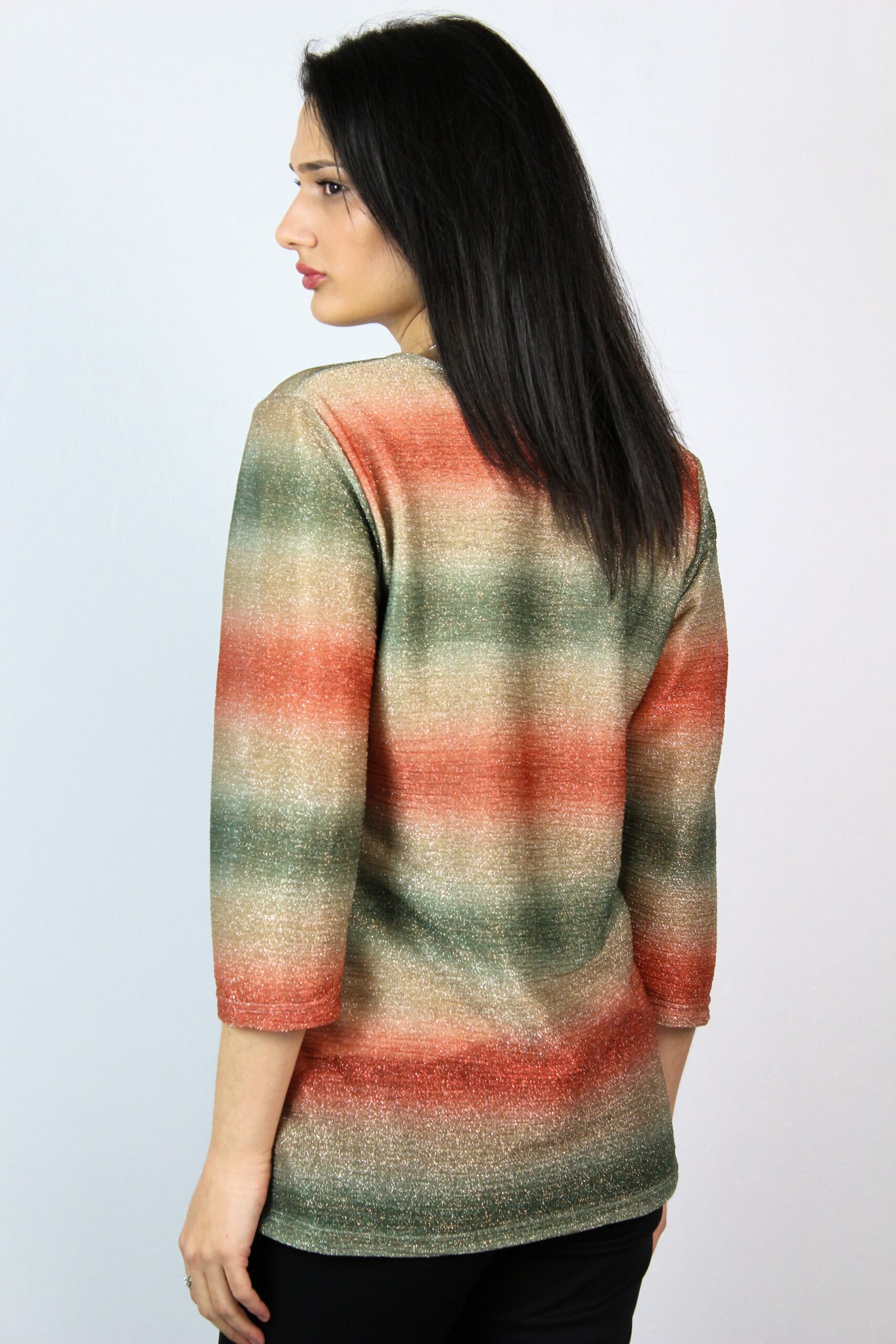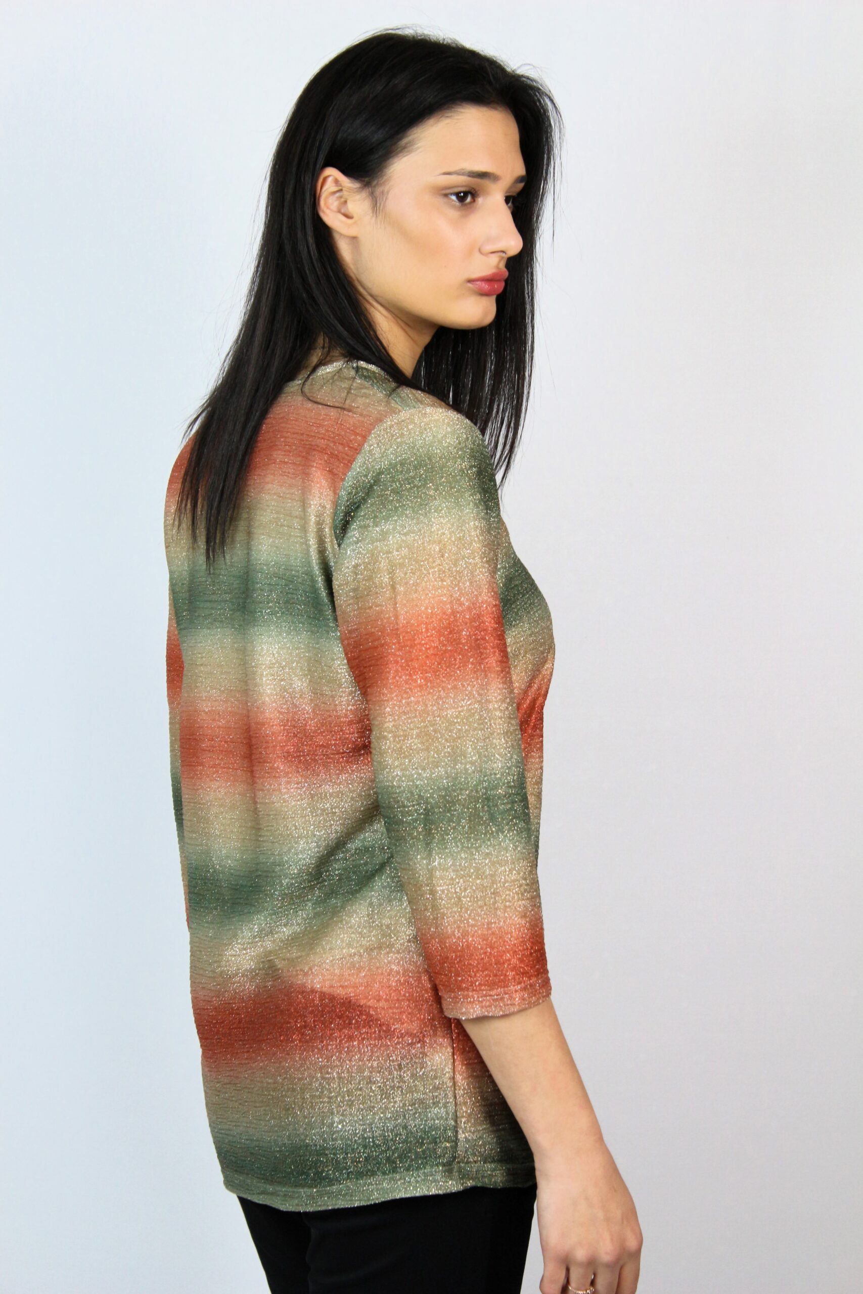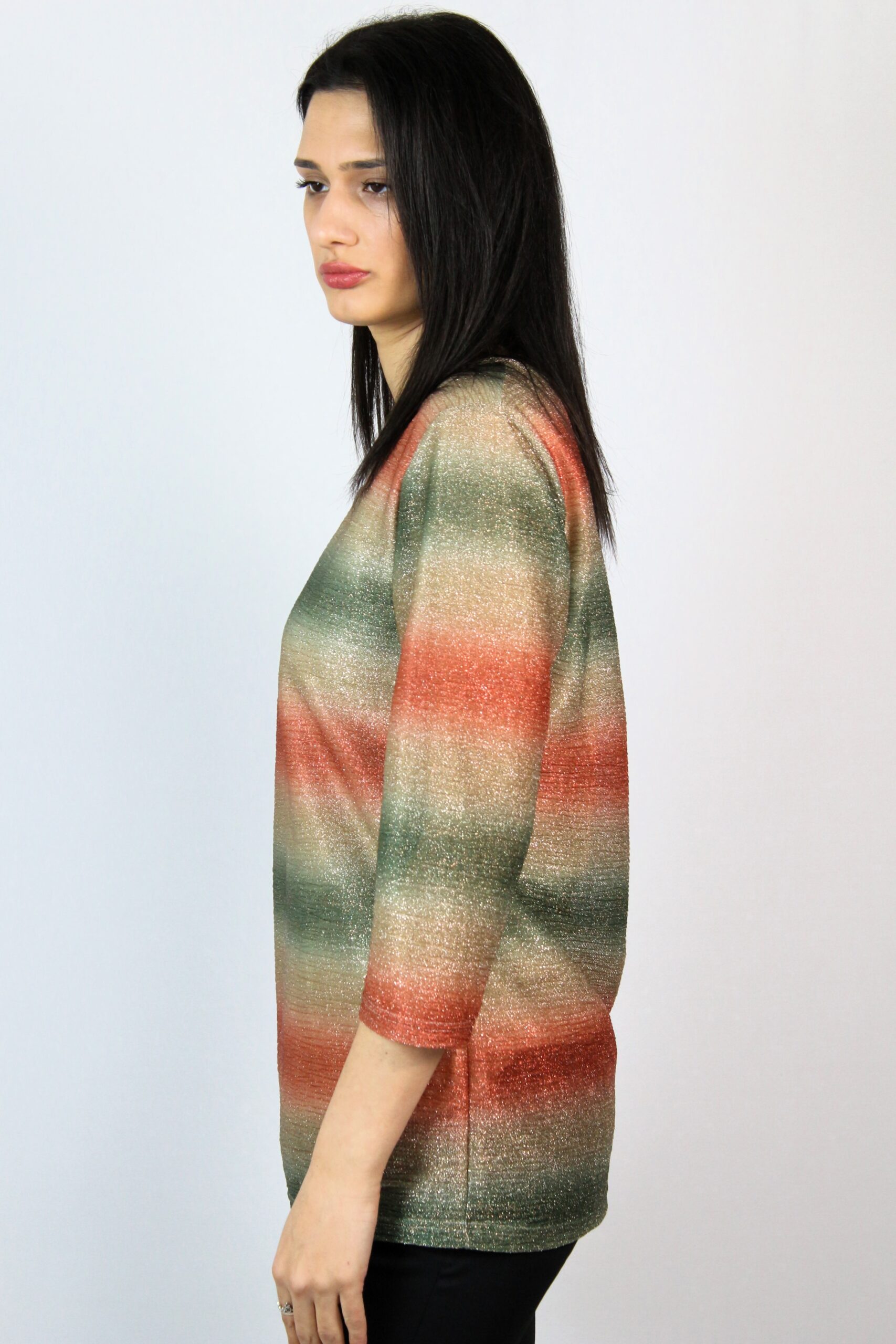 Блуза от еластично ламе с три четвърт ръкав и обло деколте .