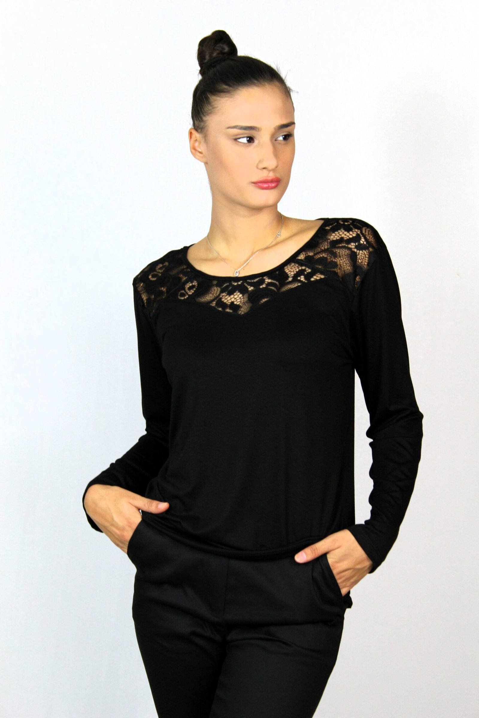 Блуза с дълъг ръкав и обло деколте,комбинирана с дантела.