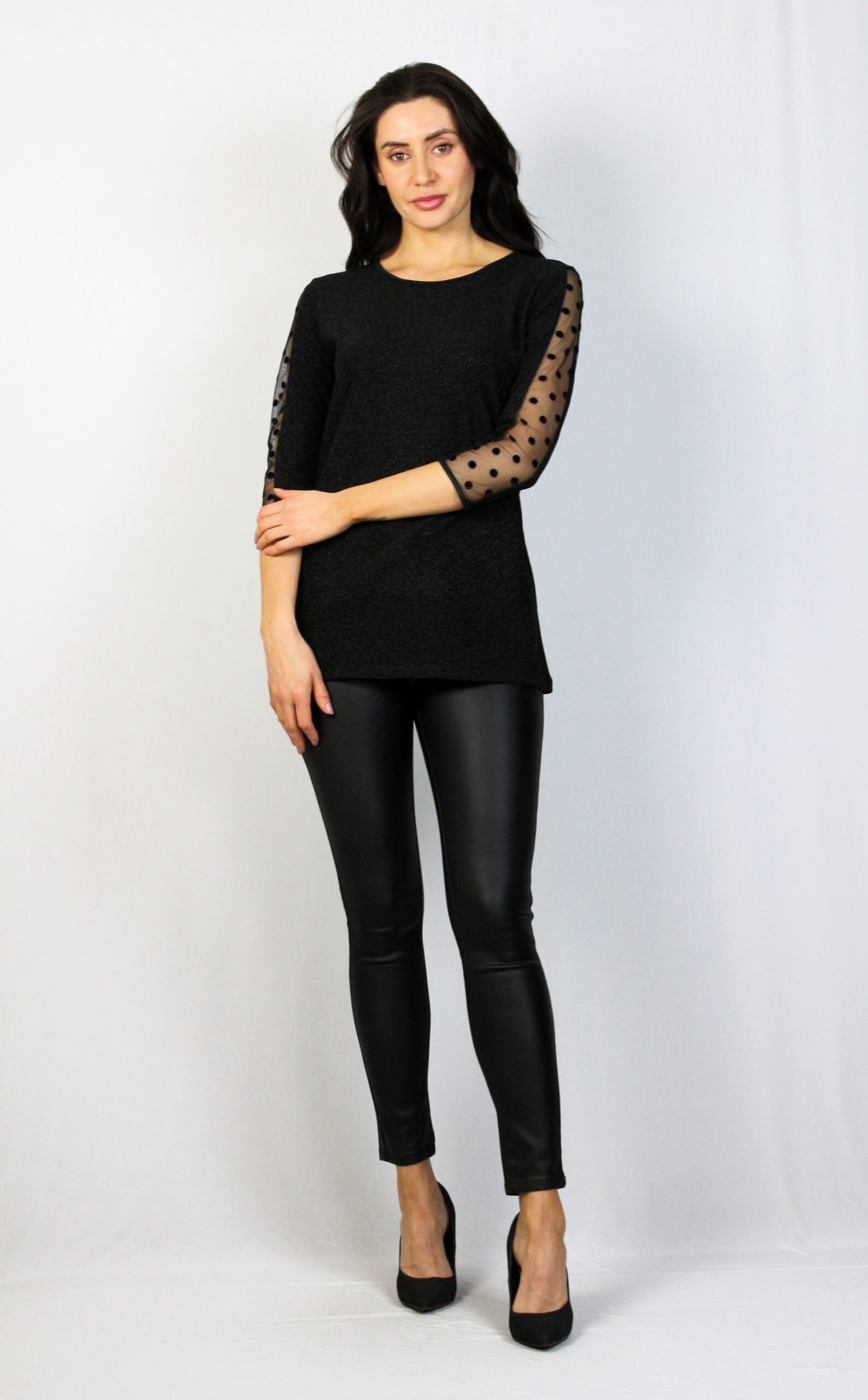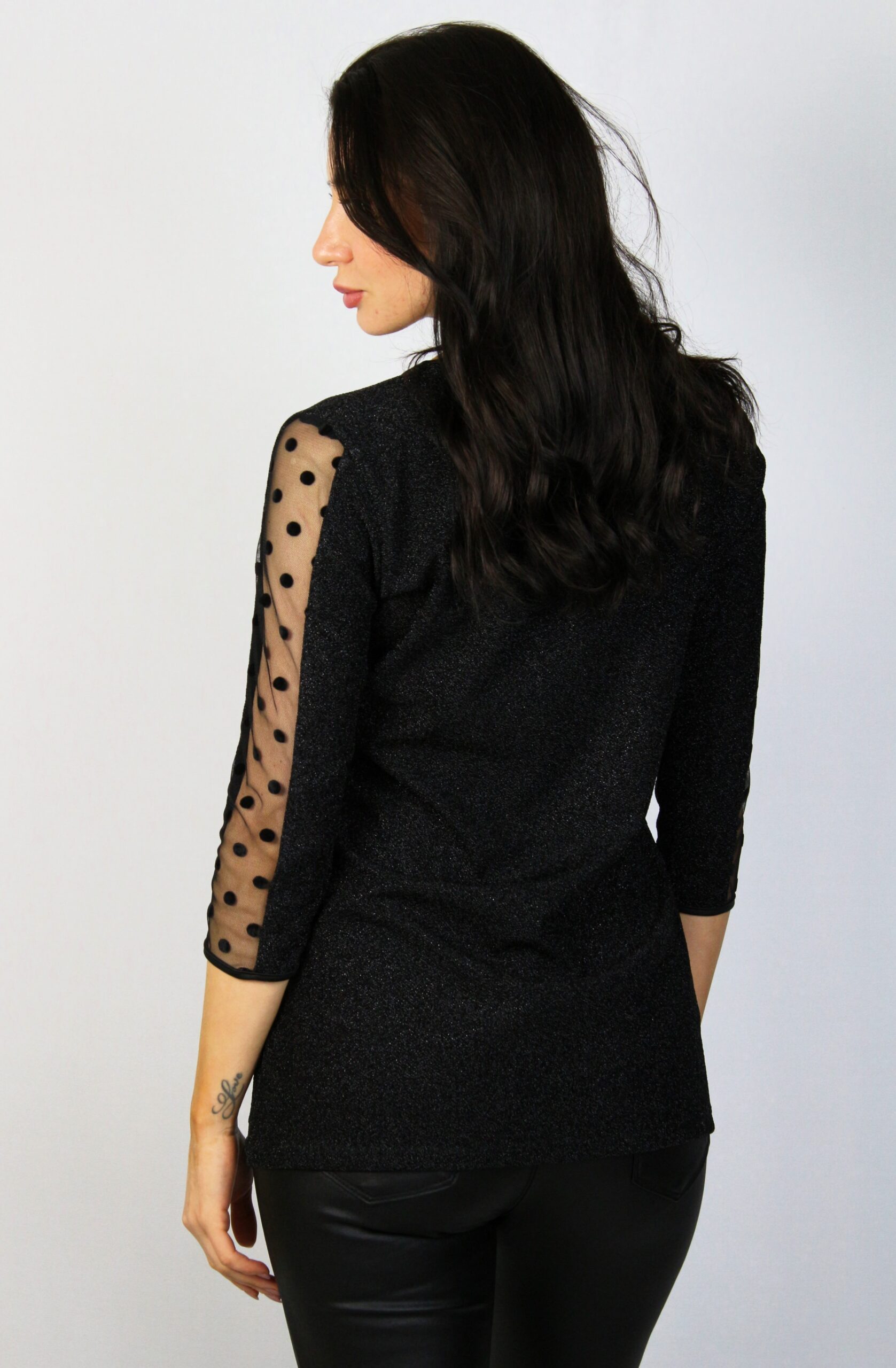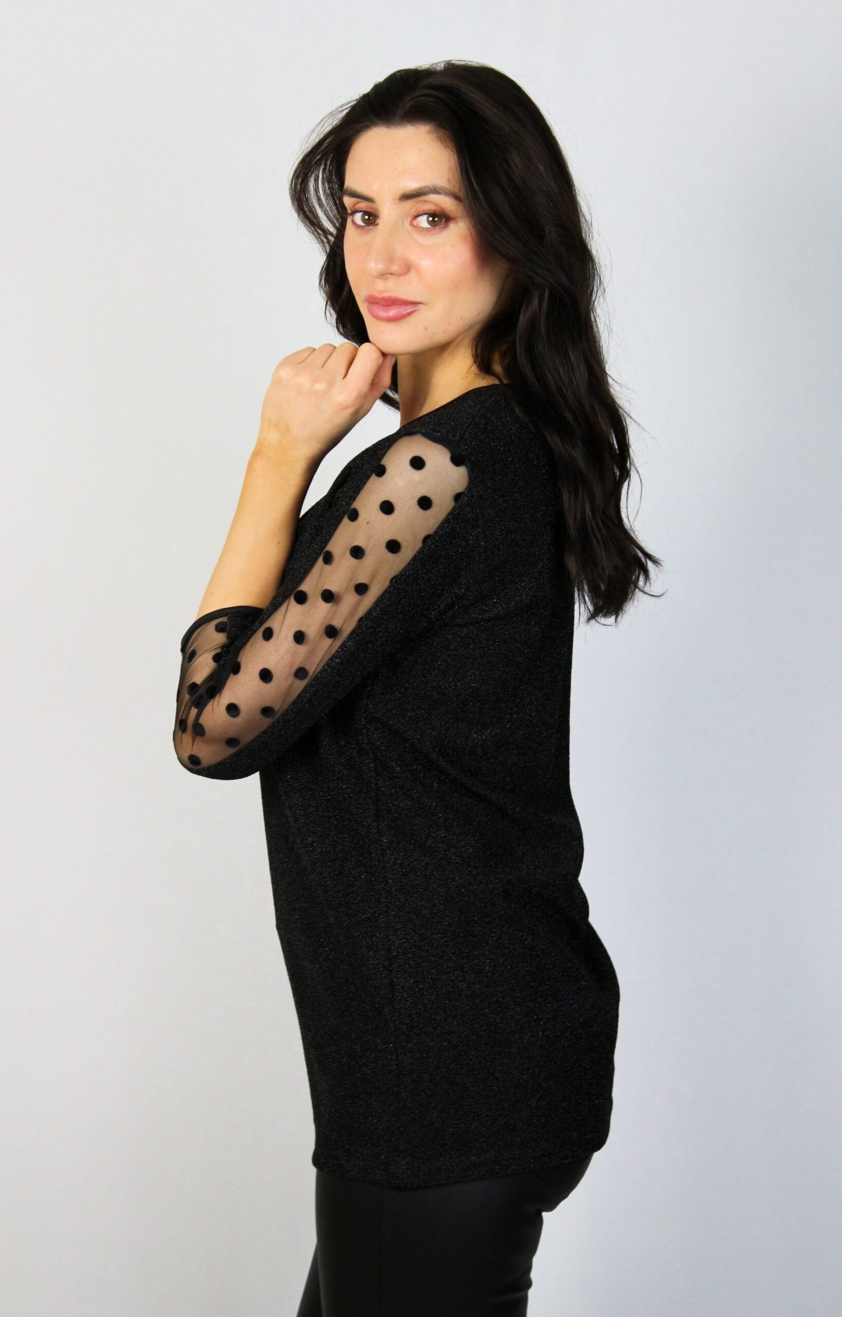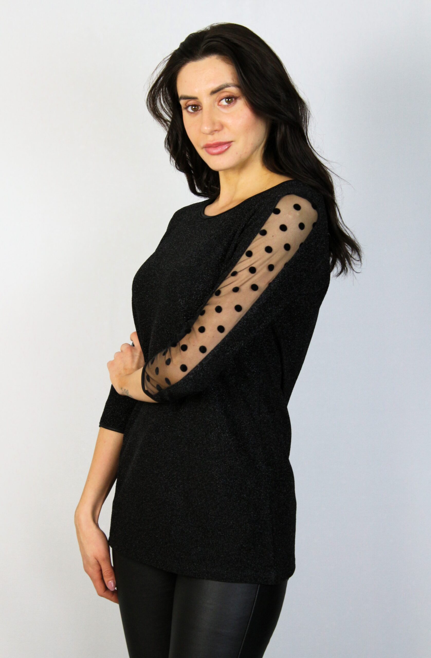 Блуза от еластично ламе с три четвърт ръкав и обло деколте , с кант на ръкавите от тюл на точки, който и придава стил и елегантност .