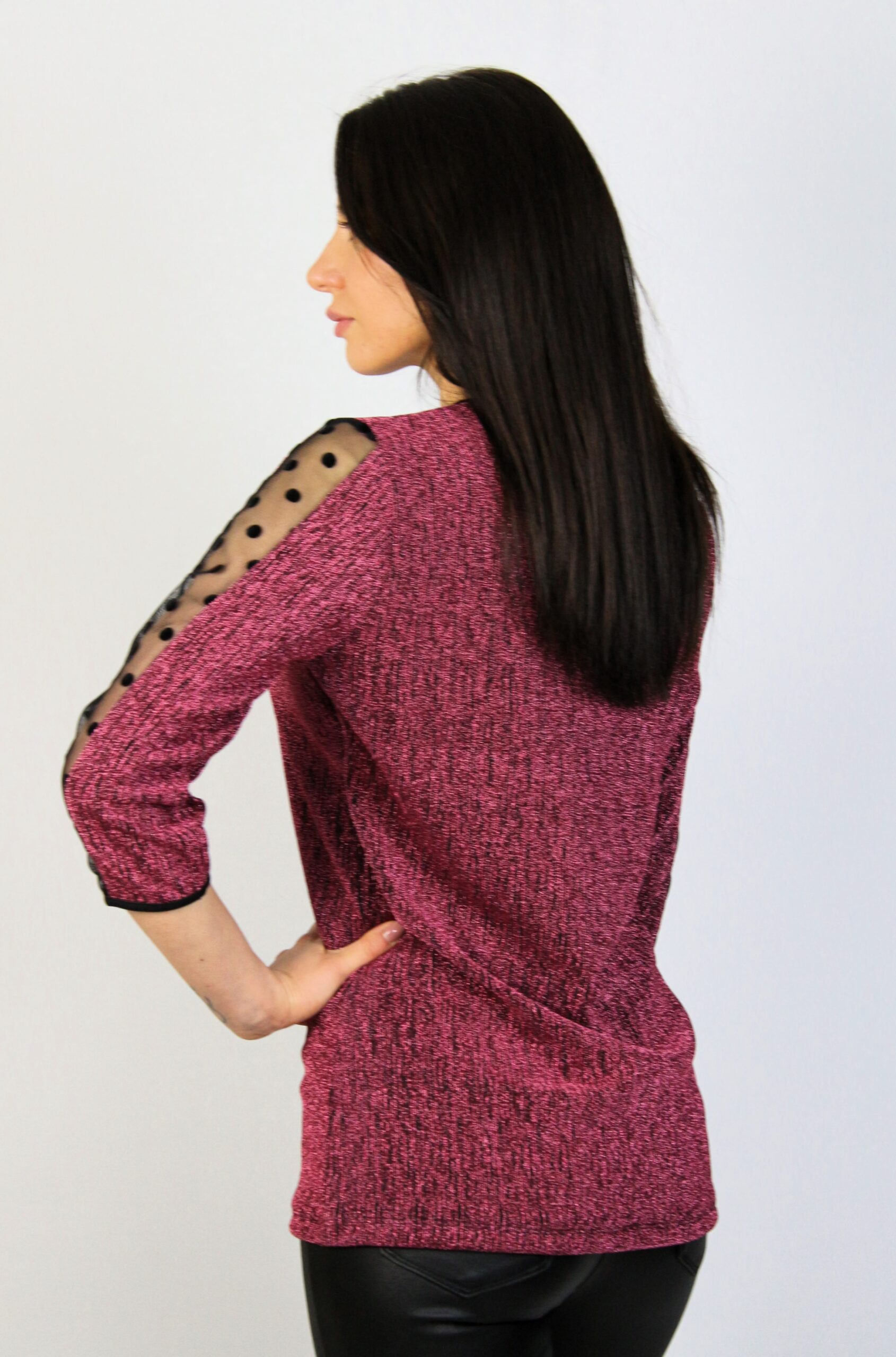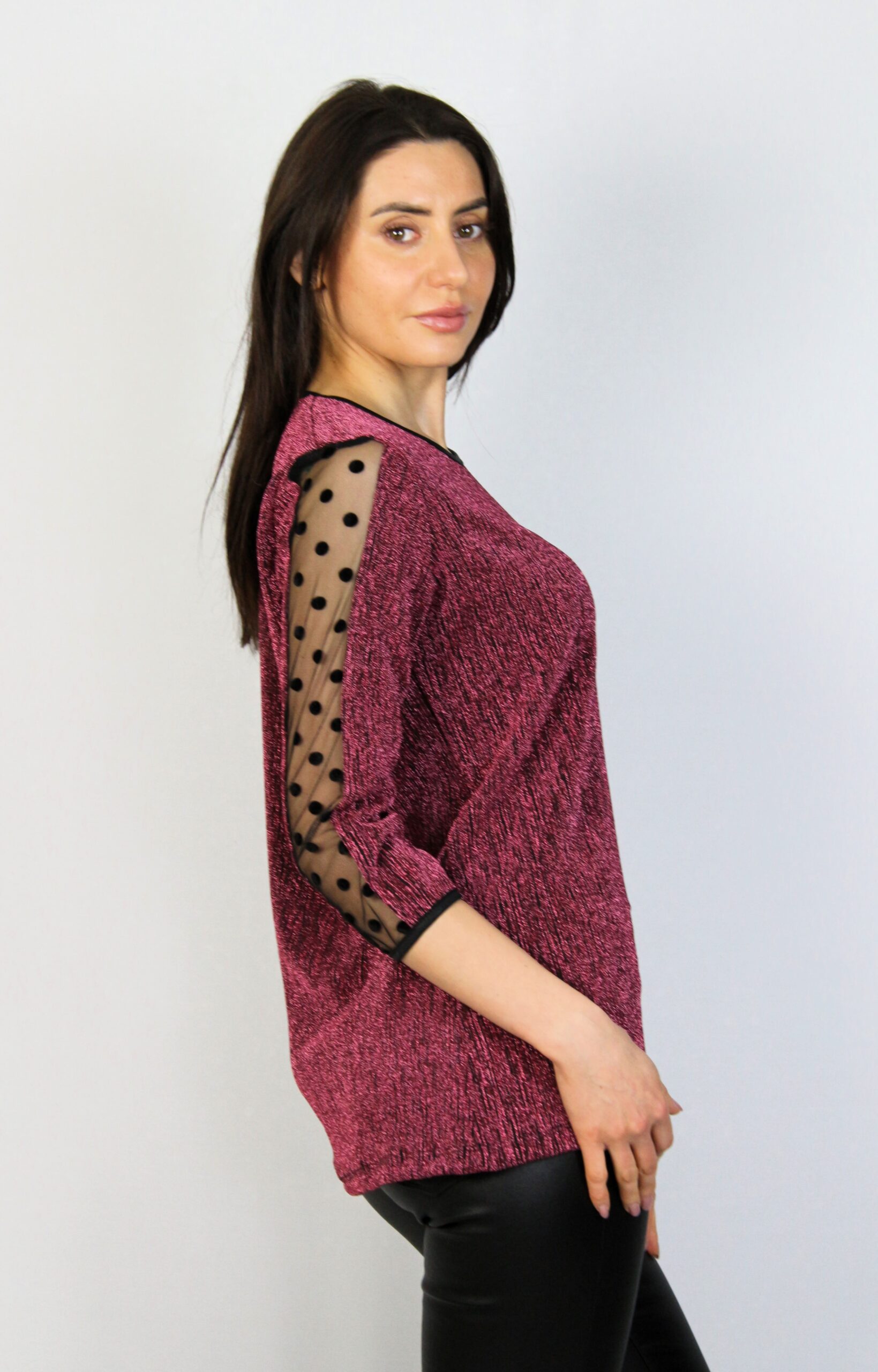 Блуза от еластично ламе с три четвърт ръкав и обло деколте , с кант на ръкавите от тюл на точки, който и придава стил и елегантност .
