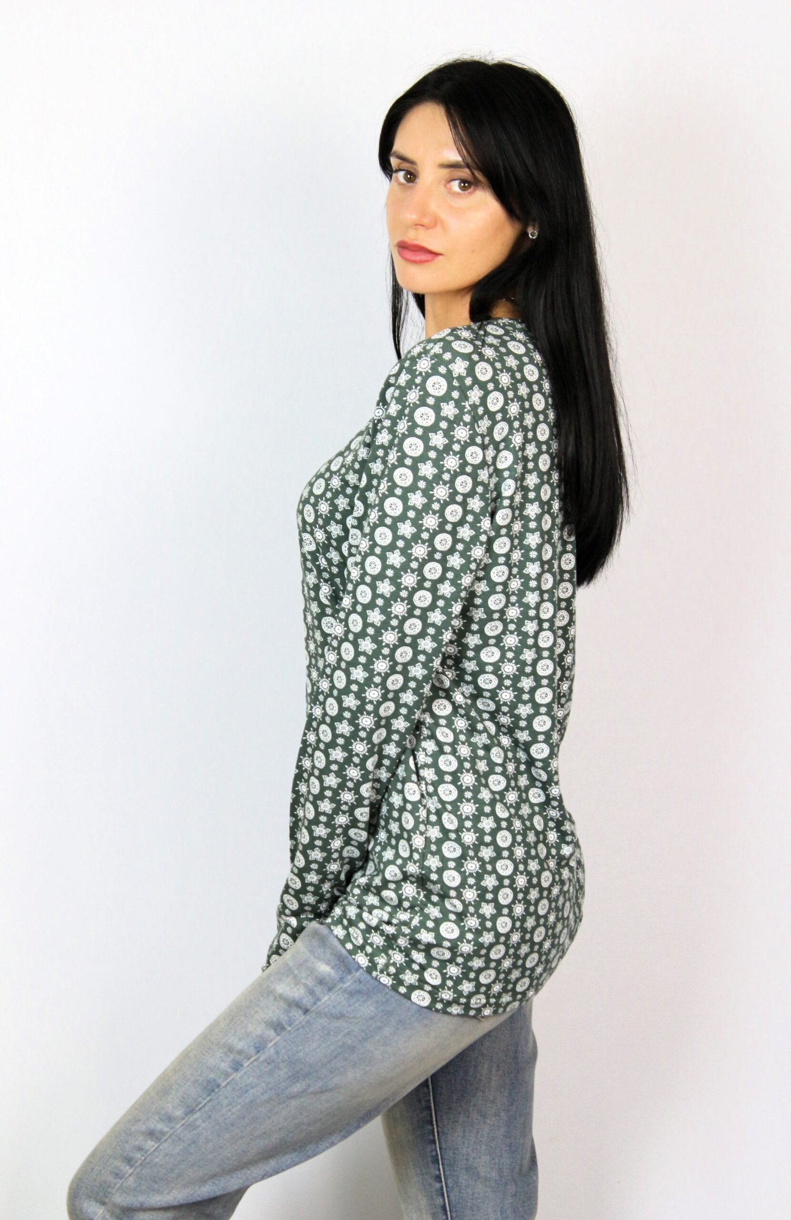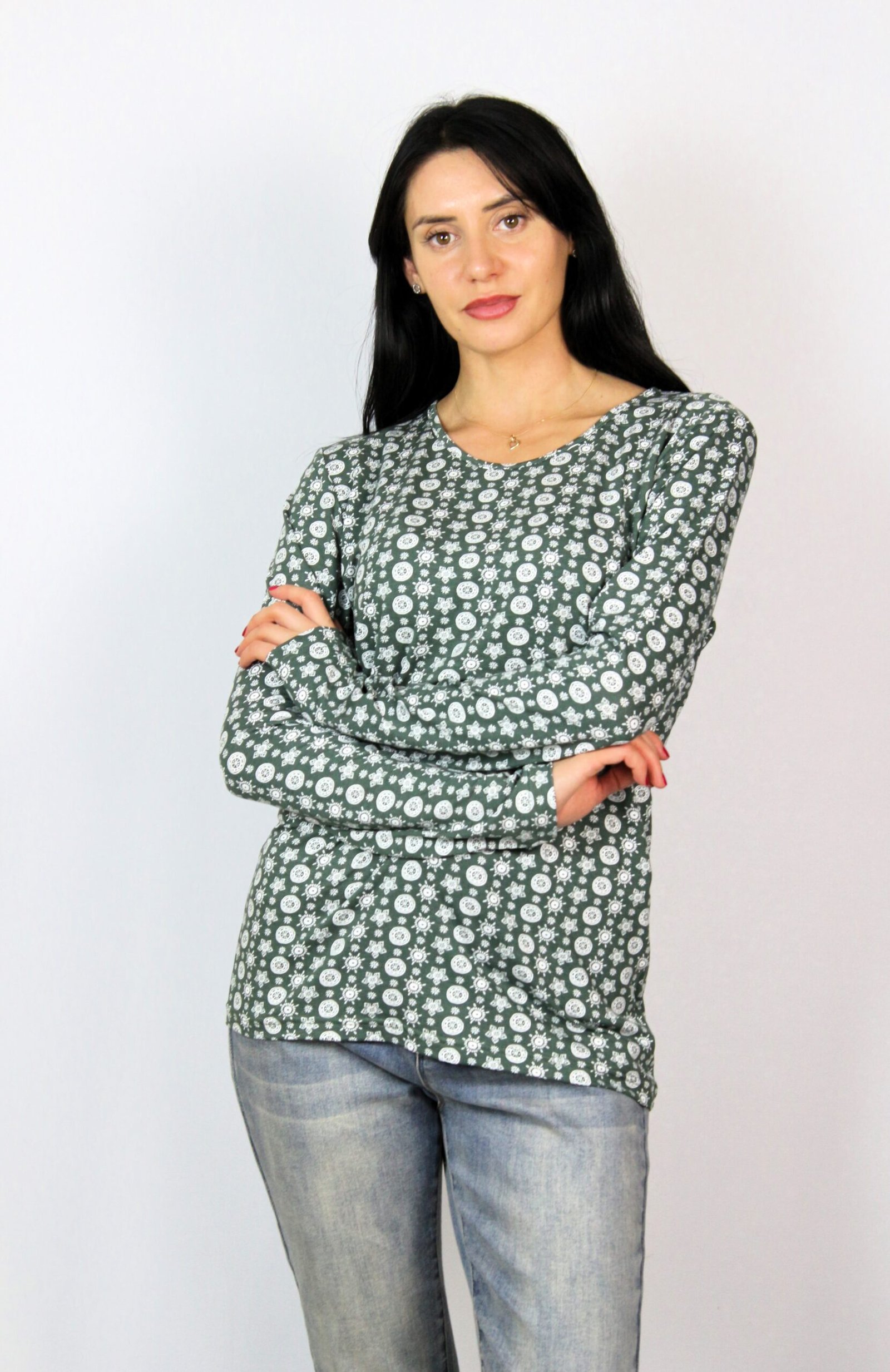 Блуза с дълъг ръкав и обло деколте от вискозно трико.