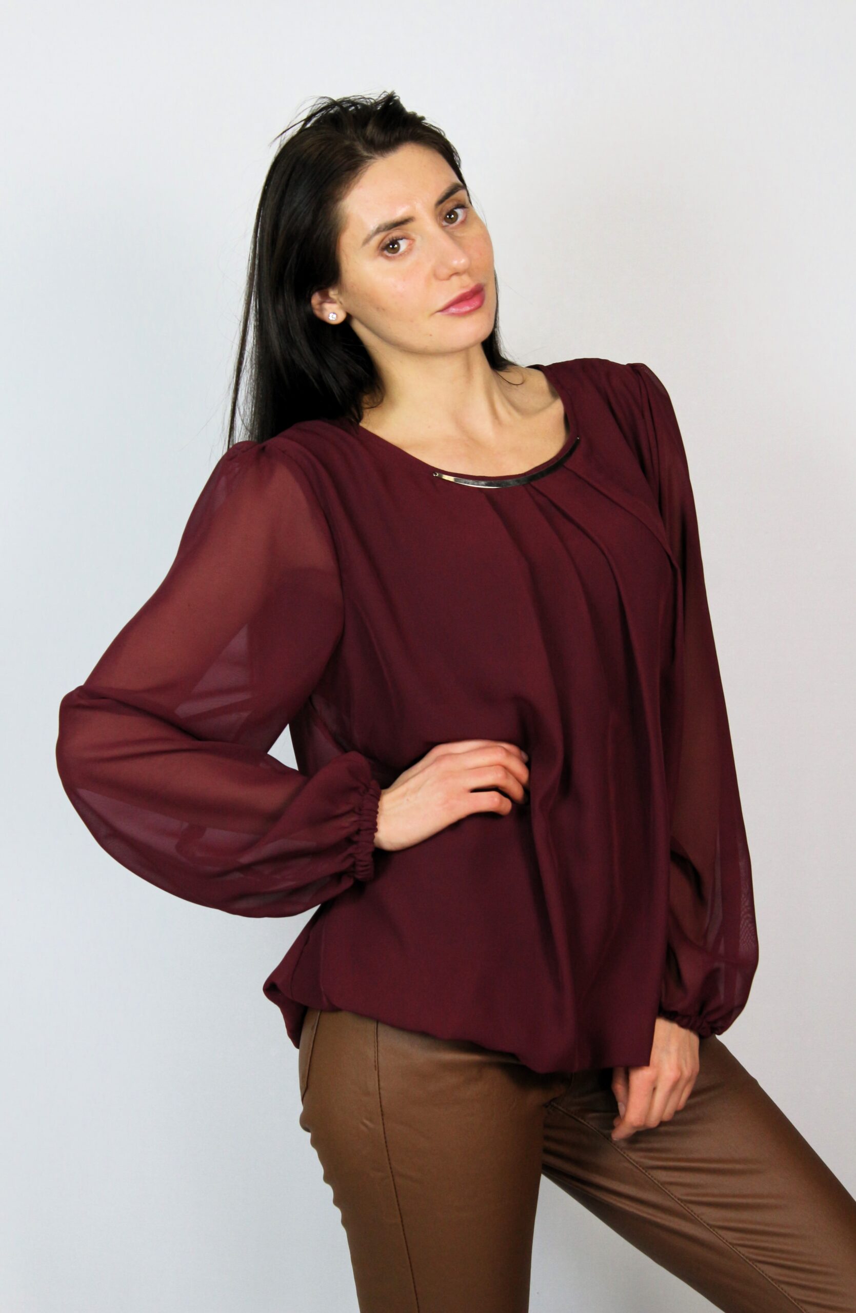 Блуза шифон с дълъг ръкав и хастар от вискозно трико. Ръкавите завършват с ластик , който позволява да се вдигат нагоре.