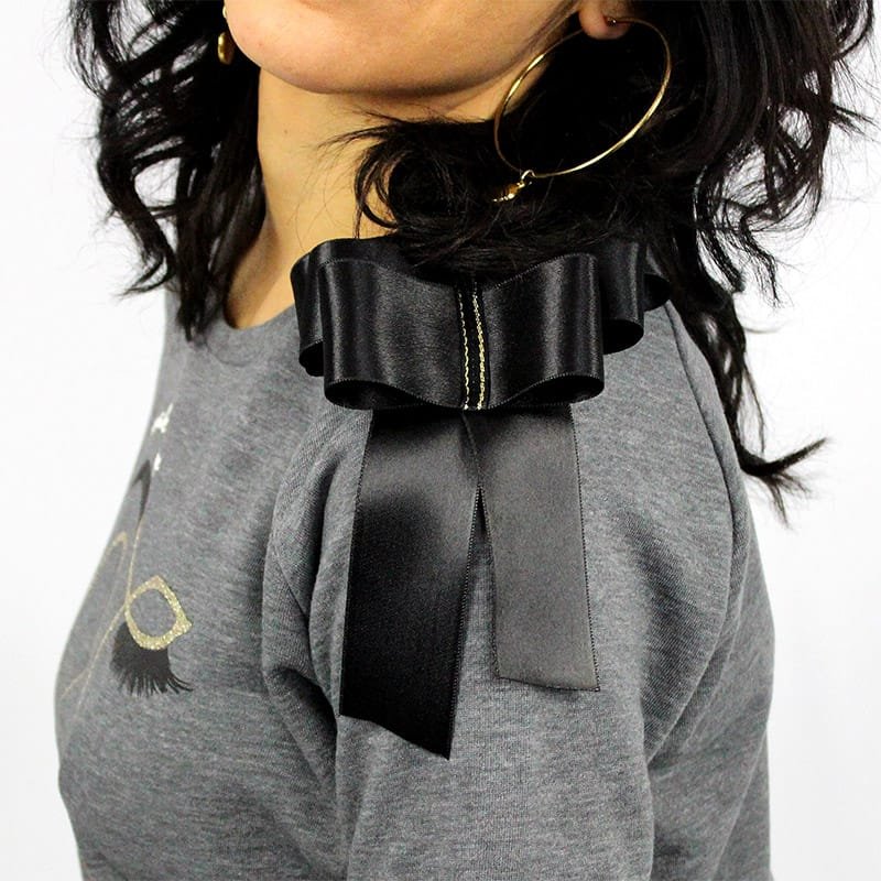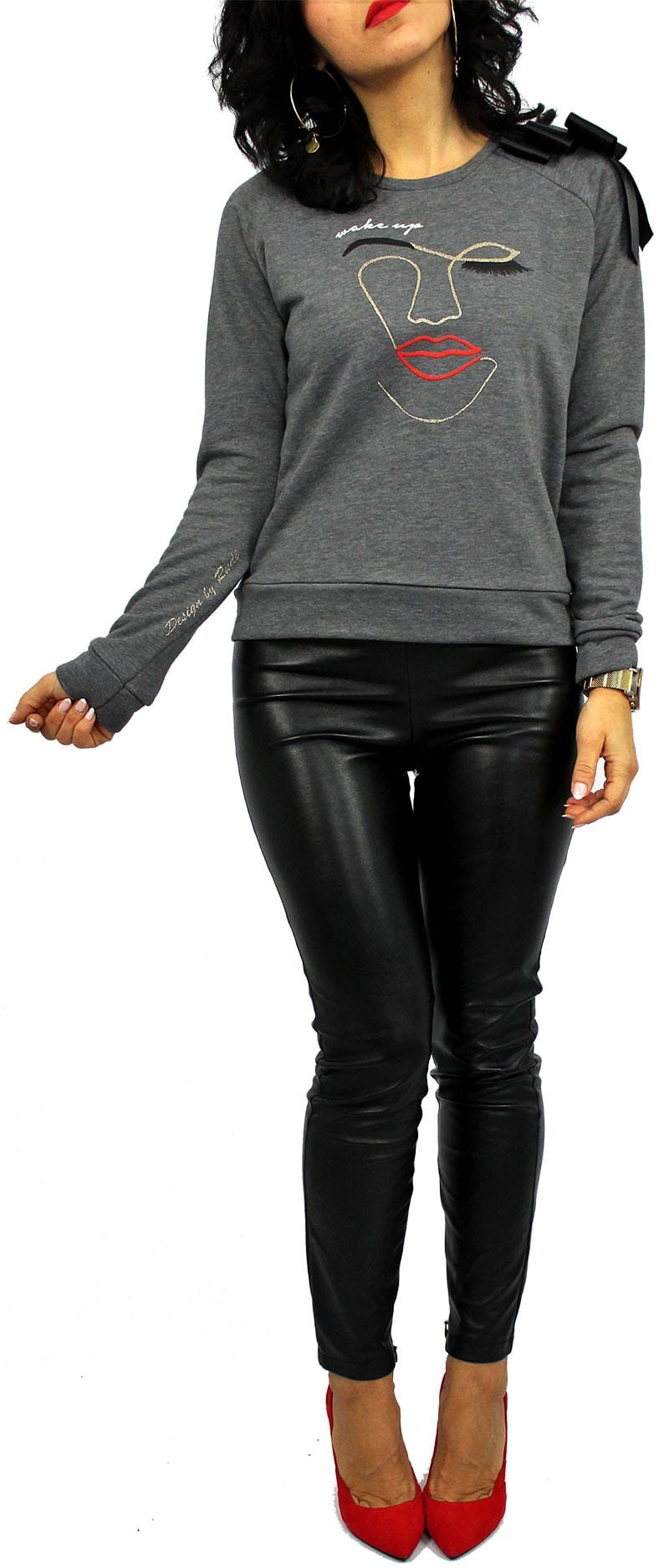 Спортно – елегантна блуза тип суитшърт с щампа лице от брокат и сатенена панделка на ръкава. Изработена от качествено памучно трико.