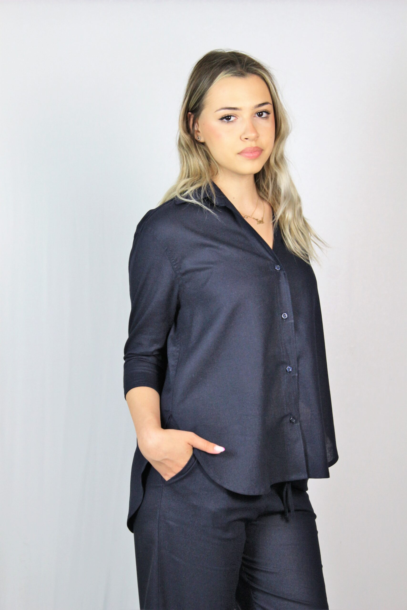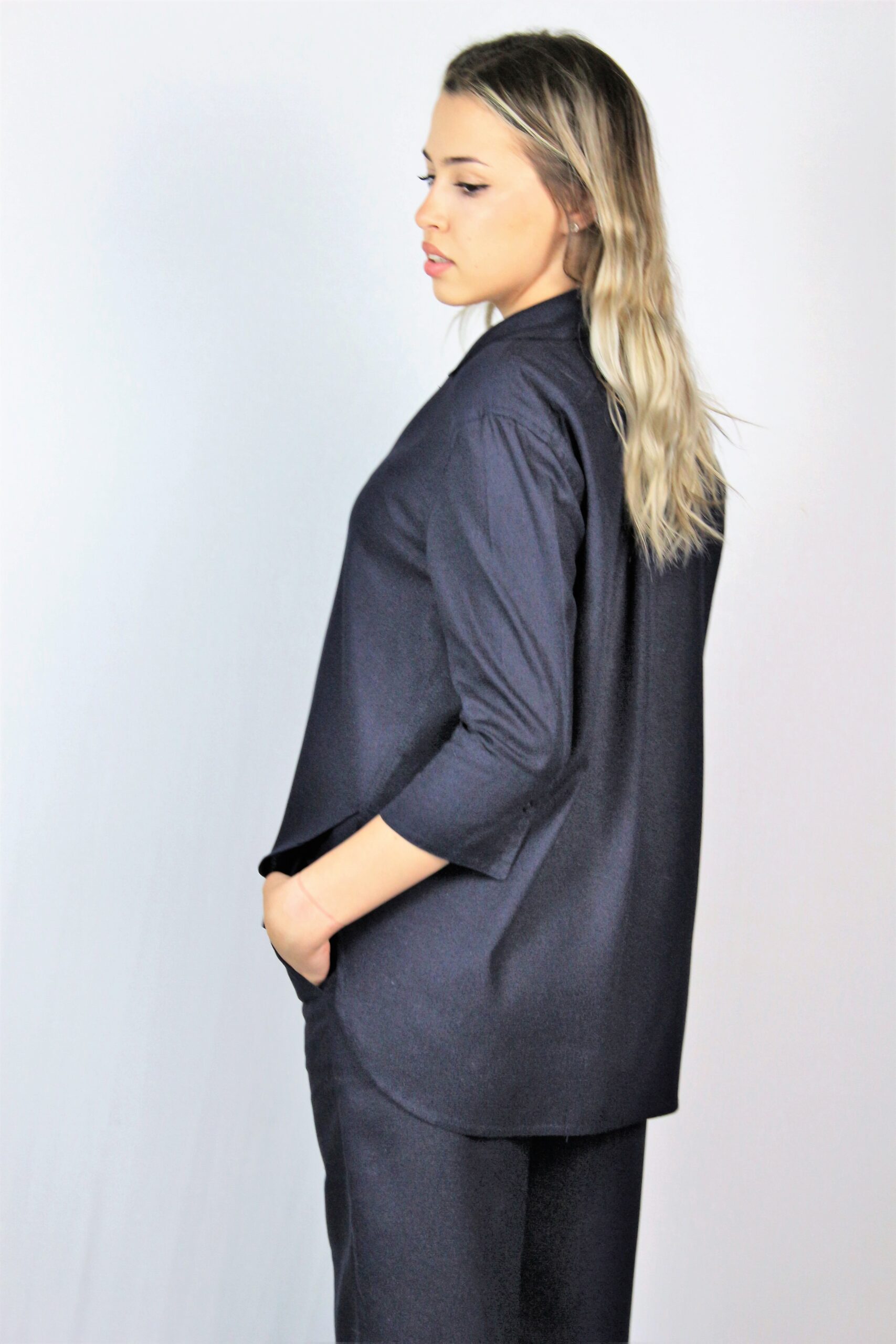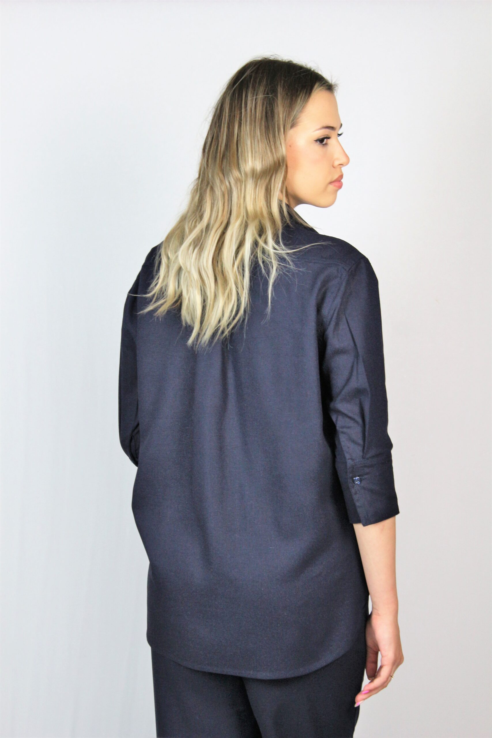 Свободна риза с три-четвърт ръкав с маншет, асиметрична дължина и плоха на гърба .