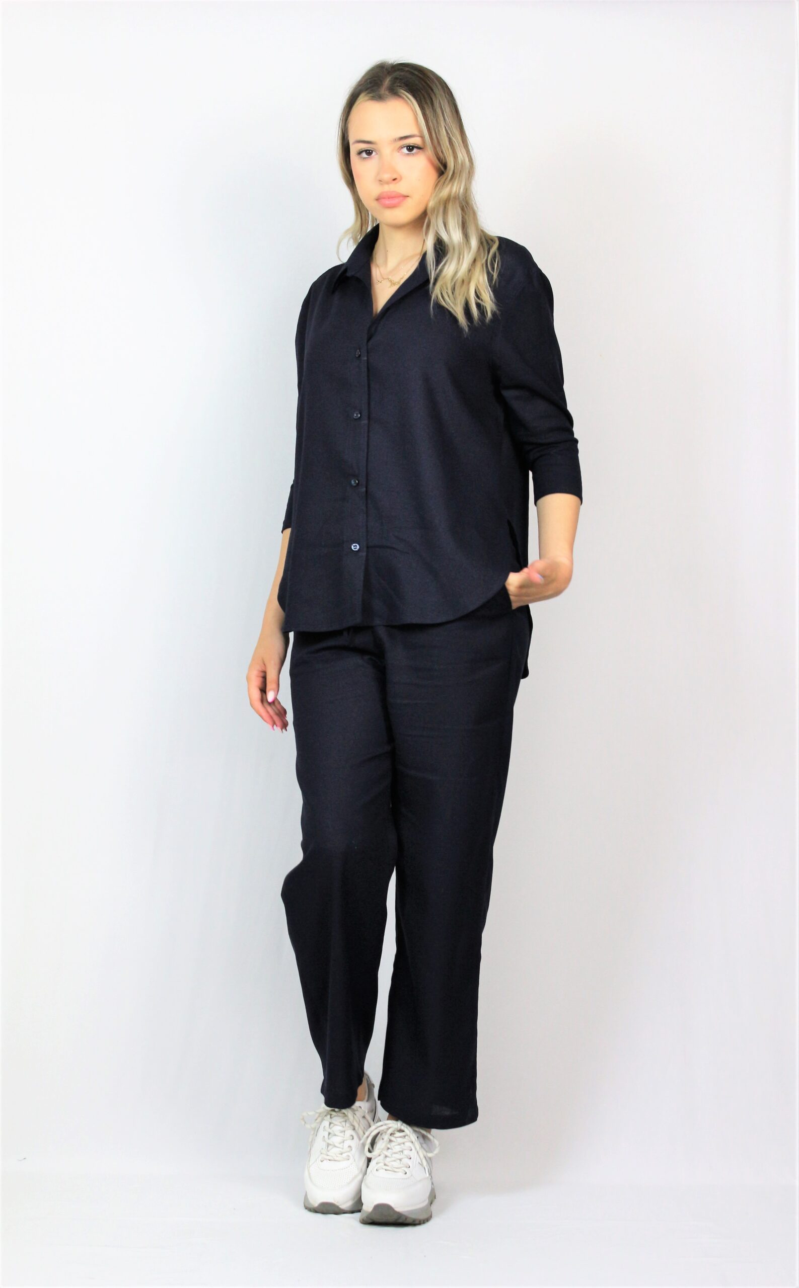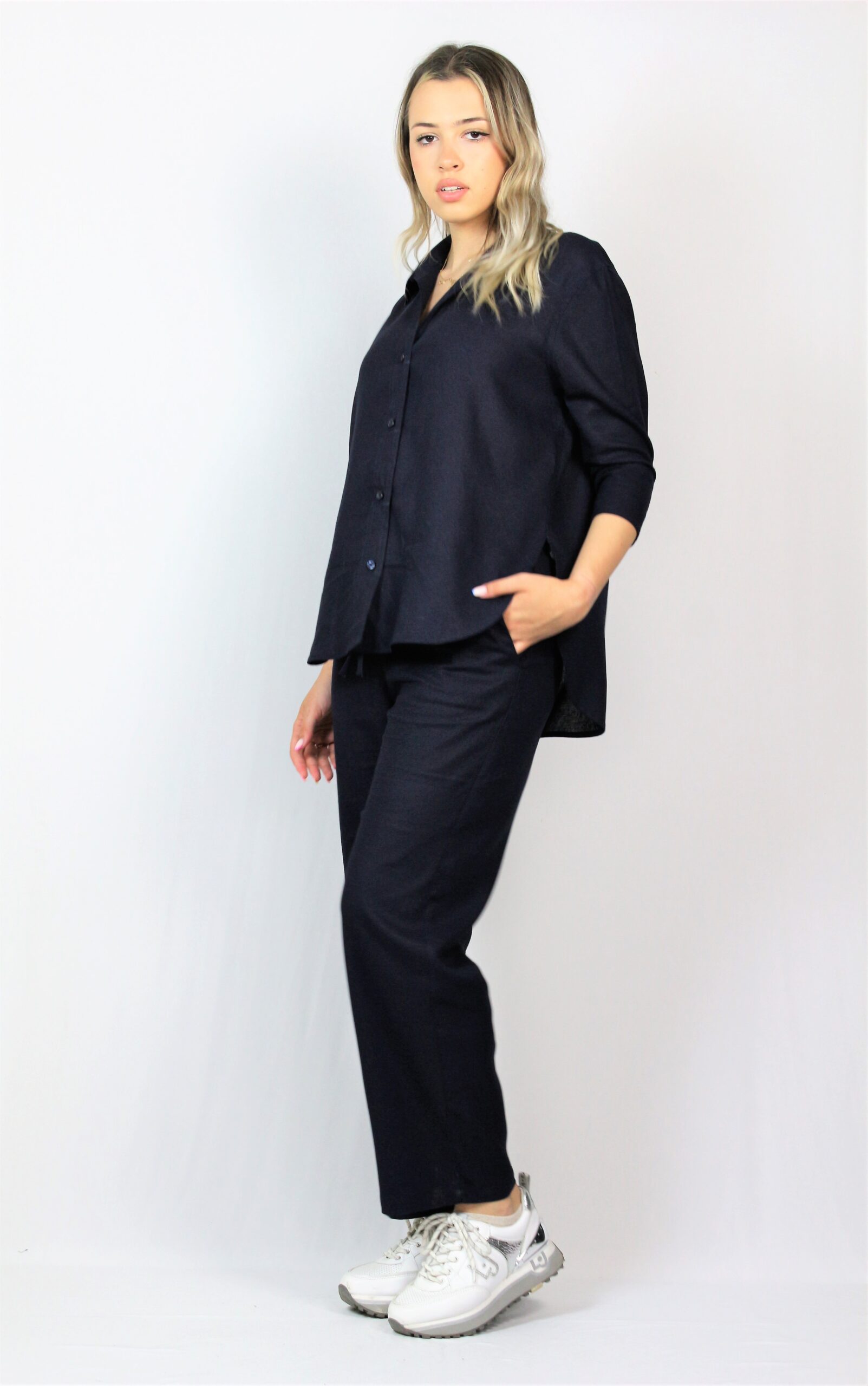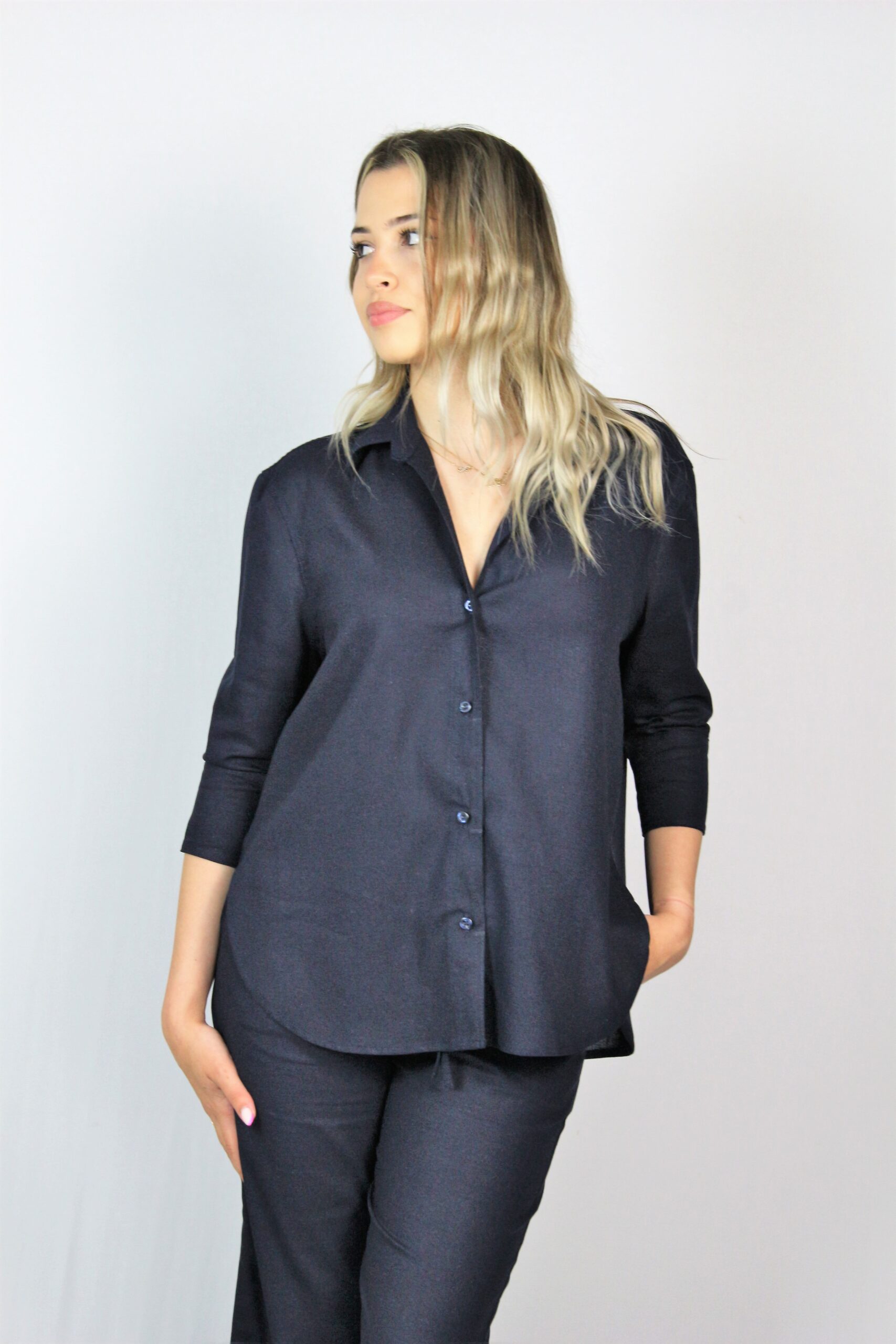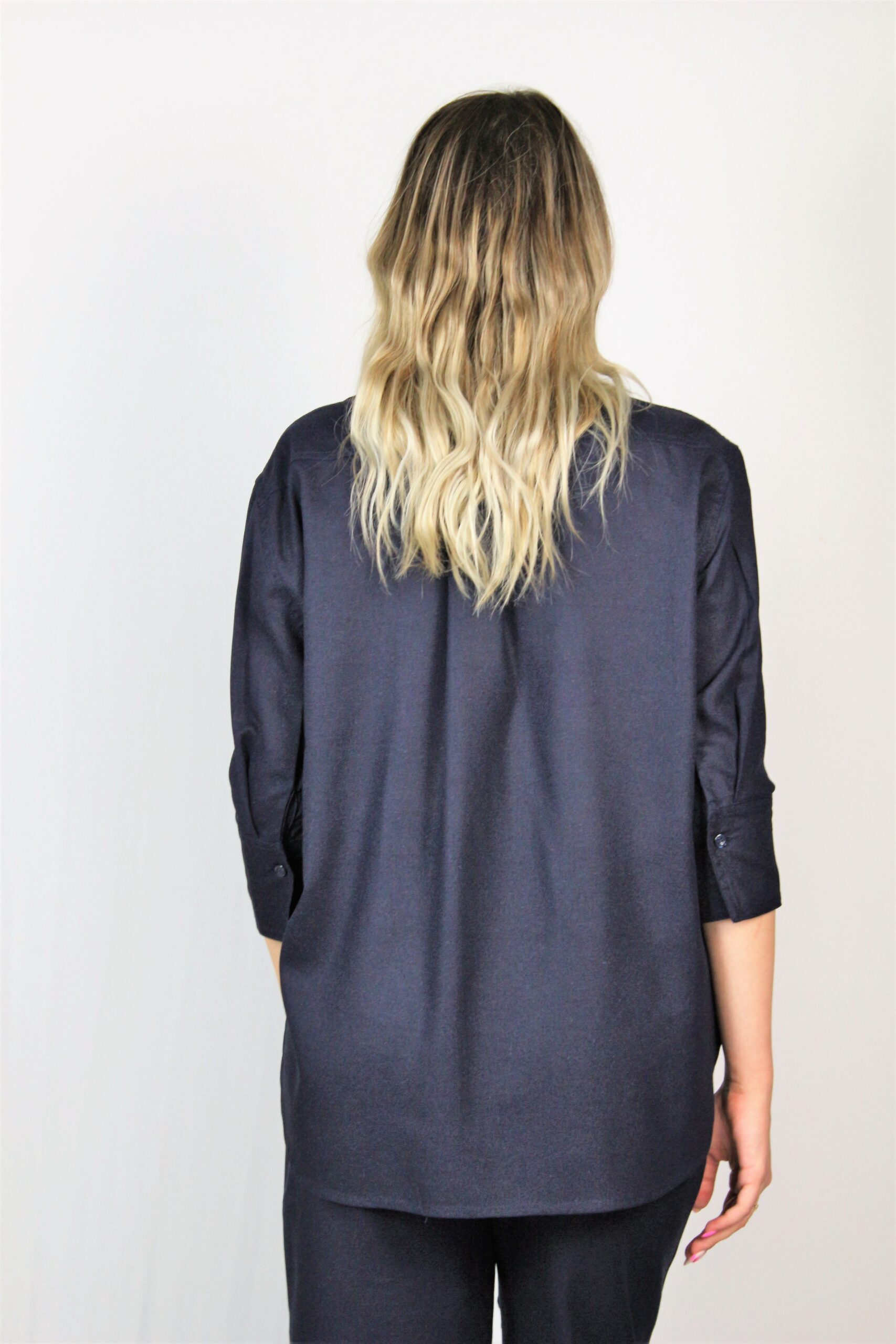 Свободна риза с три-четвърт ръкав с маншет, асиметрична дължина и плоха на гърба .