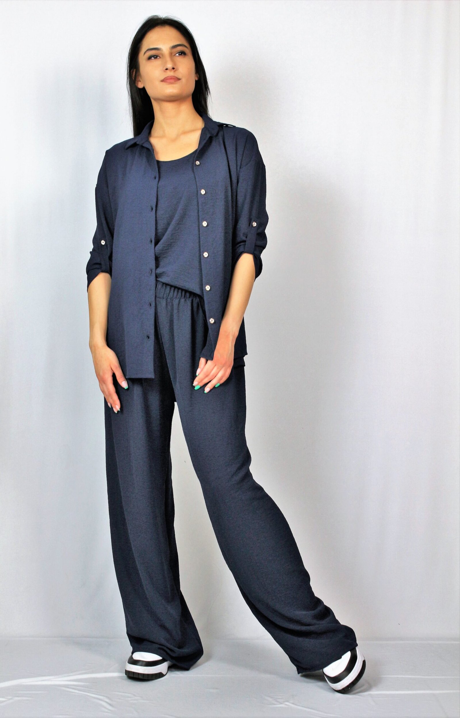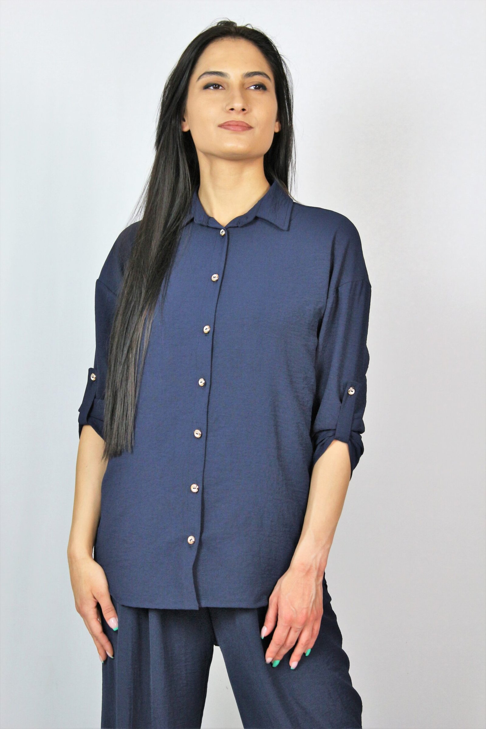 Риза с яка с ревер ,асиметричен подгъв и три четвърт ръкав, който се фиксира с копче на къс. . Закопчаване с копчета отпред.