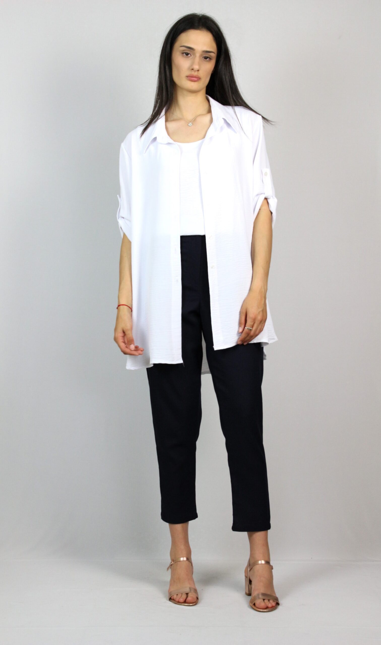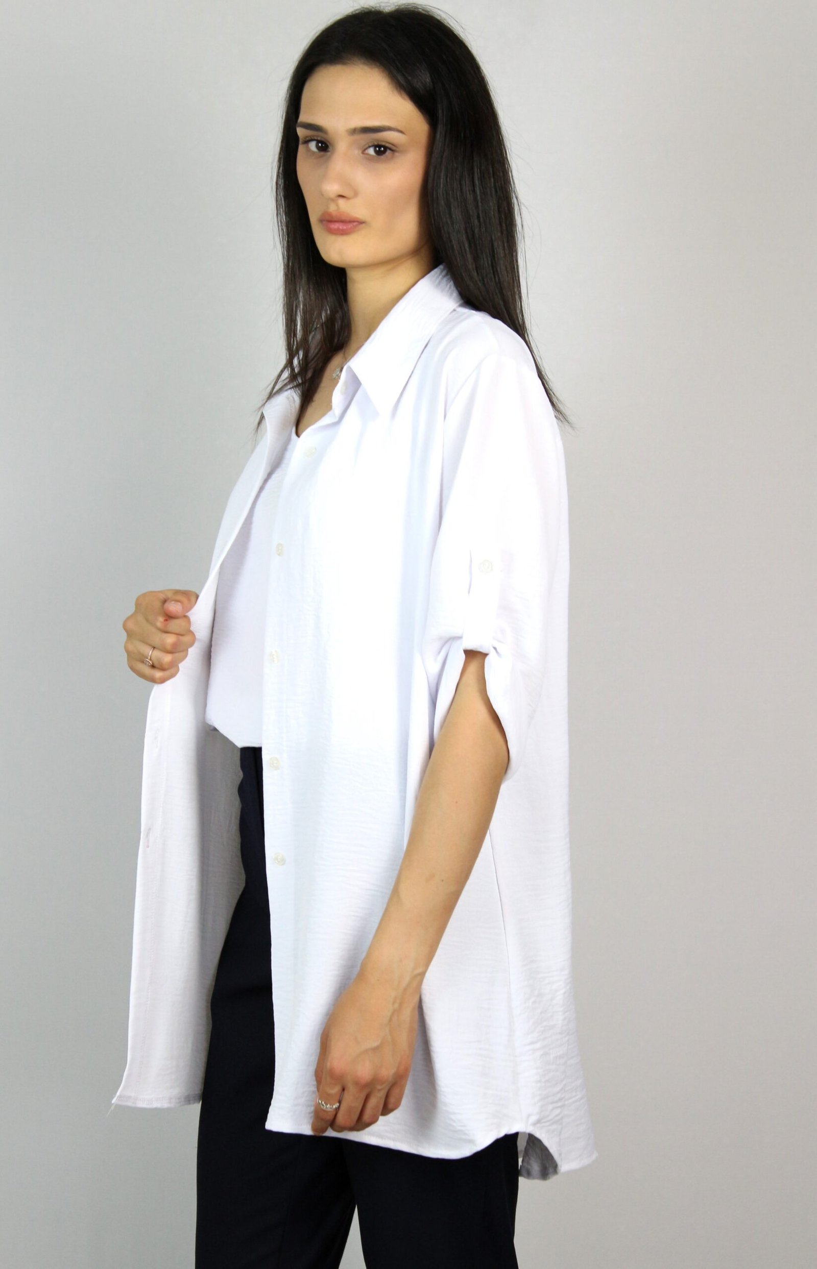 Свободно падаща риза с три четвърт ръкав, който се фиксира с копче на къс. . Закопчаване с копчета отпред.