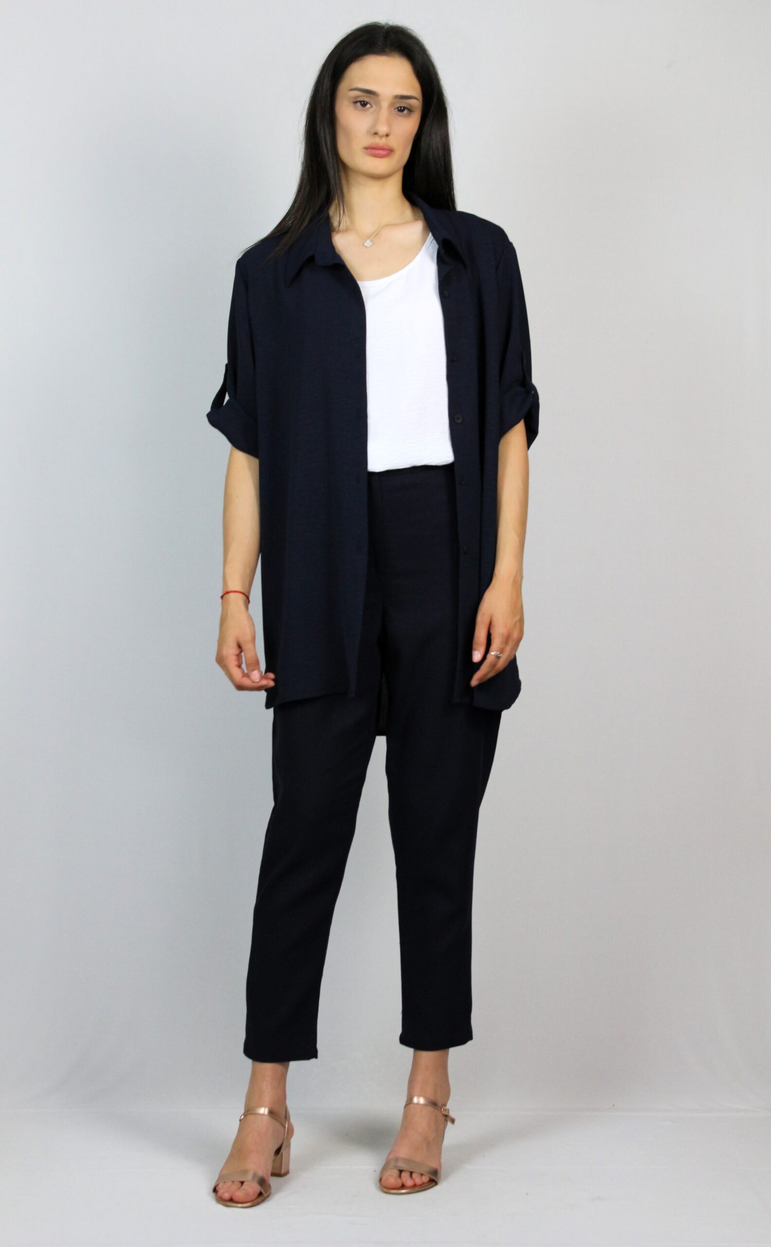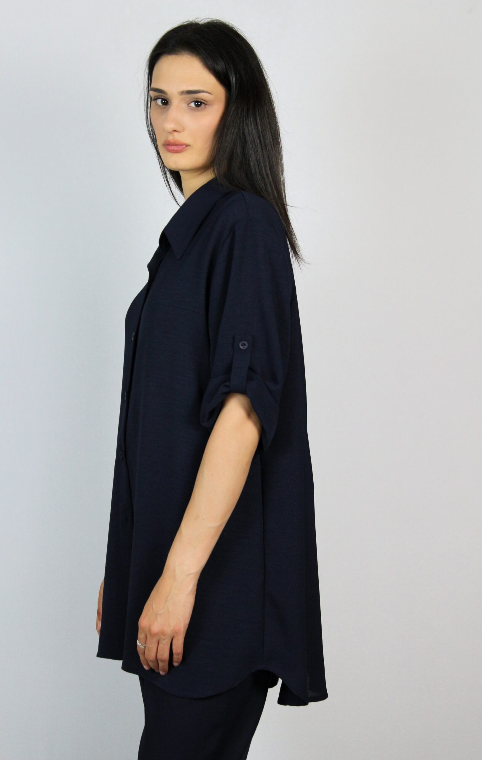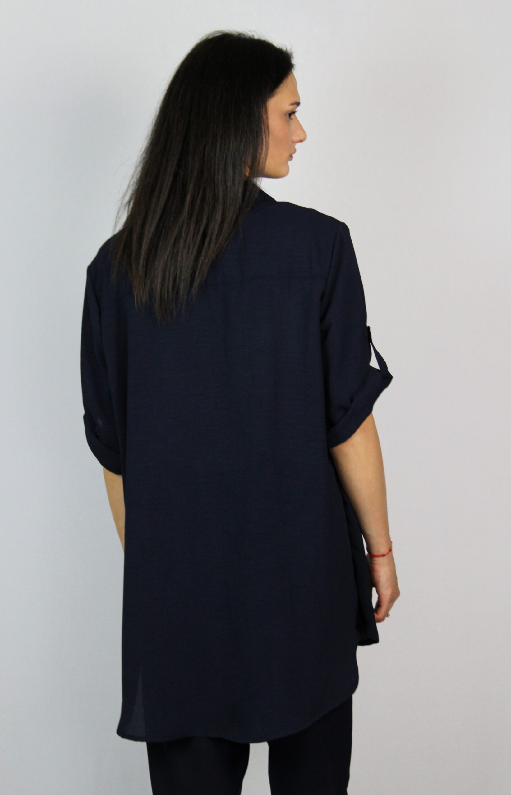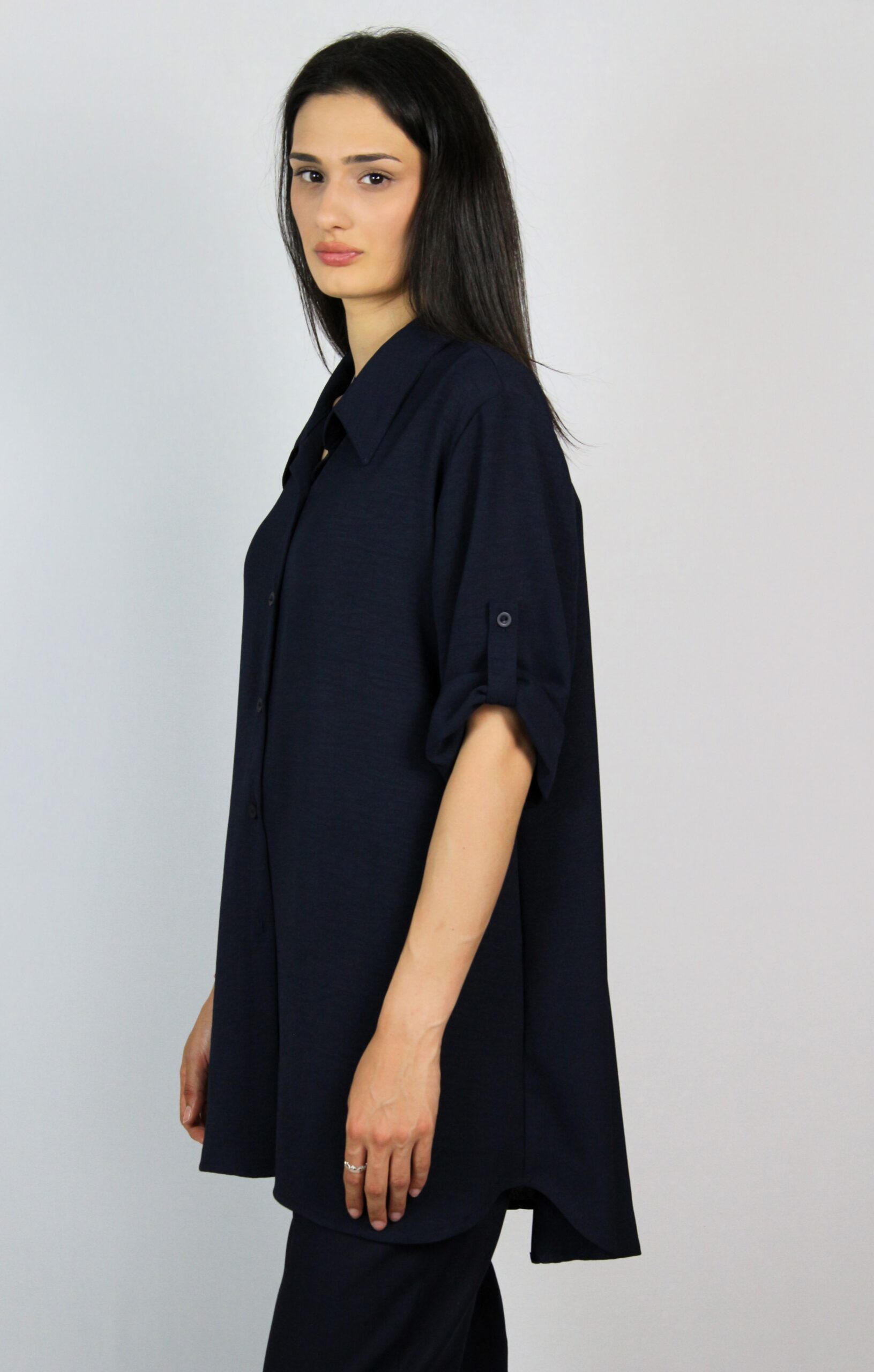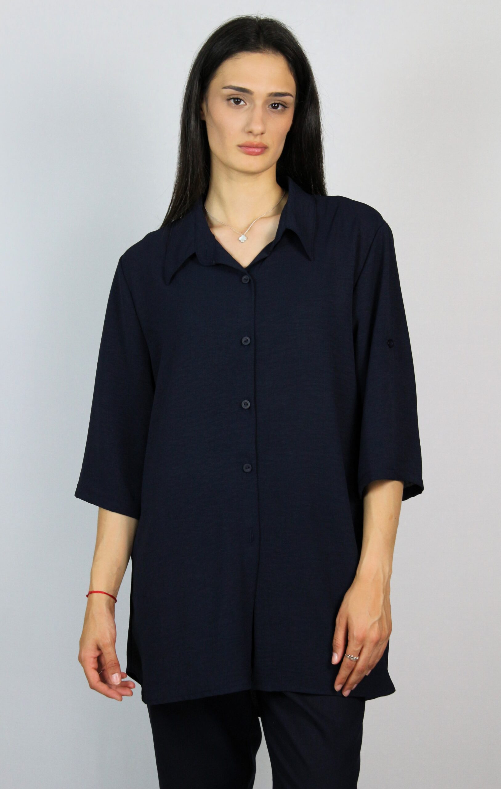 Свободно падаща риза с три четвърт ръкав, който се фиксира с копче на къс. . Закопчаване с копчета отпред.