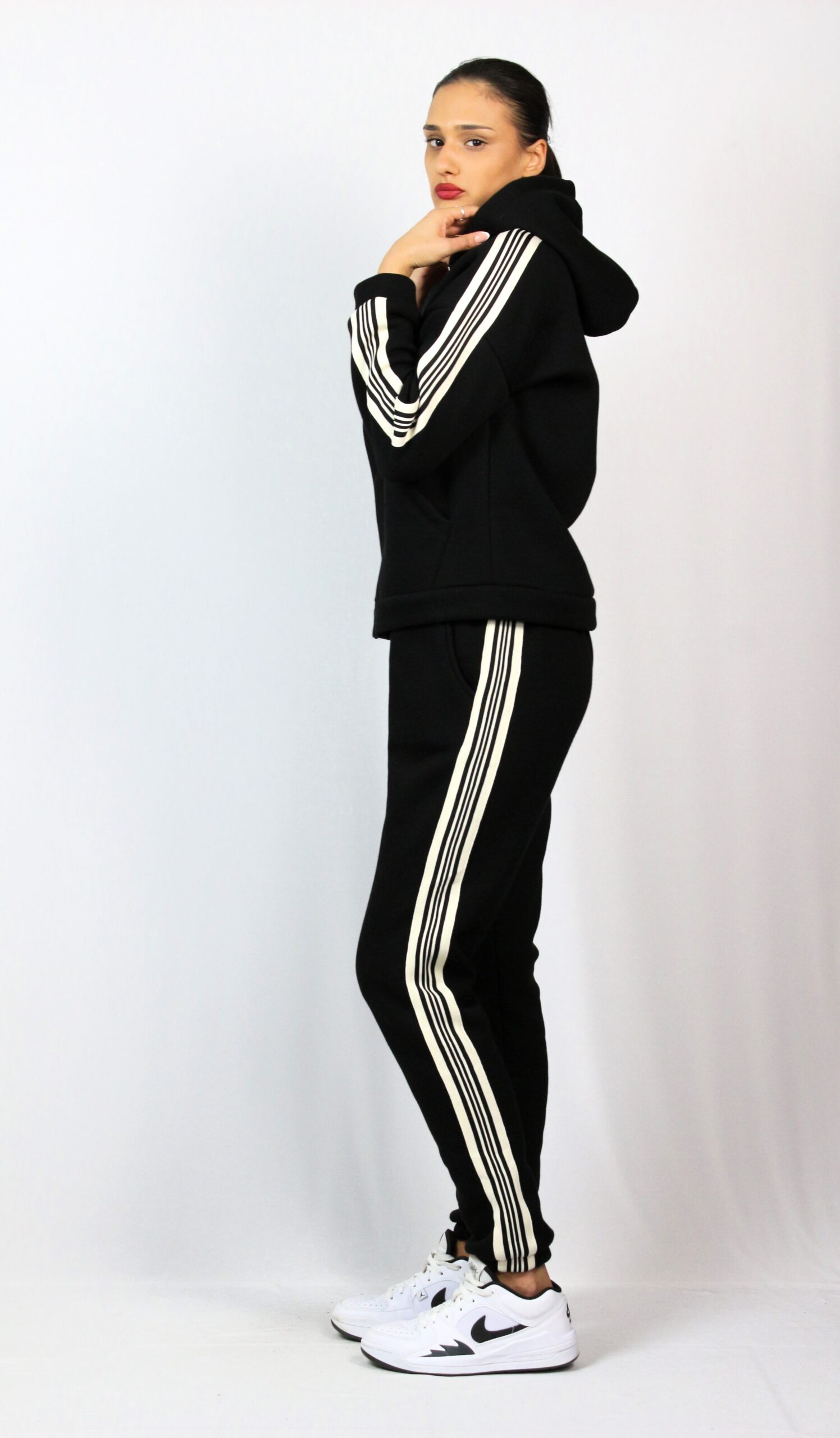 Комплект от суитшърт с качулка ,два джоба и цип. Спортен панталон с ластик на талията, и два джоба. Има украсителни ивици. Изработен от памучно трико.
