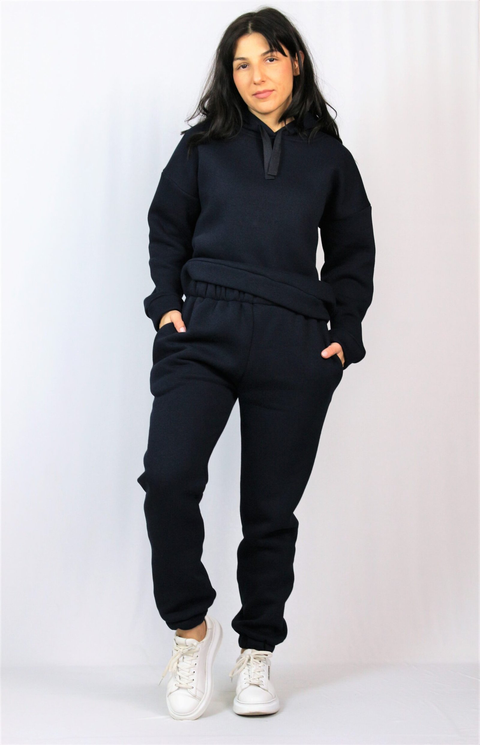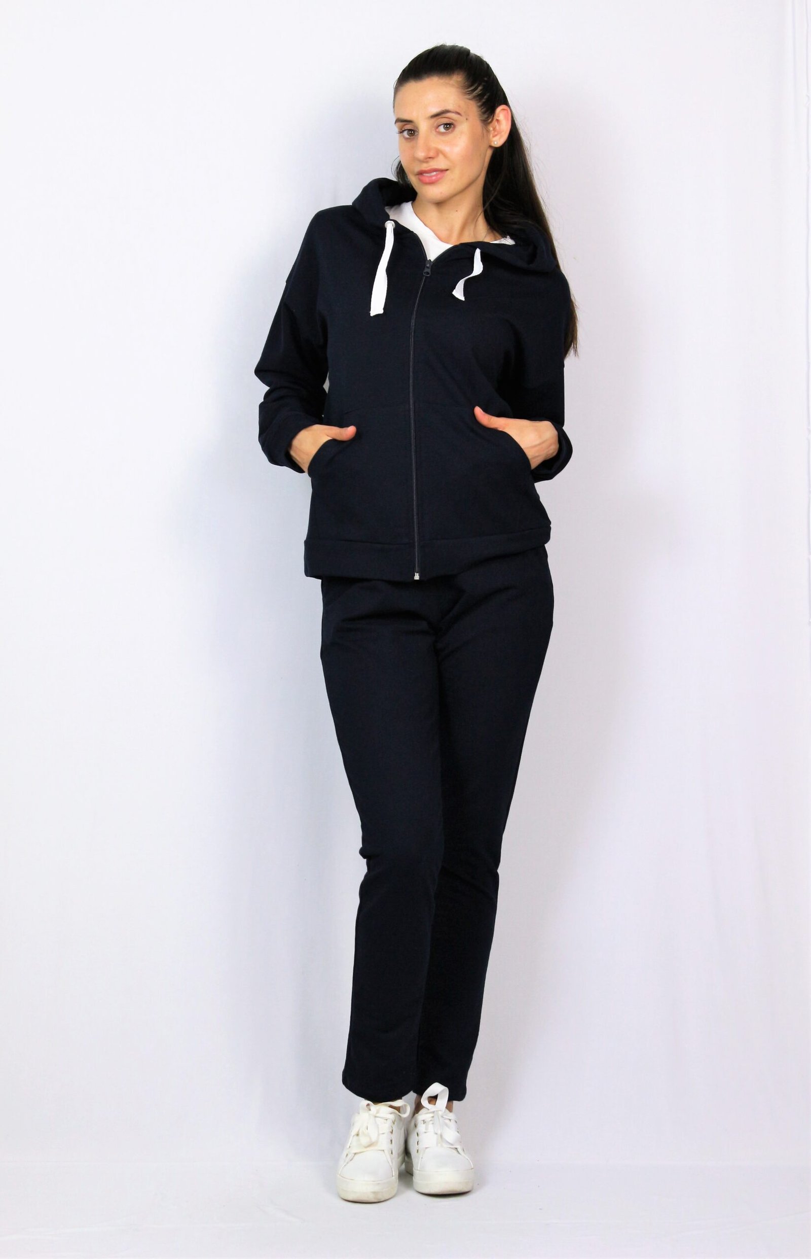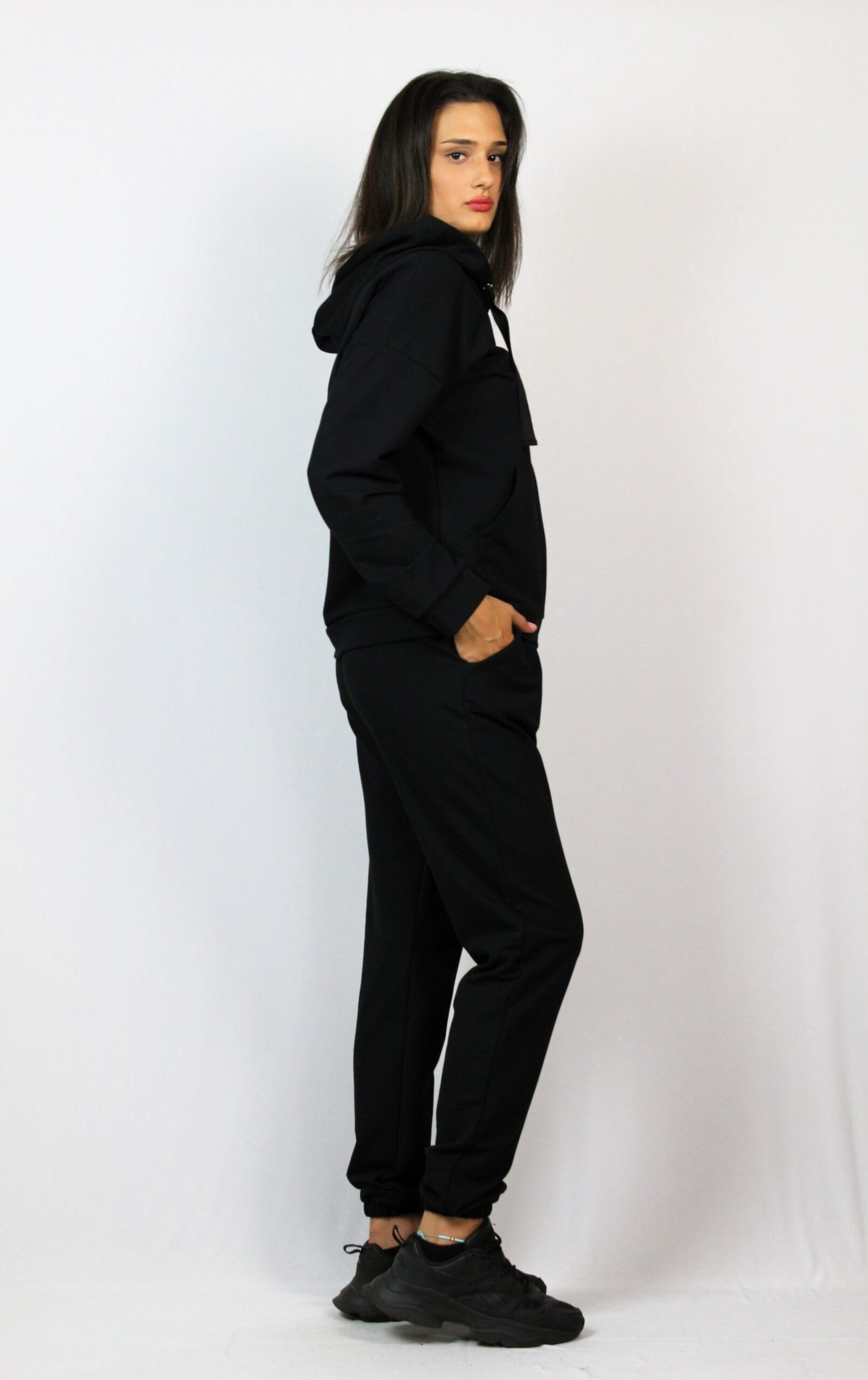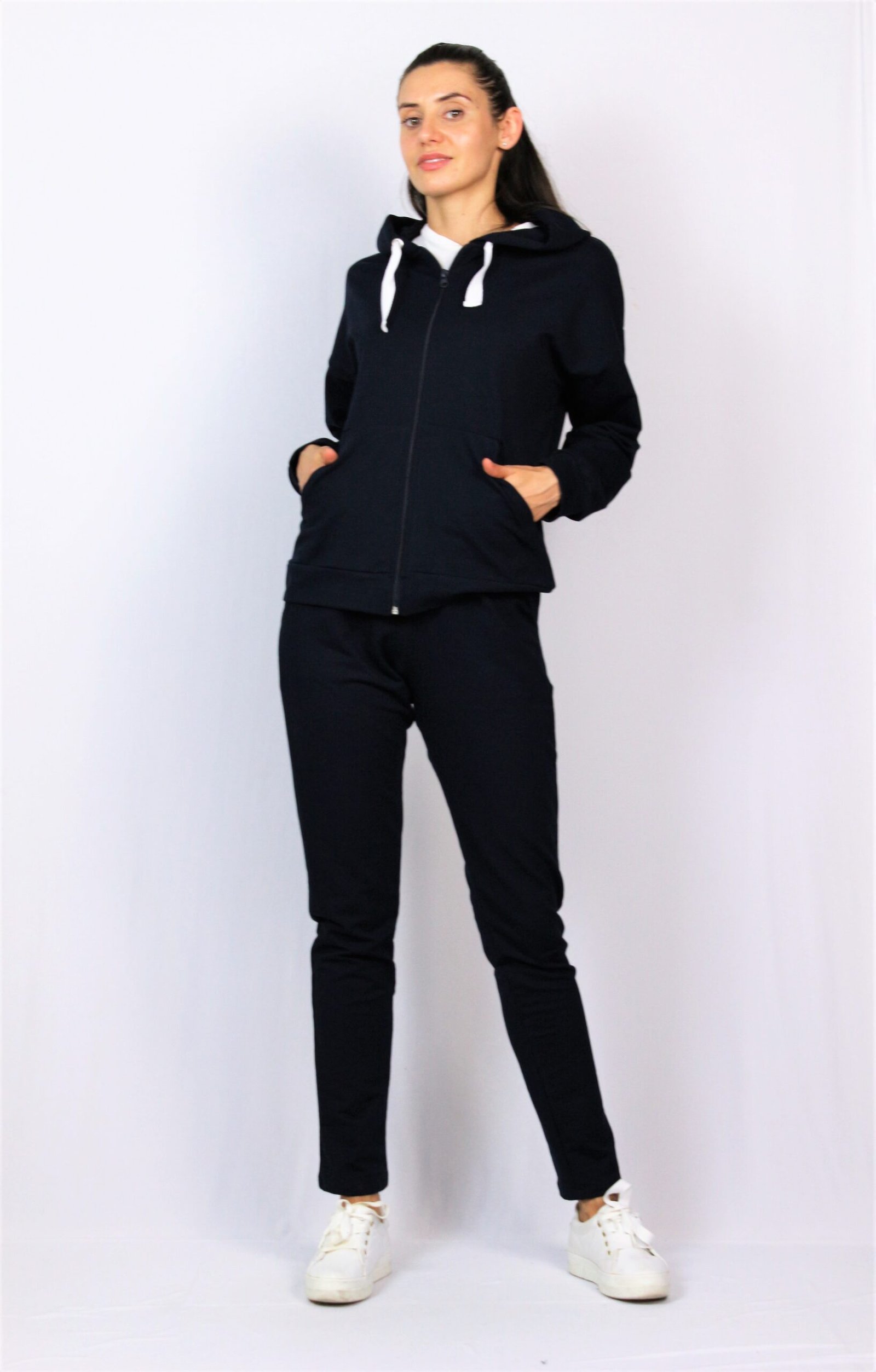 Комплект от суитшърт с качулка ,два джоба и цип. Спортен панталон с ластик на талията, памучна врйзка и два вътрешни джоба.