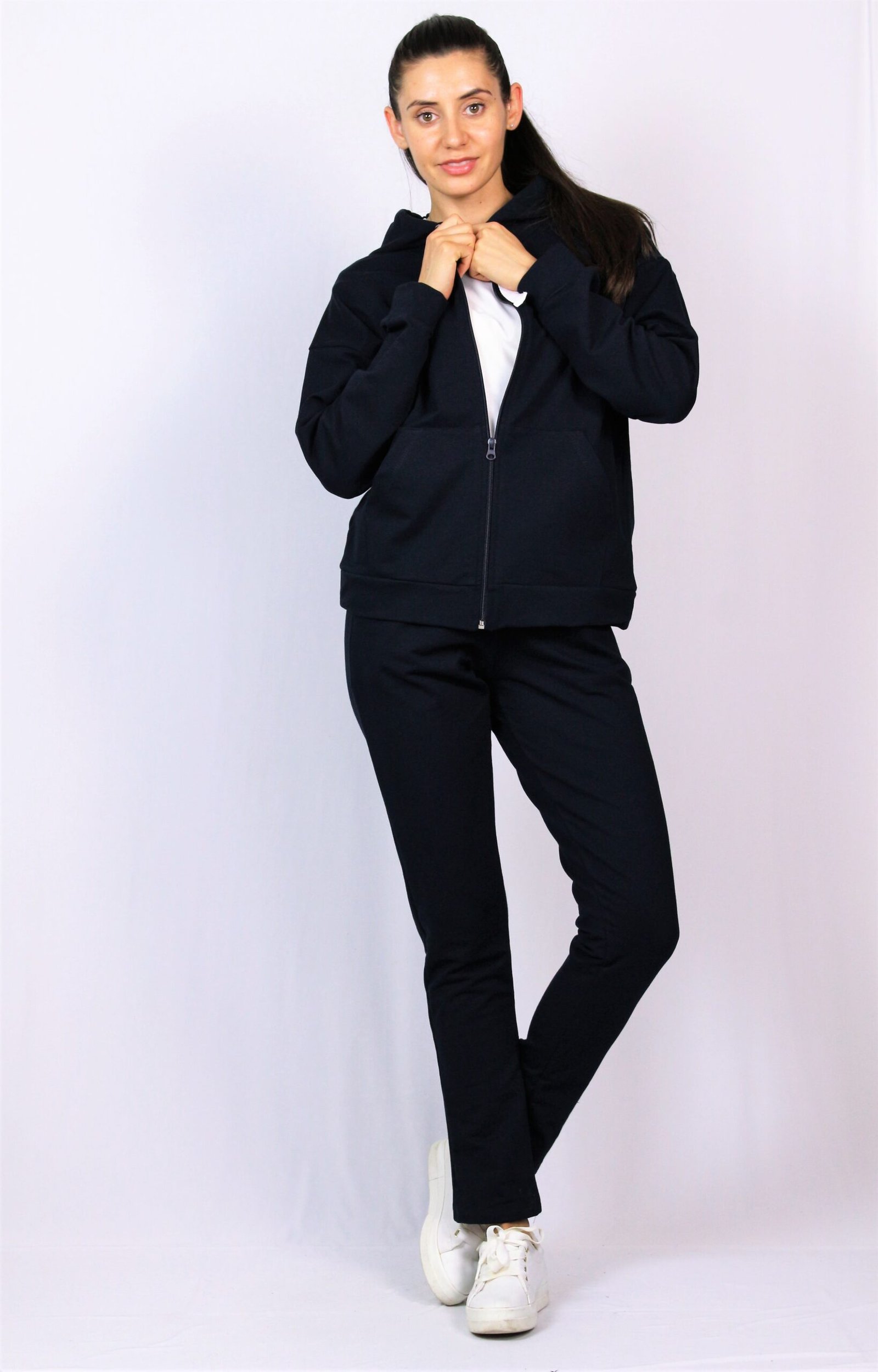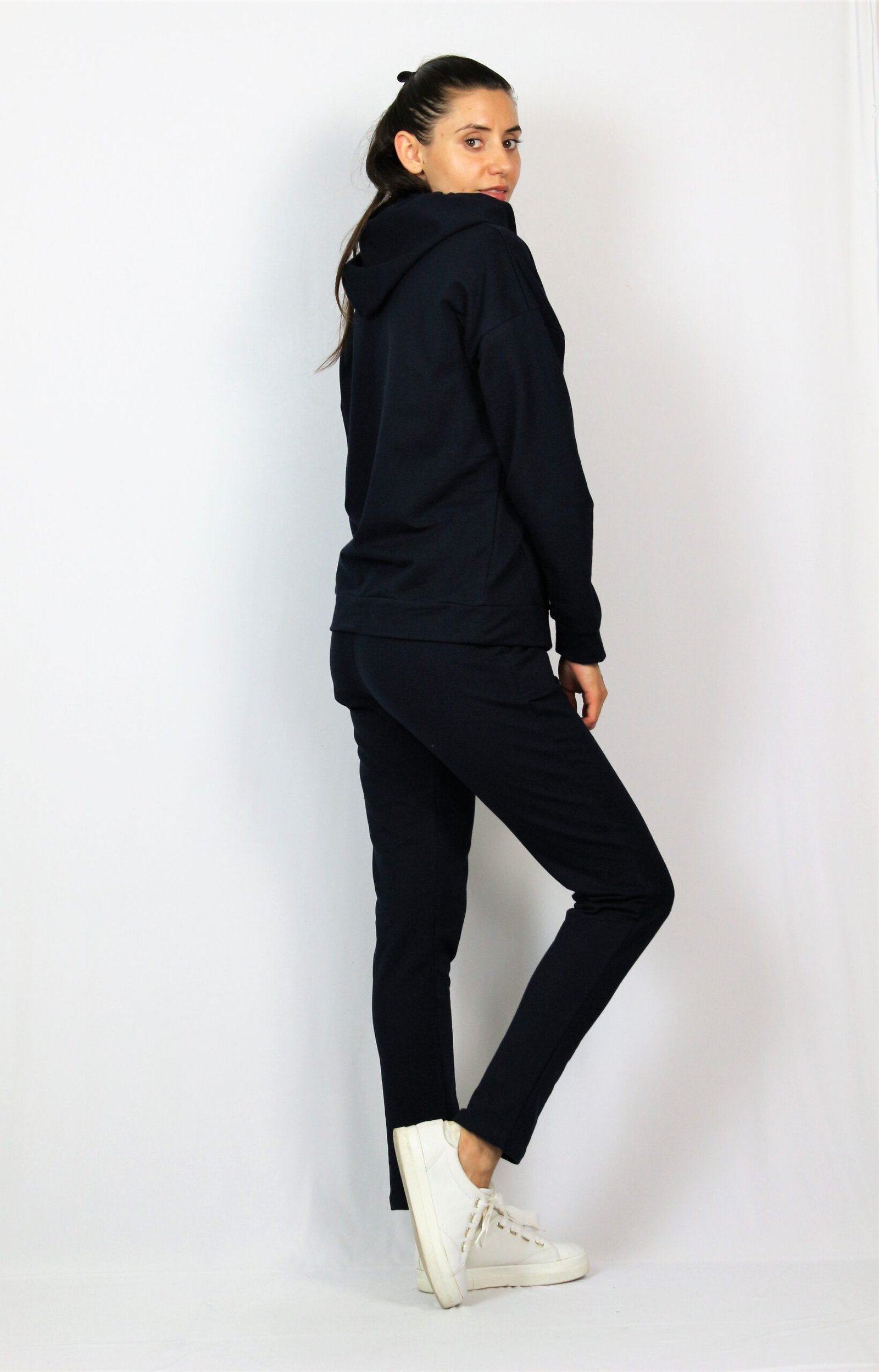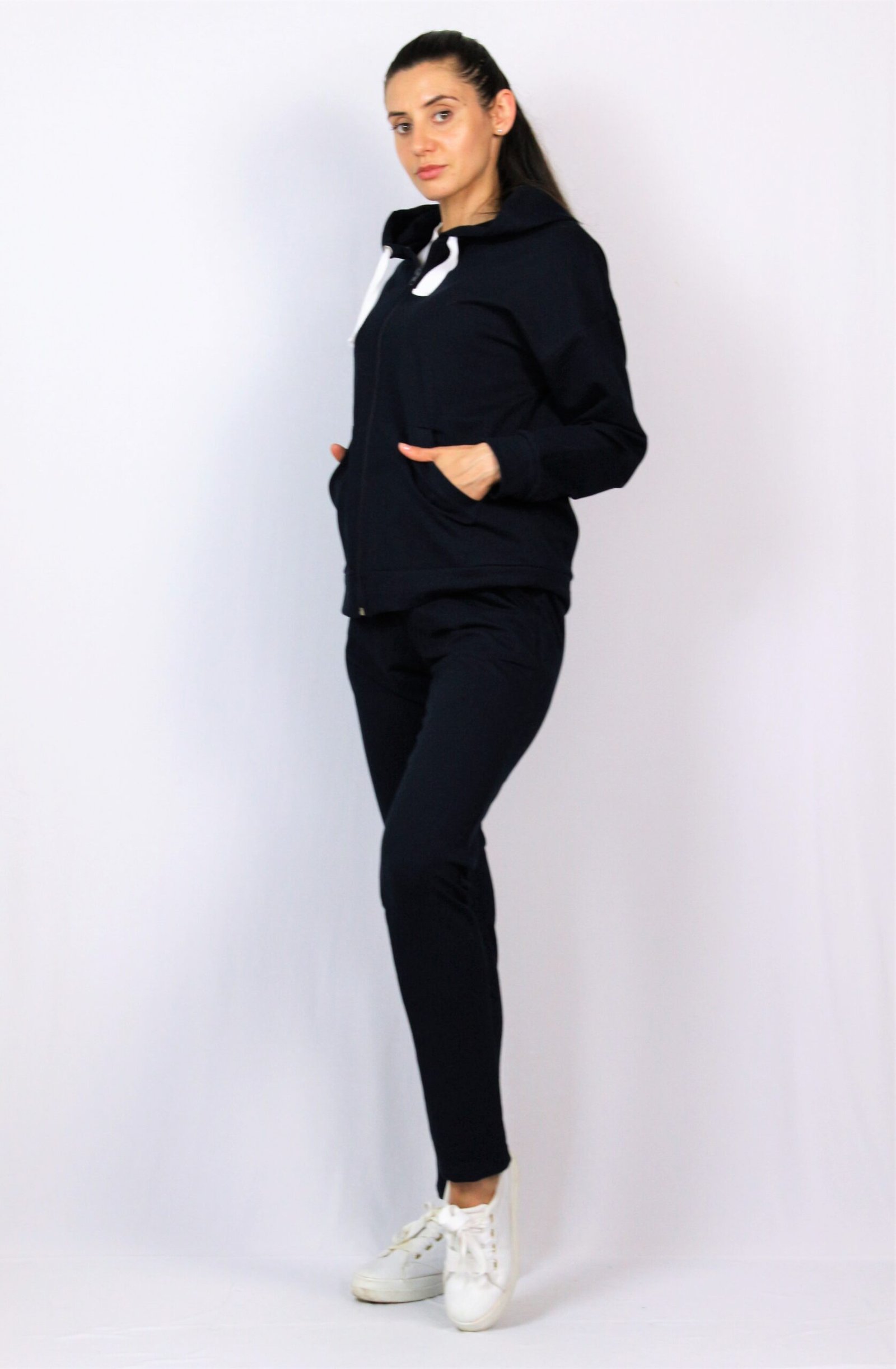 Комплект от суитшърт с качулка ,два джоба и цип. Спортен панталон с ластик на талията, памучна врйзка и два вътрешни джоба.
