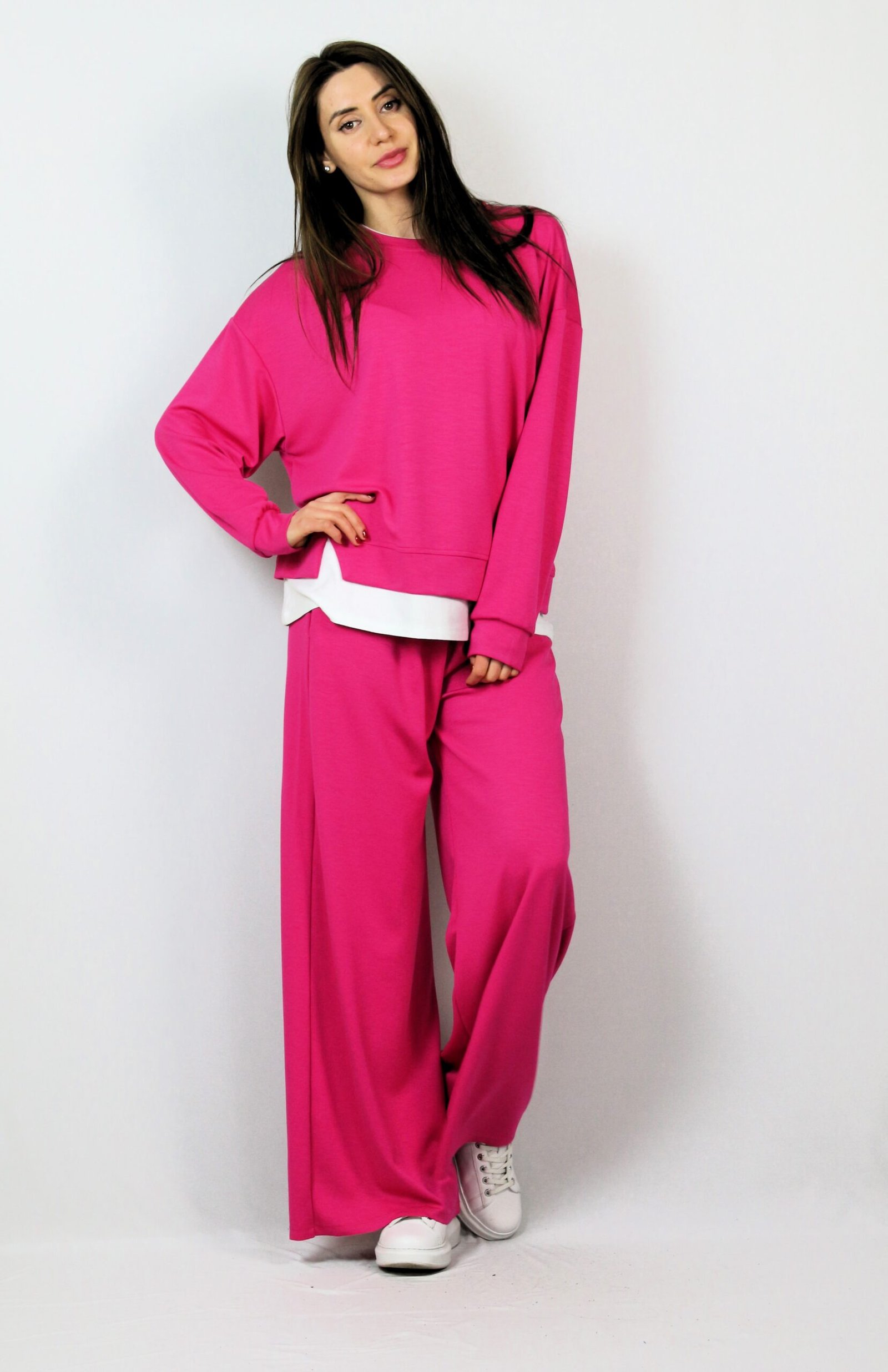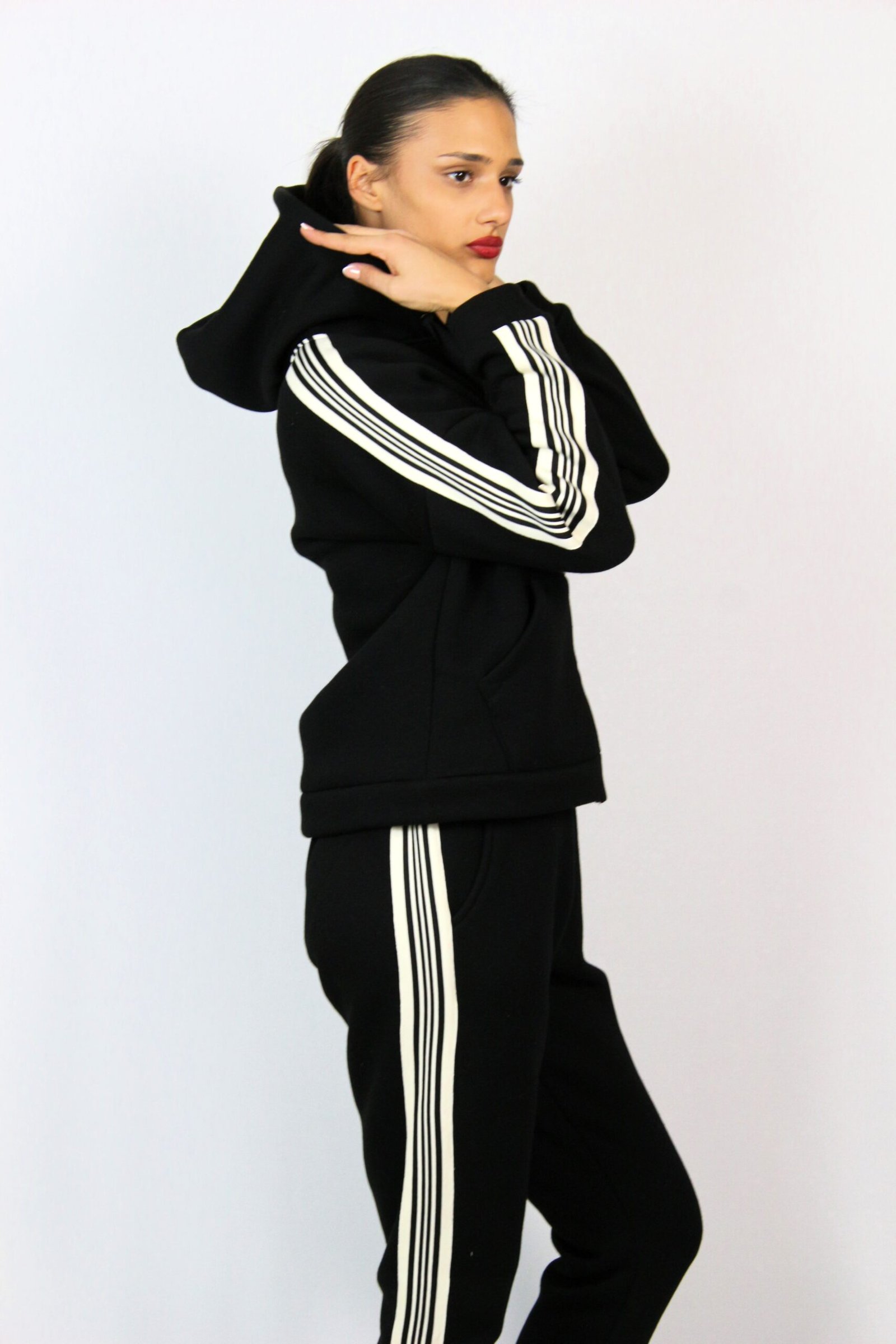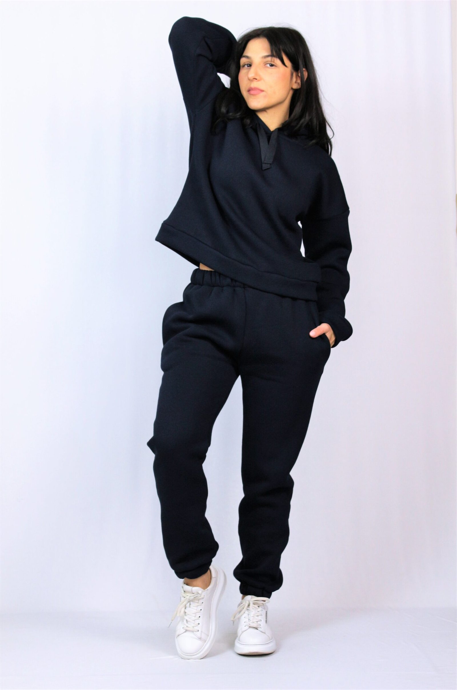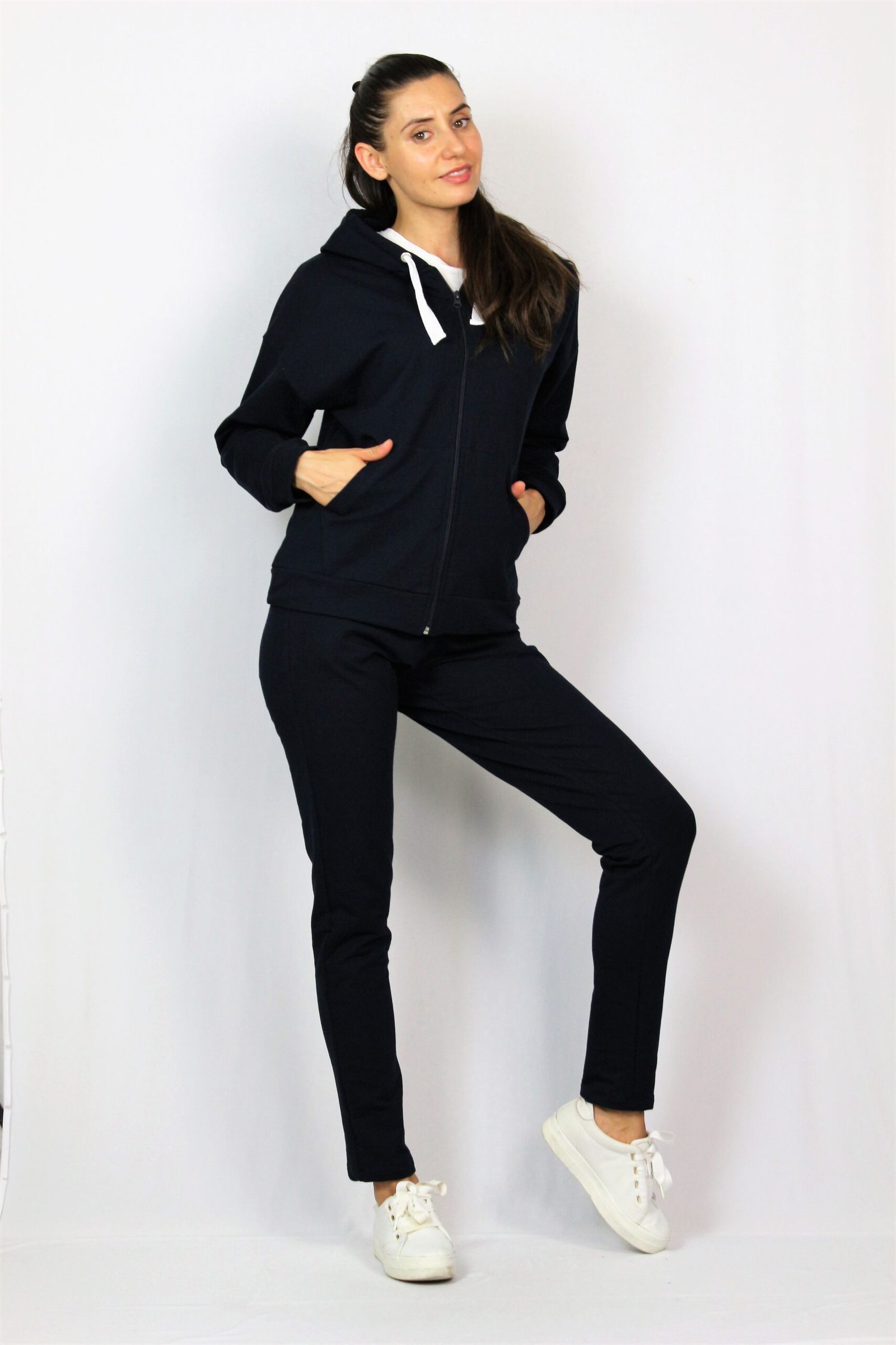 Комплект от суитшърт с качулка ,два джоба и цип. Спортен панталон с ластик на талията, памучна врйзка и два вътрешни джоба.