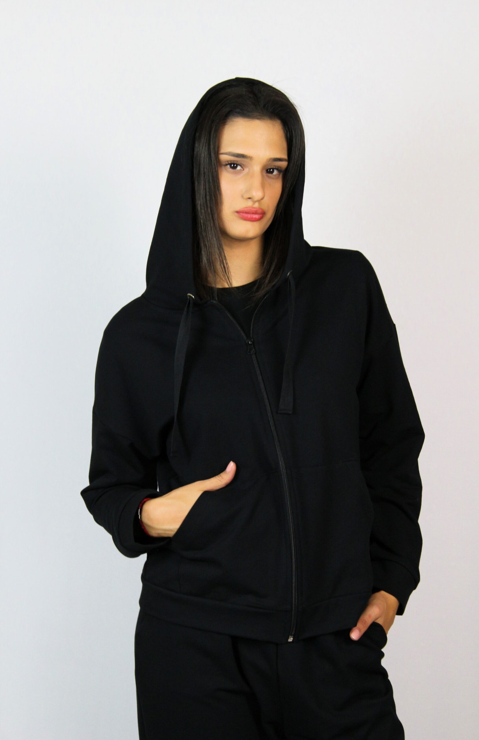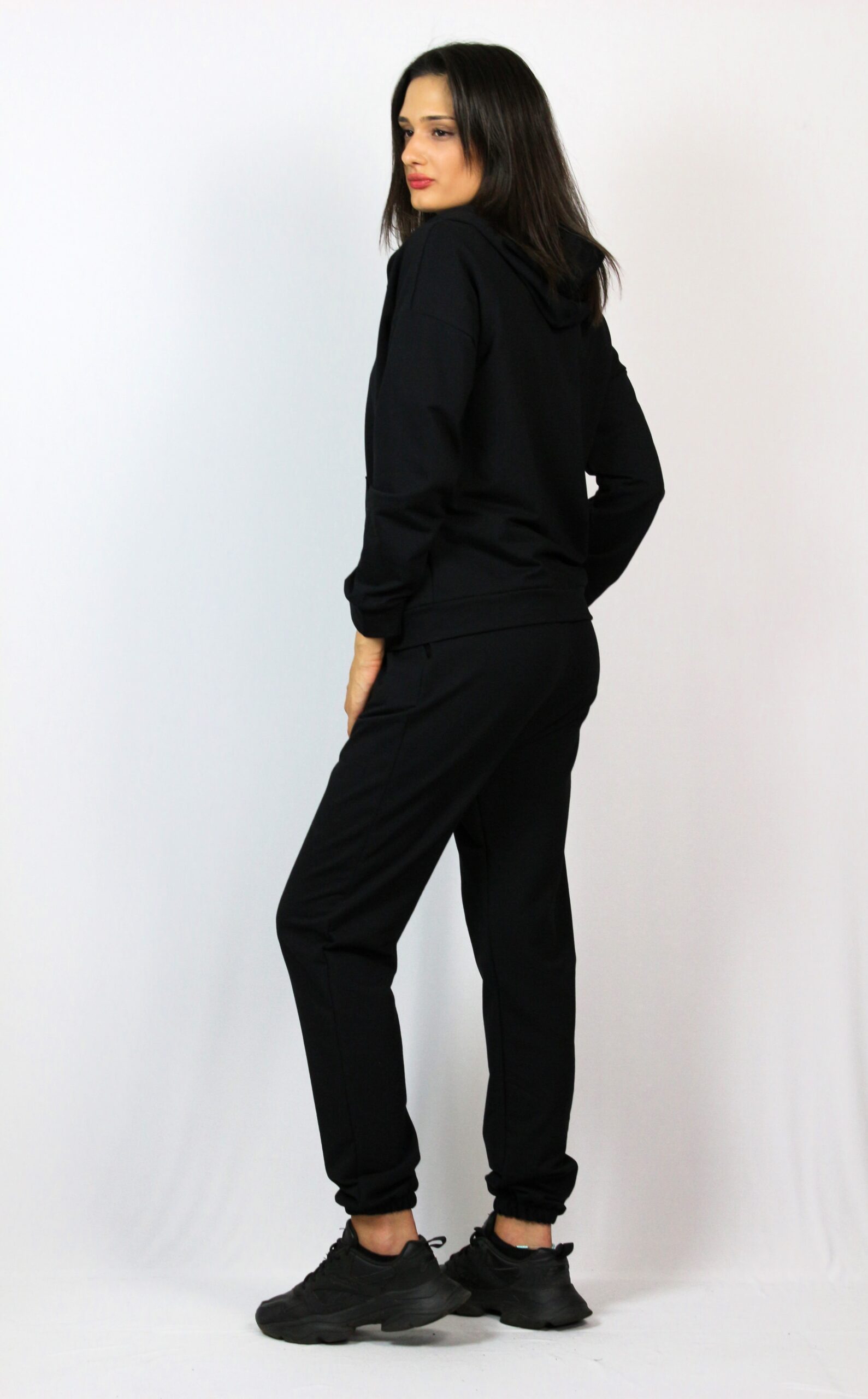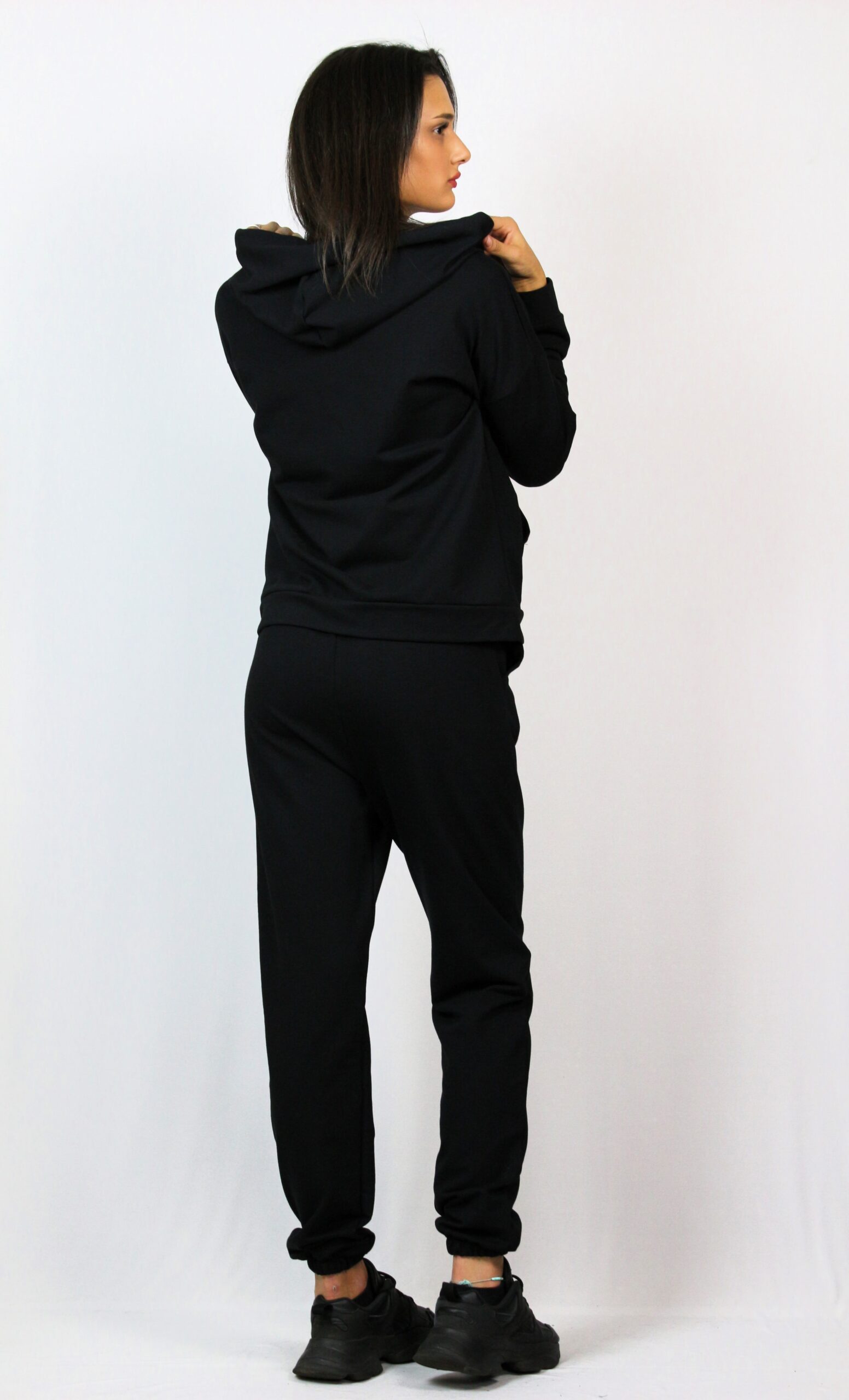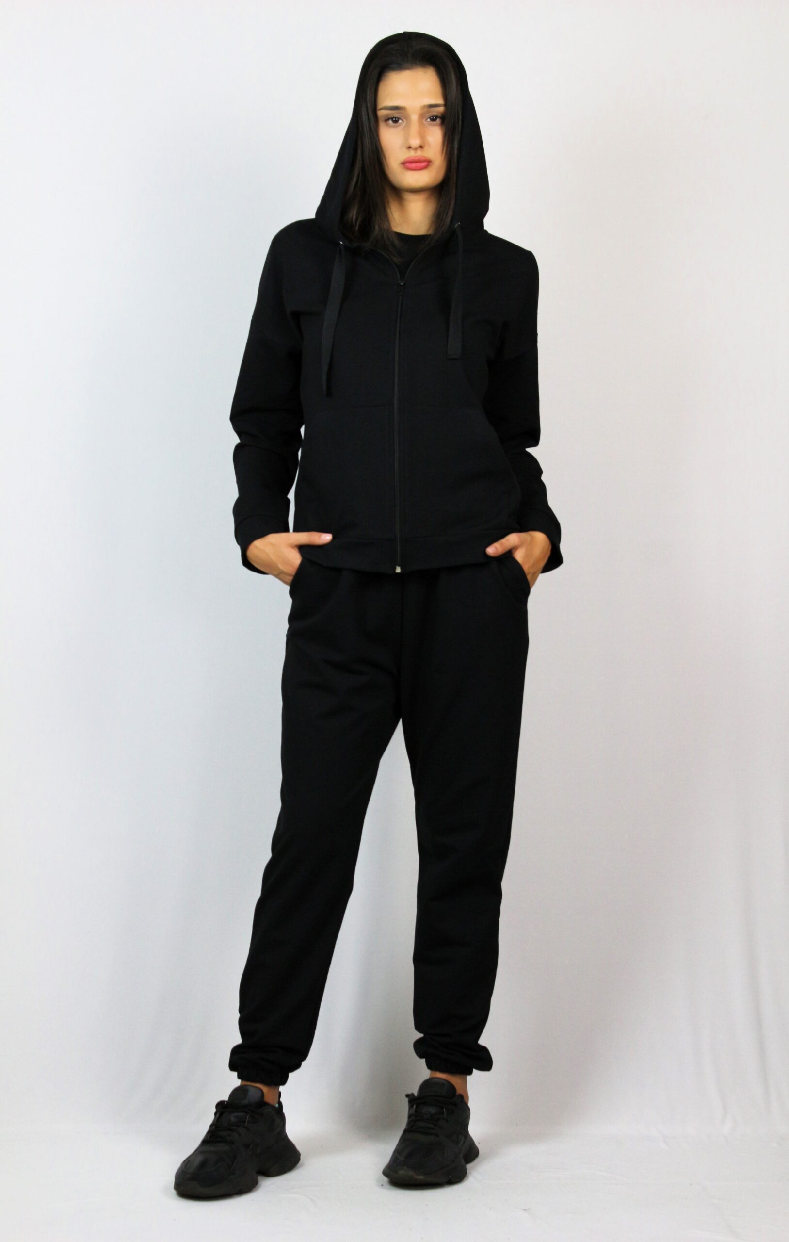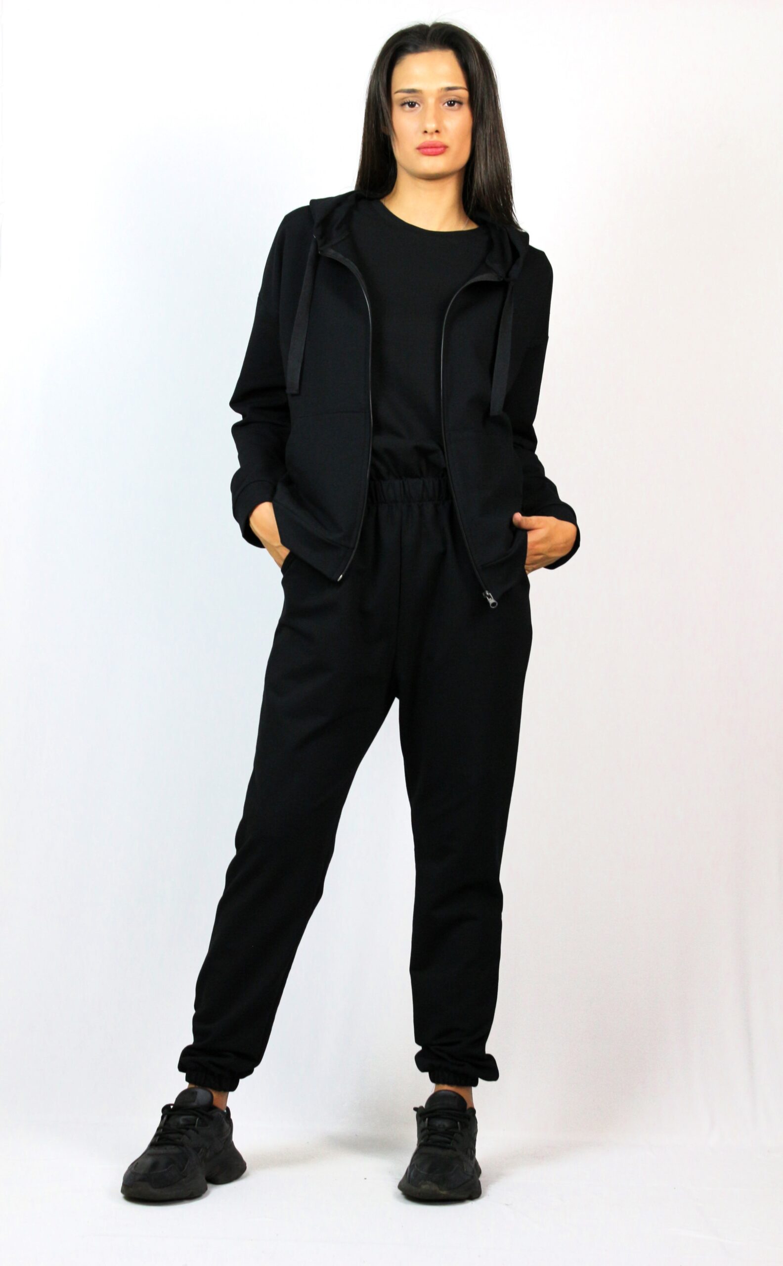 Комплект от суитшърт с качулка ,два джоба и цип. Спортен панталон с ластик на талията, и два джоба.