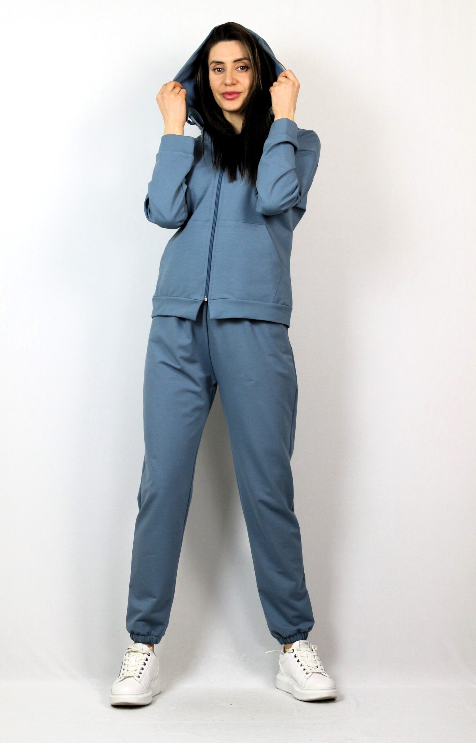 Комплект от суитшърт с качулка ,два джоба и цип. Спортен панталон с ластик на талията, и два джоба.