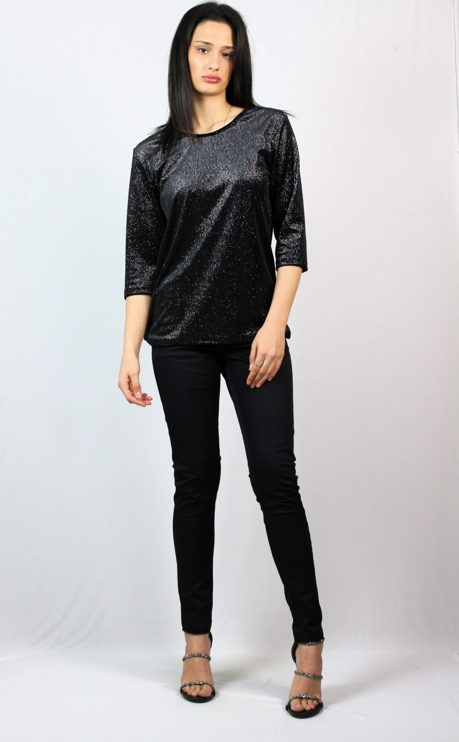 Блуза от еластично ламе с три четвърт ръкав и обло деколте .