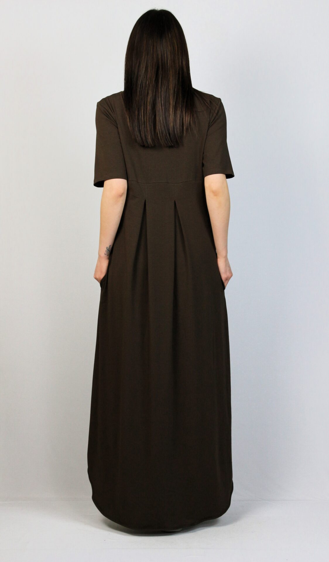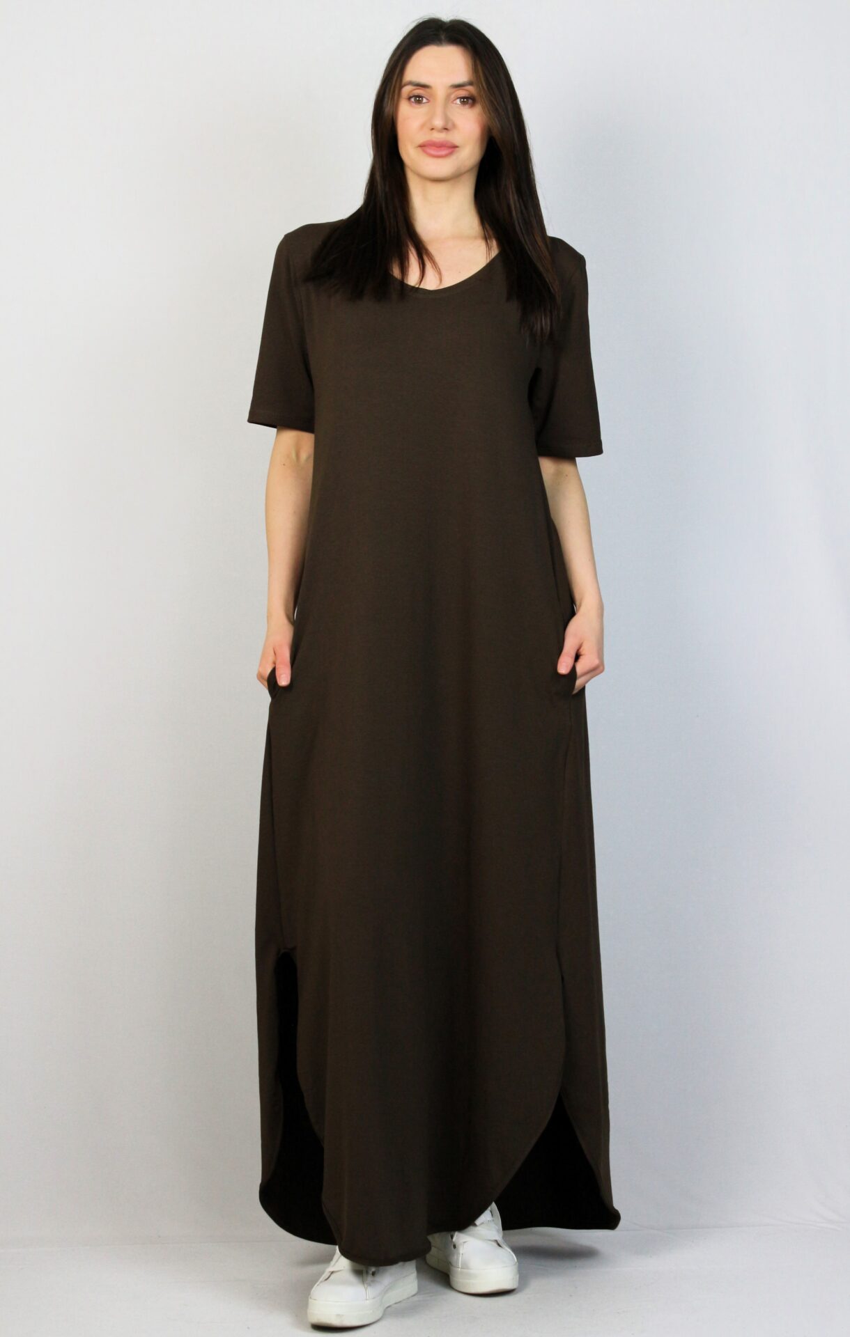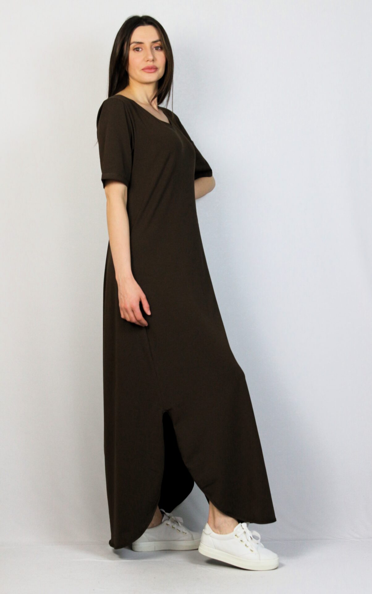 Рокля с къс ръкав, вътрешни джобове и две заоблени цепки отстрани. На гърба има платка с две плохи .Изработена е от памучно трико 95% памук и 5% еластан.