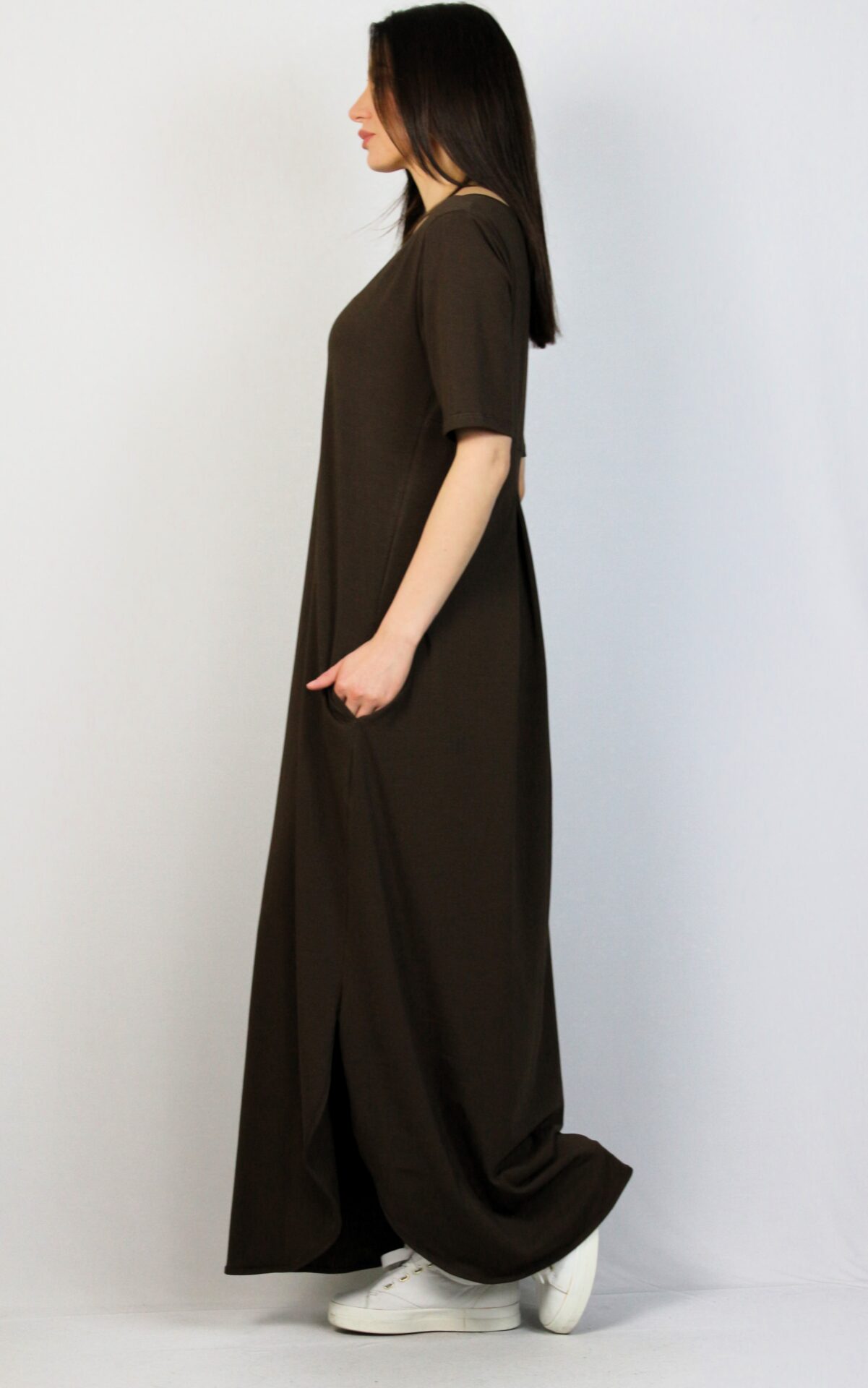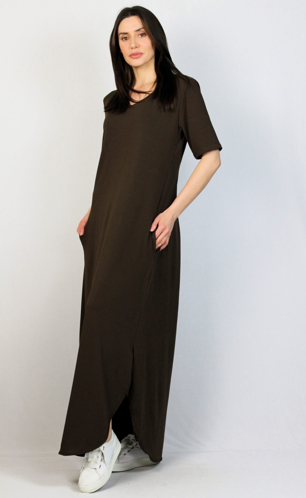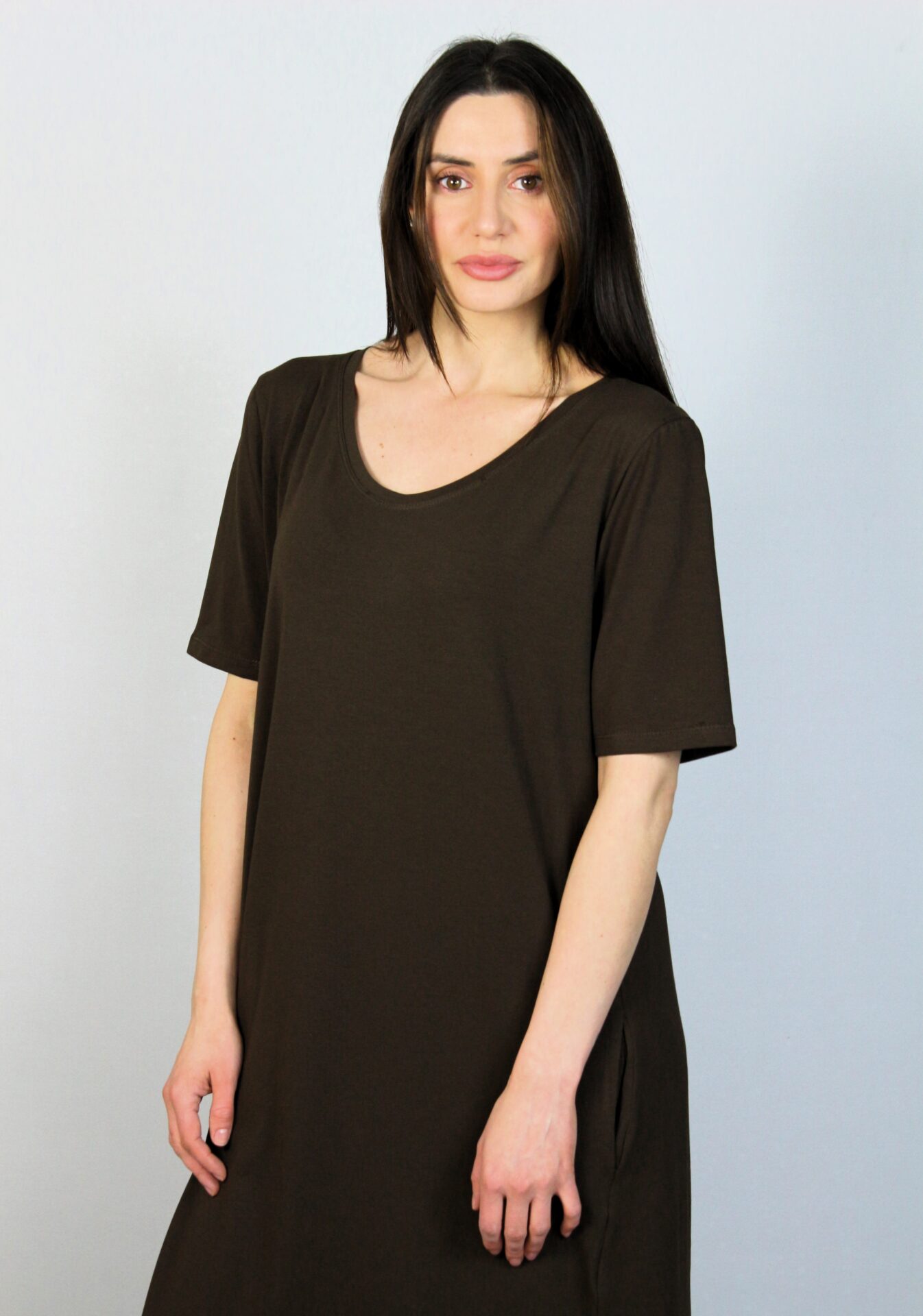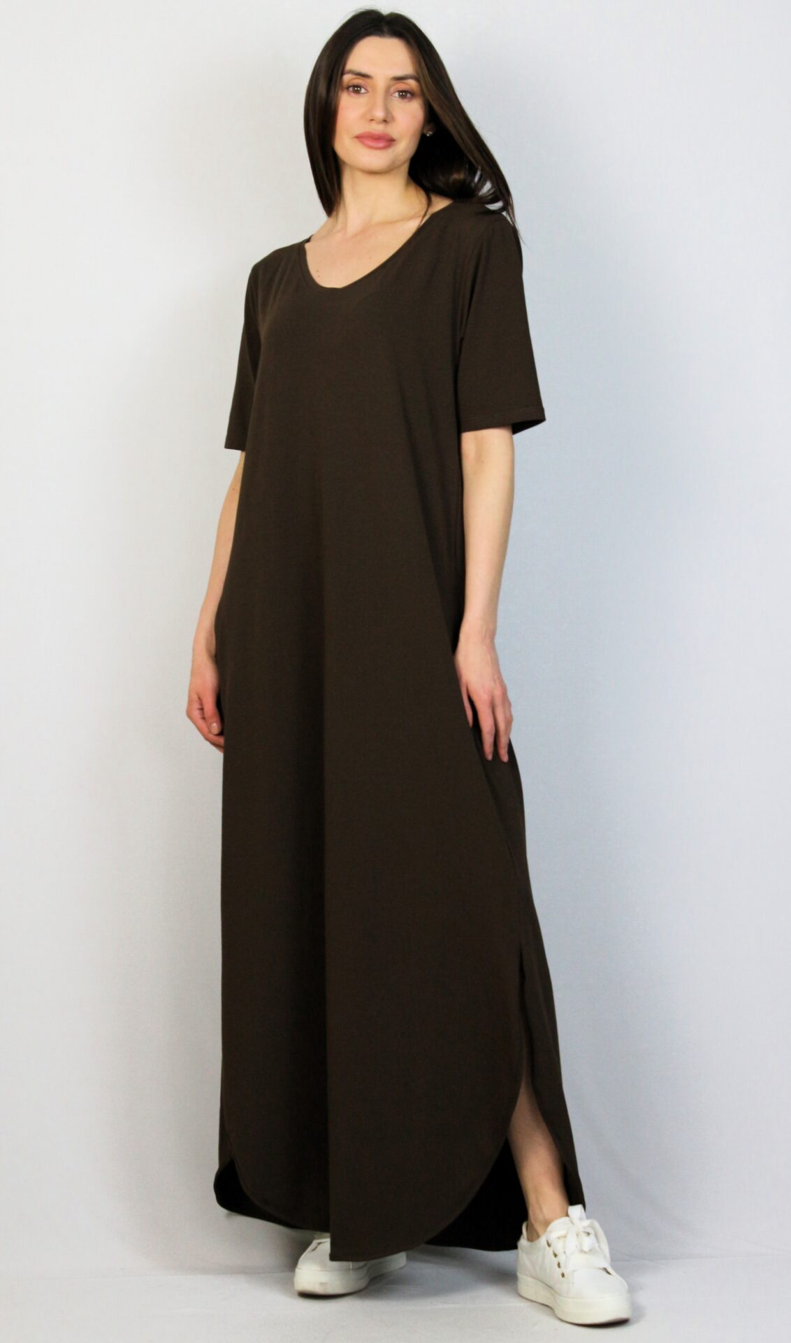 Рокля с къс ръкав, вътрешни джобове и две заоблени цепки отстрани. На гърба има платка с две плохи .Изработена е от памучно трико 95% памук и 5% еластан.