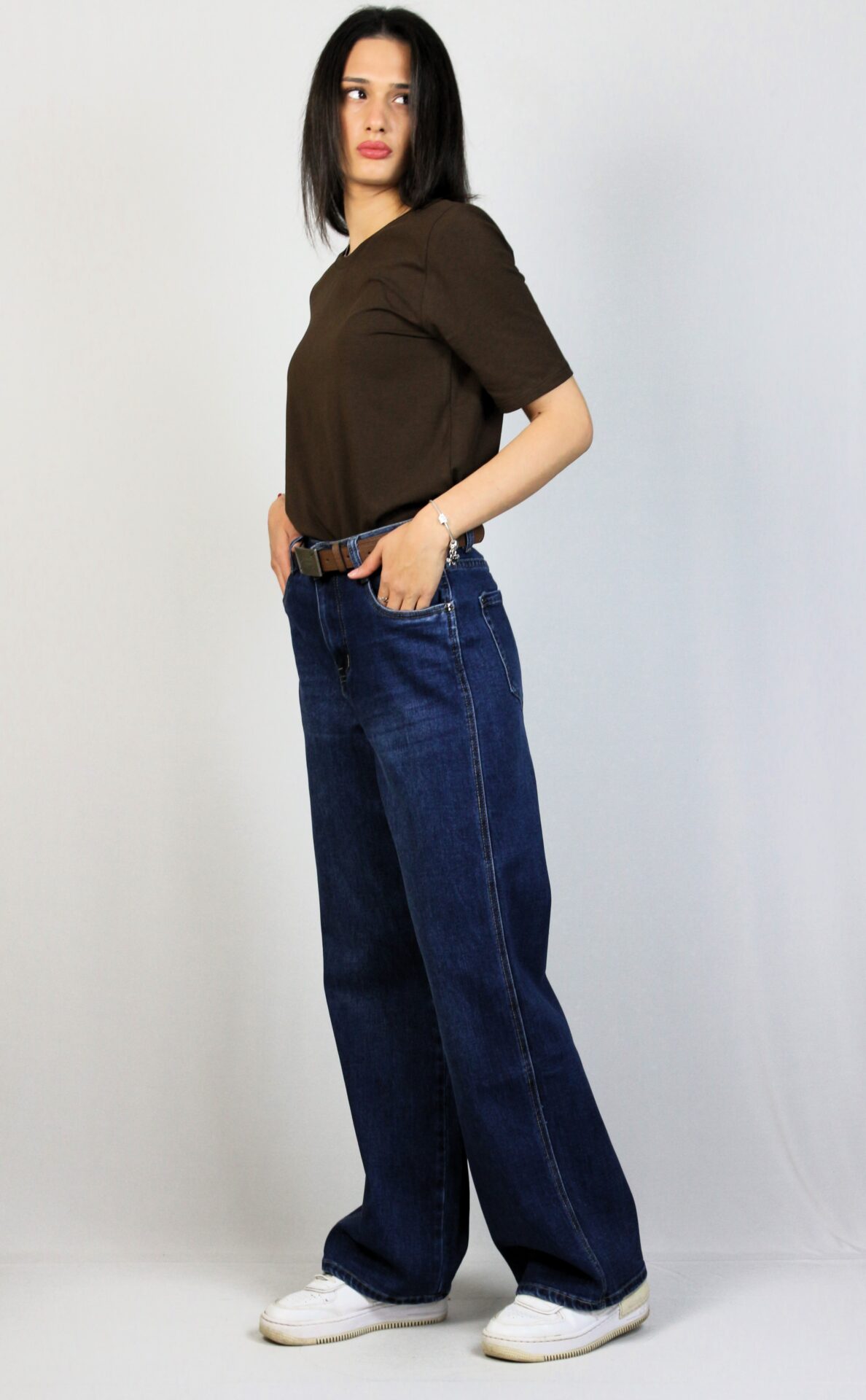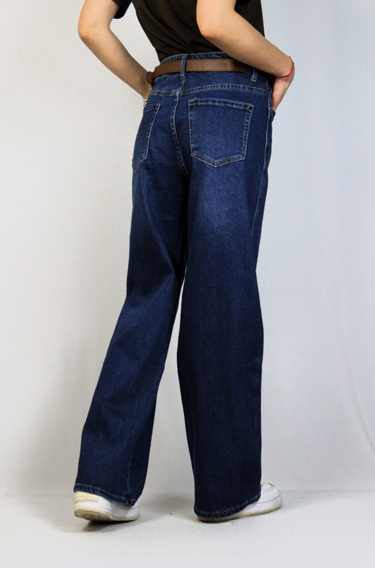 Дънки с леки ефекти от еластична тъкан за повече удобство . Модел с пет джоба. Закопчаване с цип и метално копче отпред.Имат допълнителен колан.
