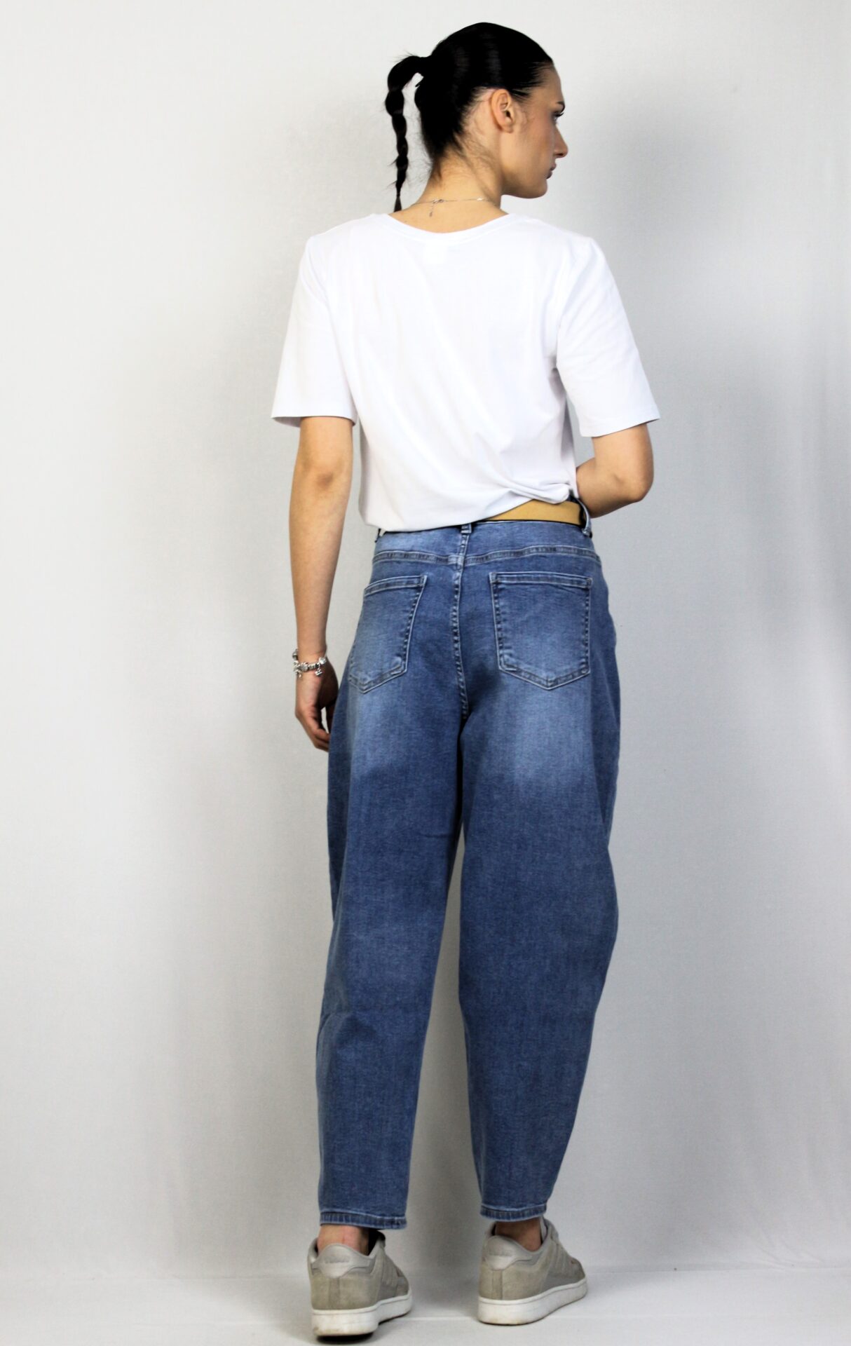 Дънки с леки ефекти от еластична тъкан за повече удобство . Модел с пет джоба. Закопчаване с цип и метално копче отпред.Имат допълнителен колан.