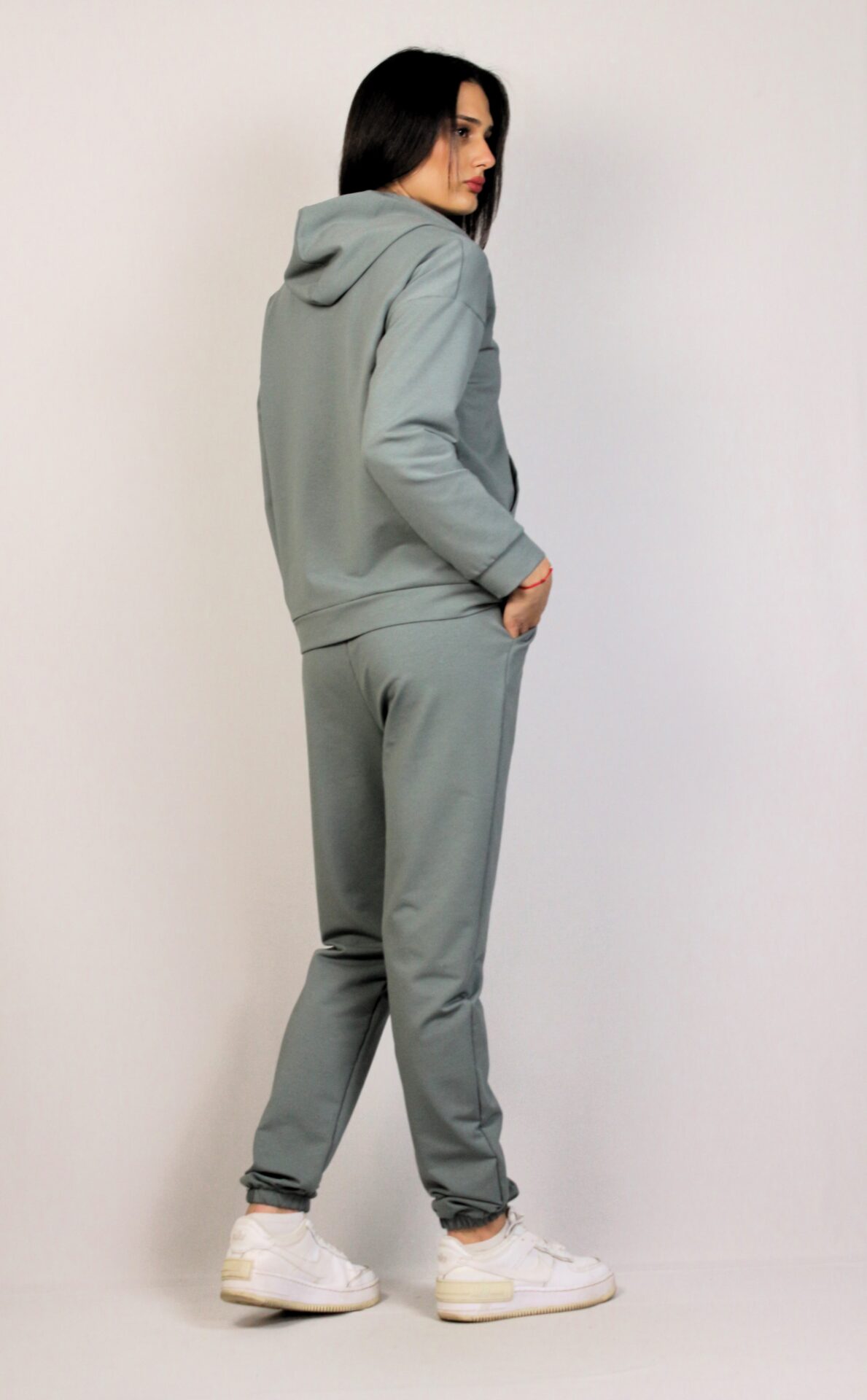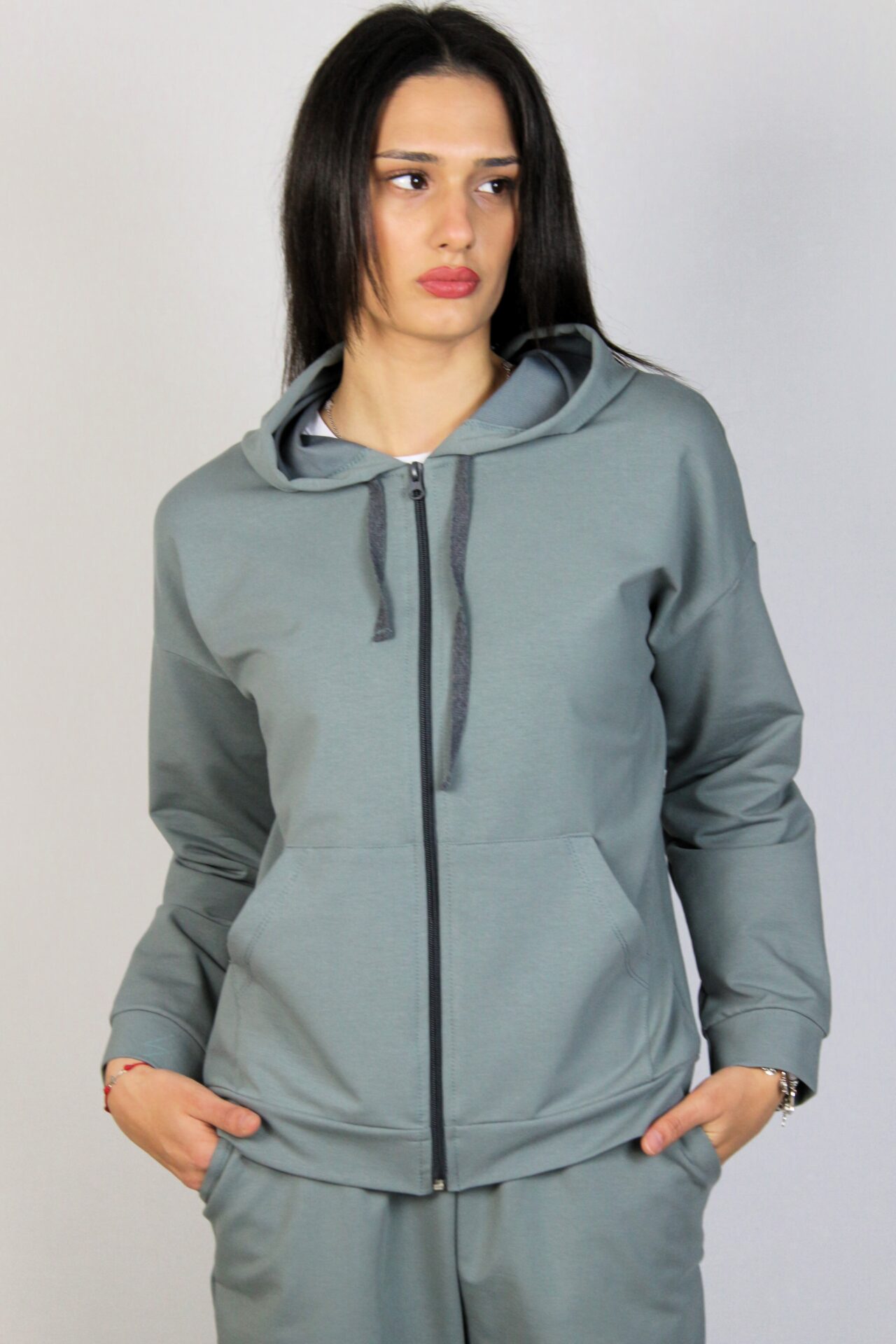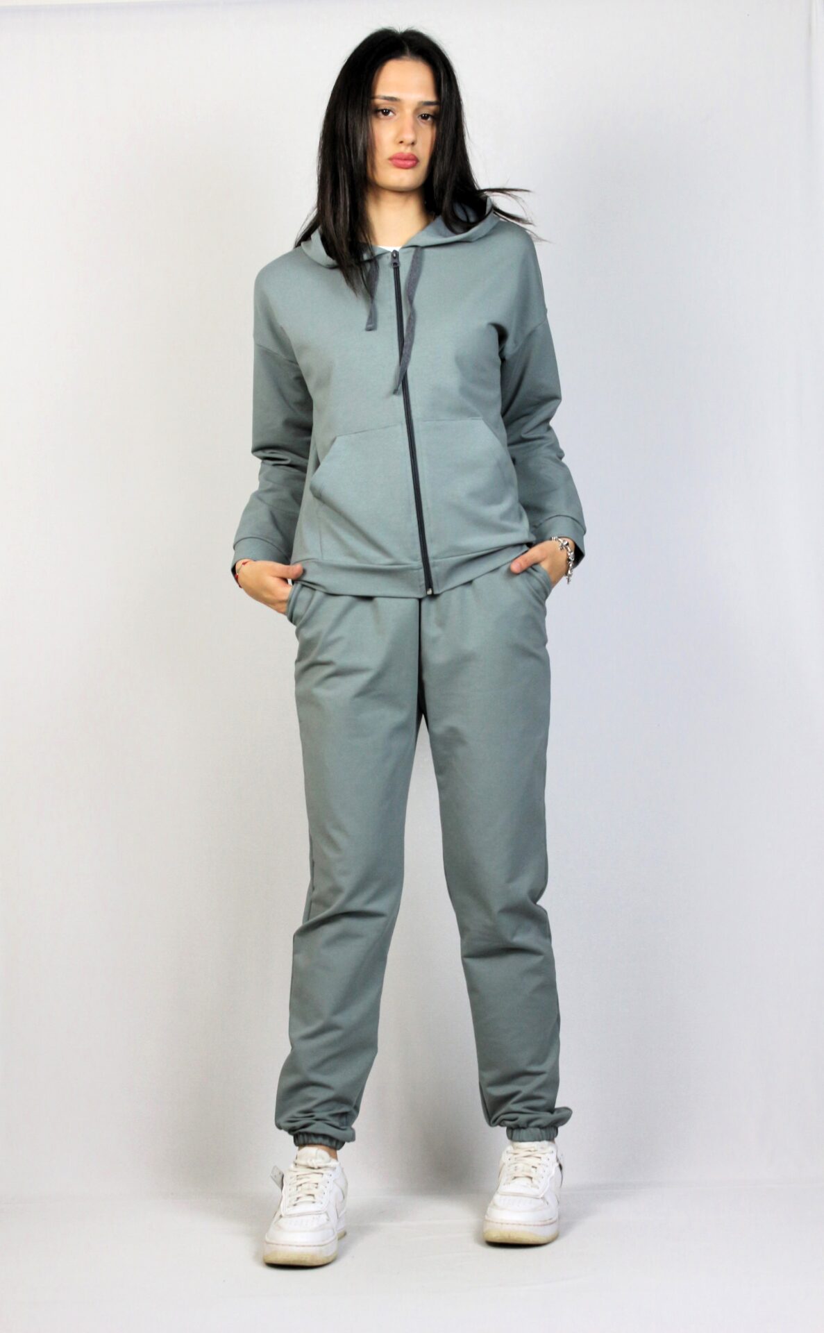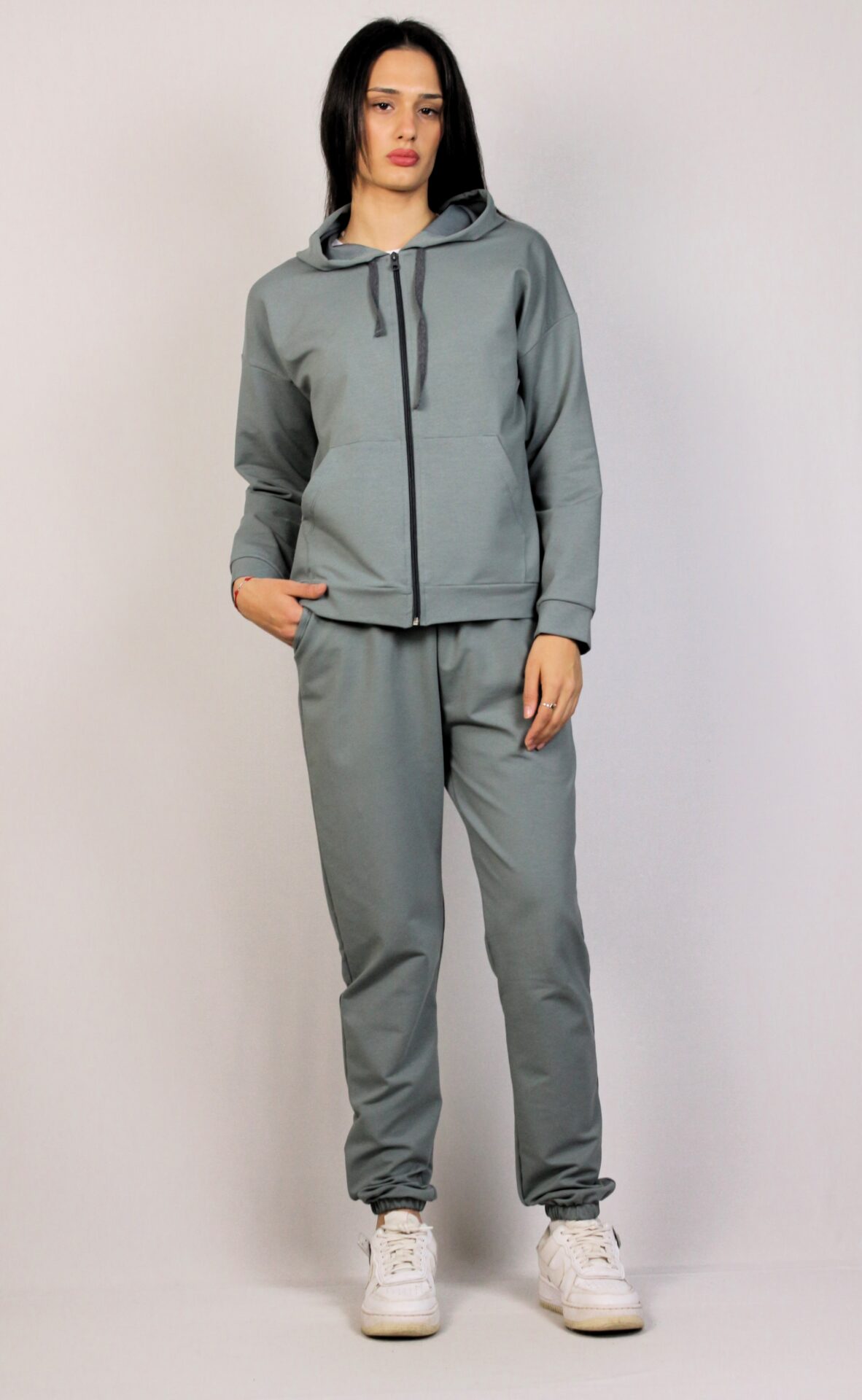 Комплект от суитшърт с качулка ,два джоба и цип. Спортен панталон с ластик на талията, и два джоба.