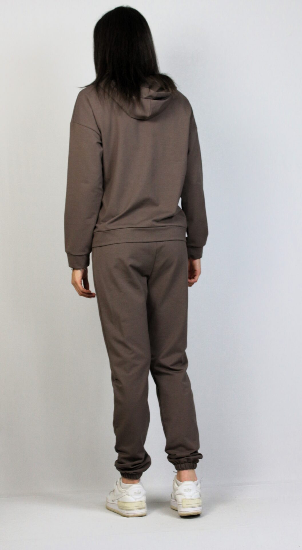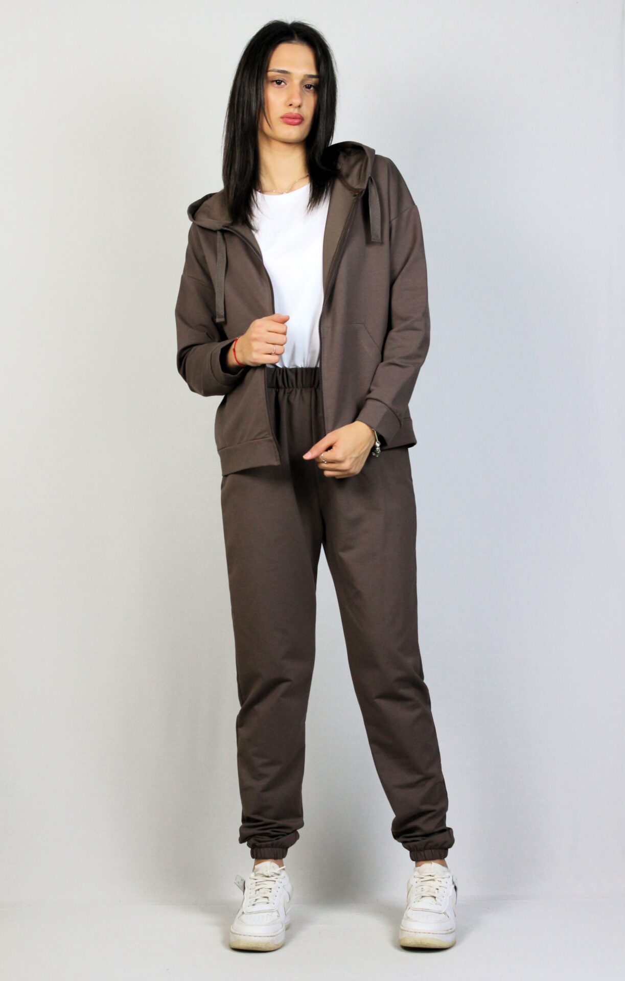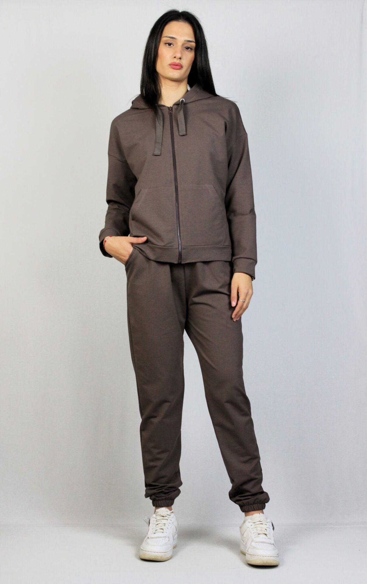 Комплект от суитшърт с качулка ,два джоба и цип. Спортен панталон с ластик на талията, и два джоба.