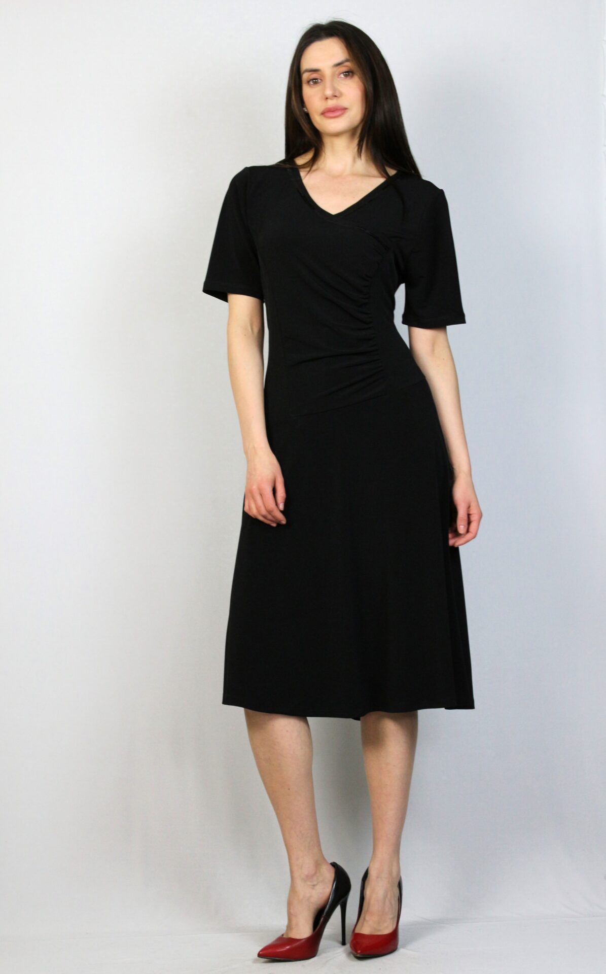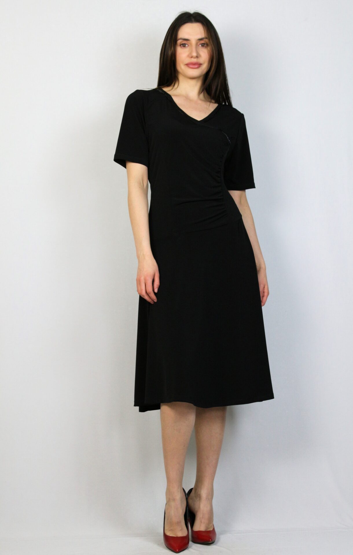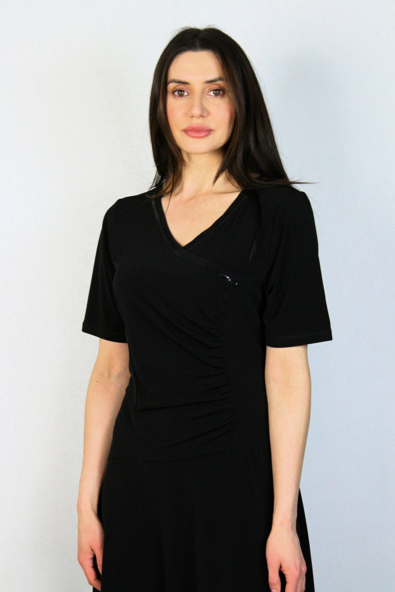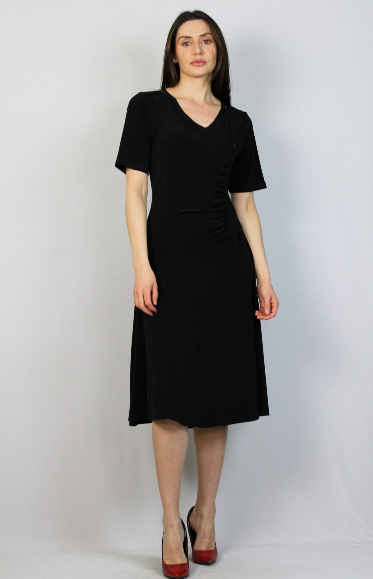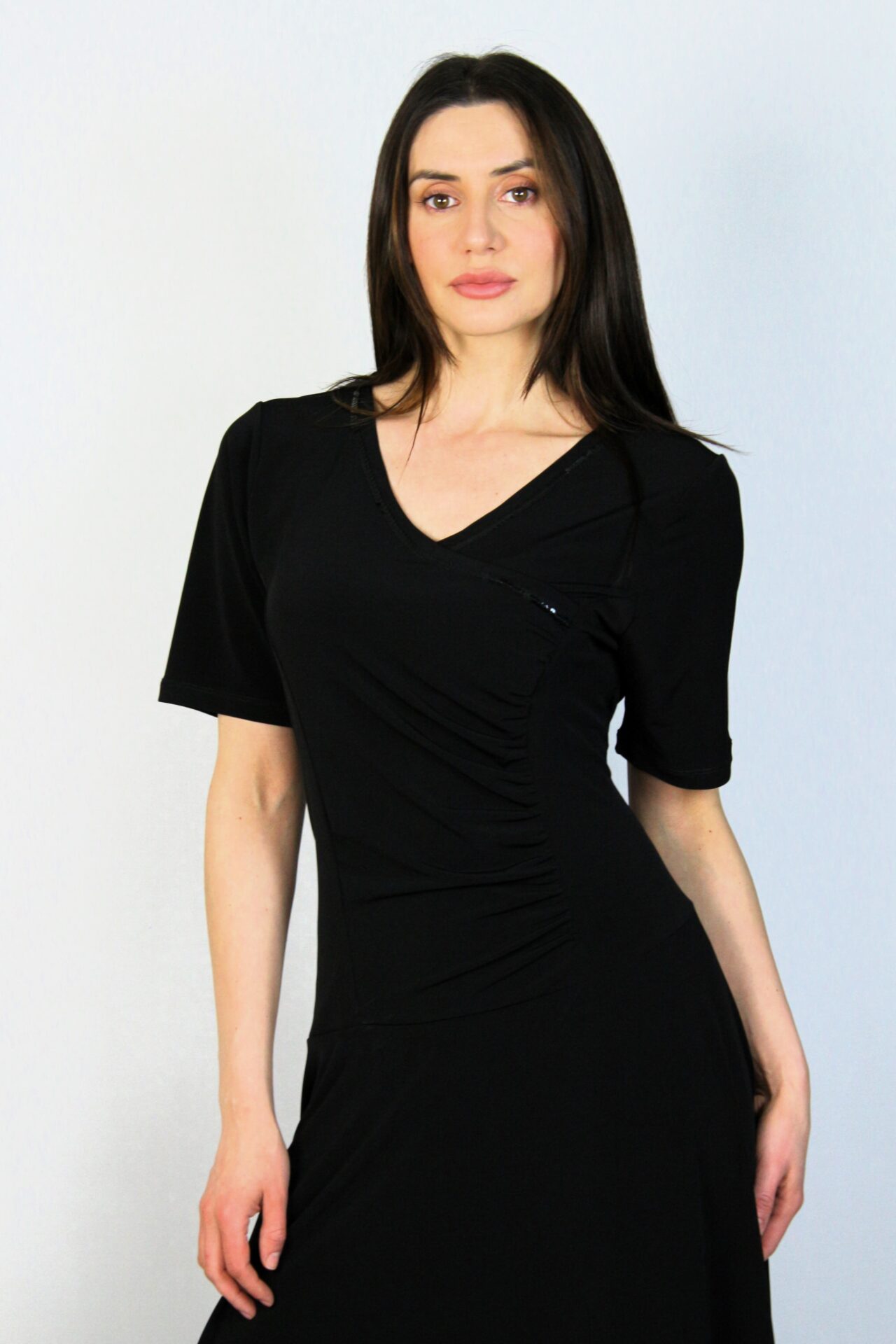 Елеантна рокля с прехвърляни предници с набор ,с разкроена долна част и къс ръкав.На деколтето има паетена лента.