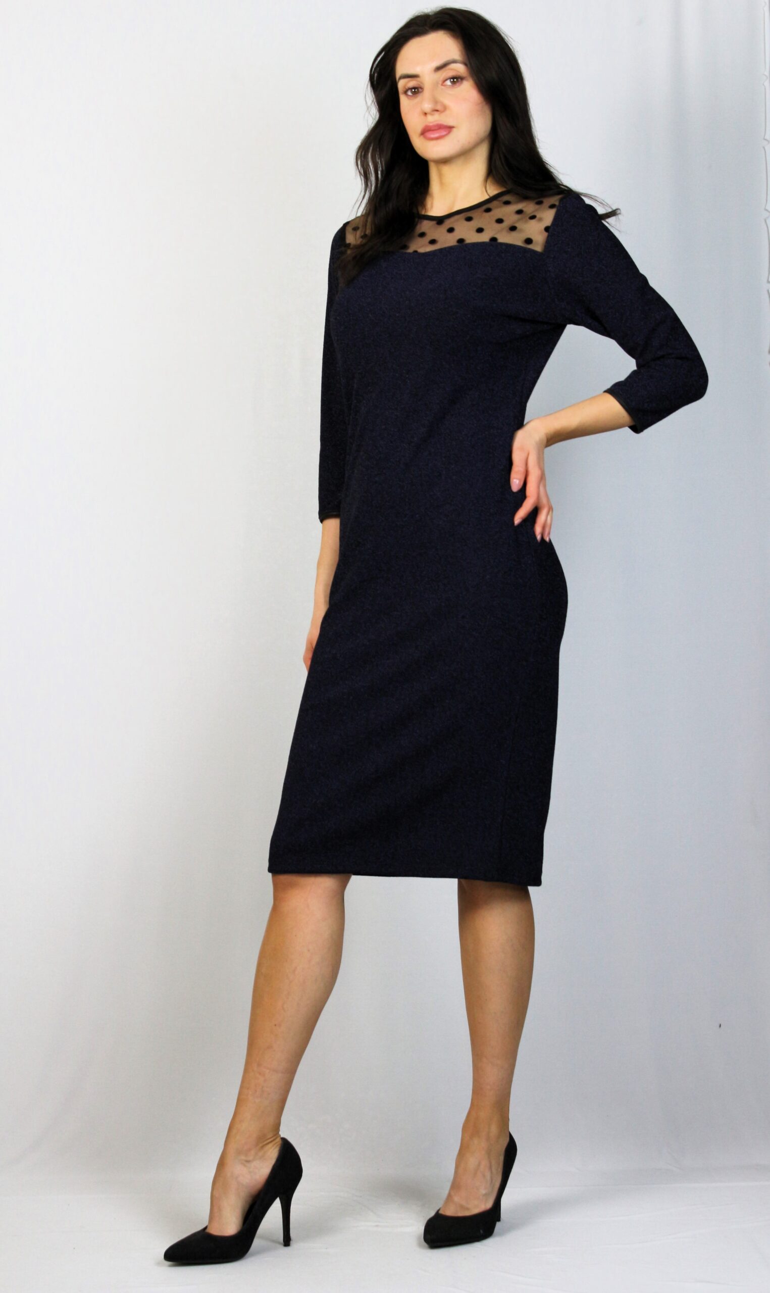 Права рокля с тюлена платки и три-четвърт ръкав. Изработена от еластичен плат – полиестер с еластан с лека лъскавина.