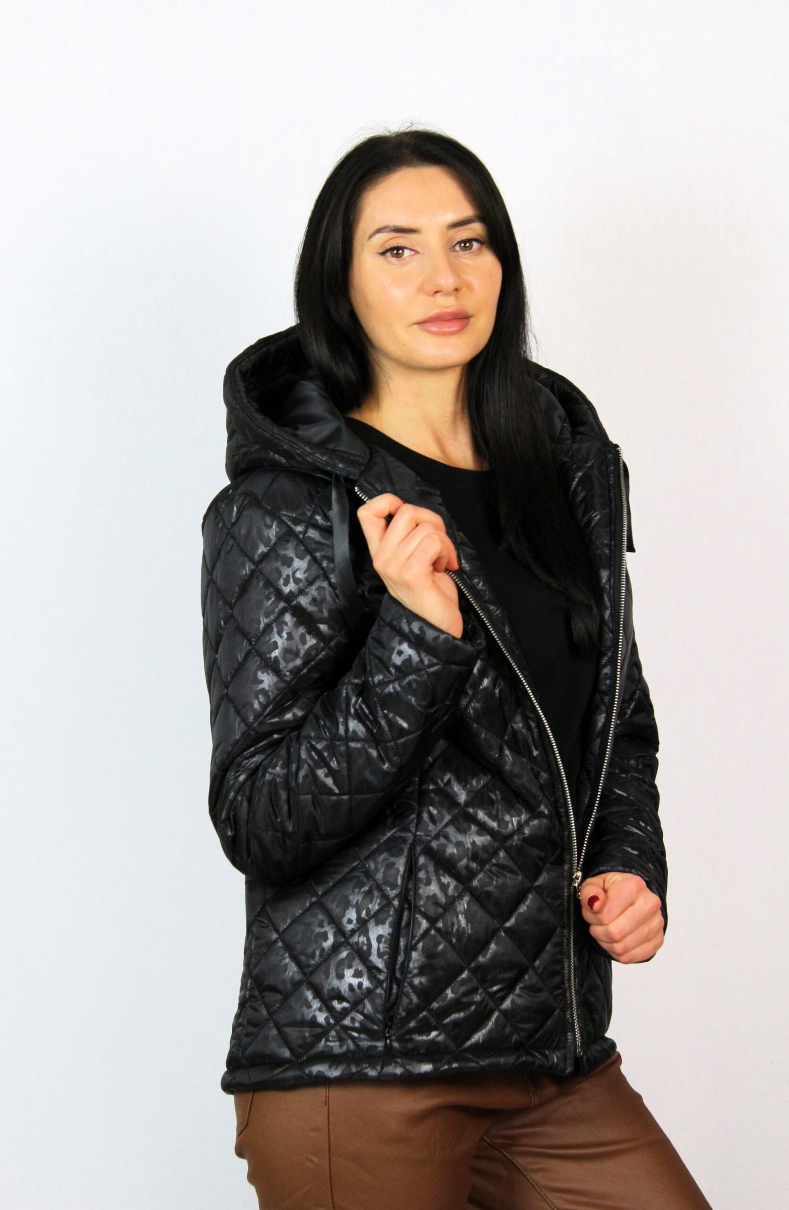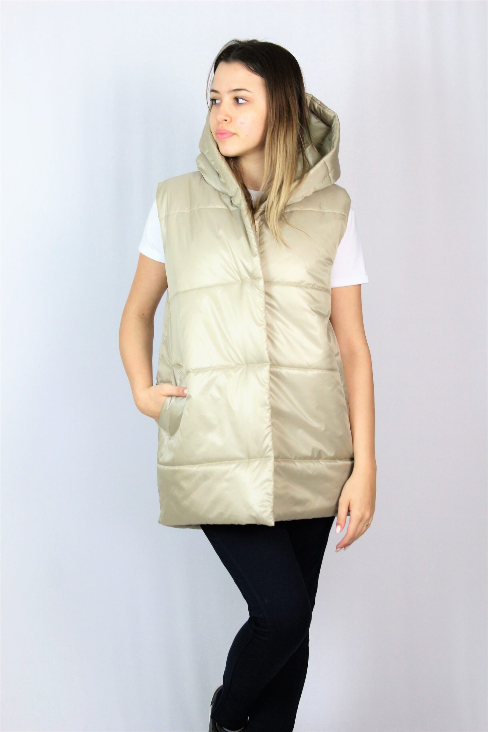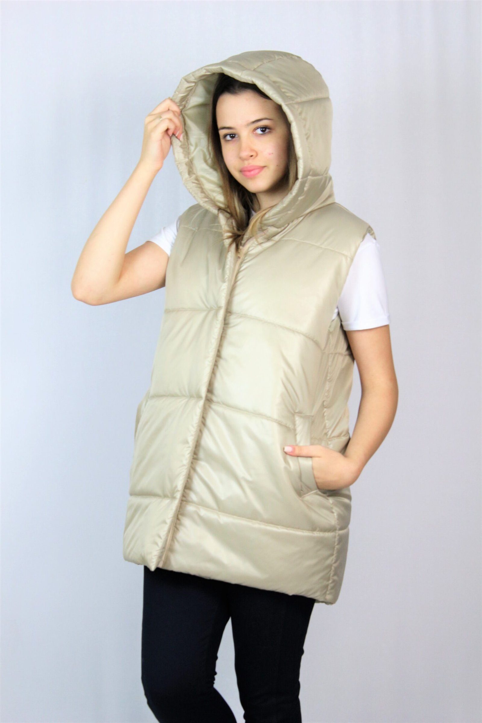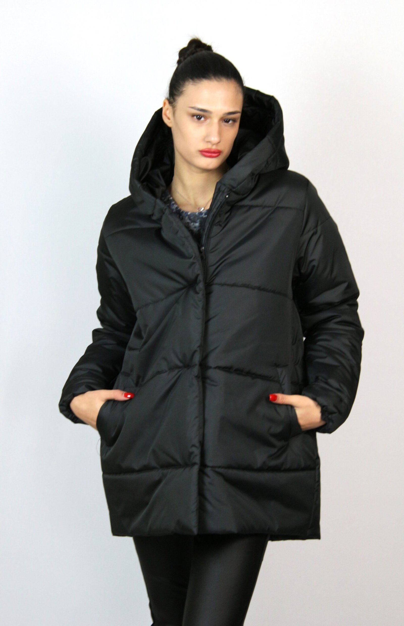 Асиметрично яке със скрити джобове с цип и качулка леко издължено в задната част.