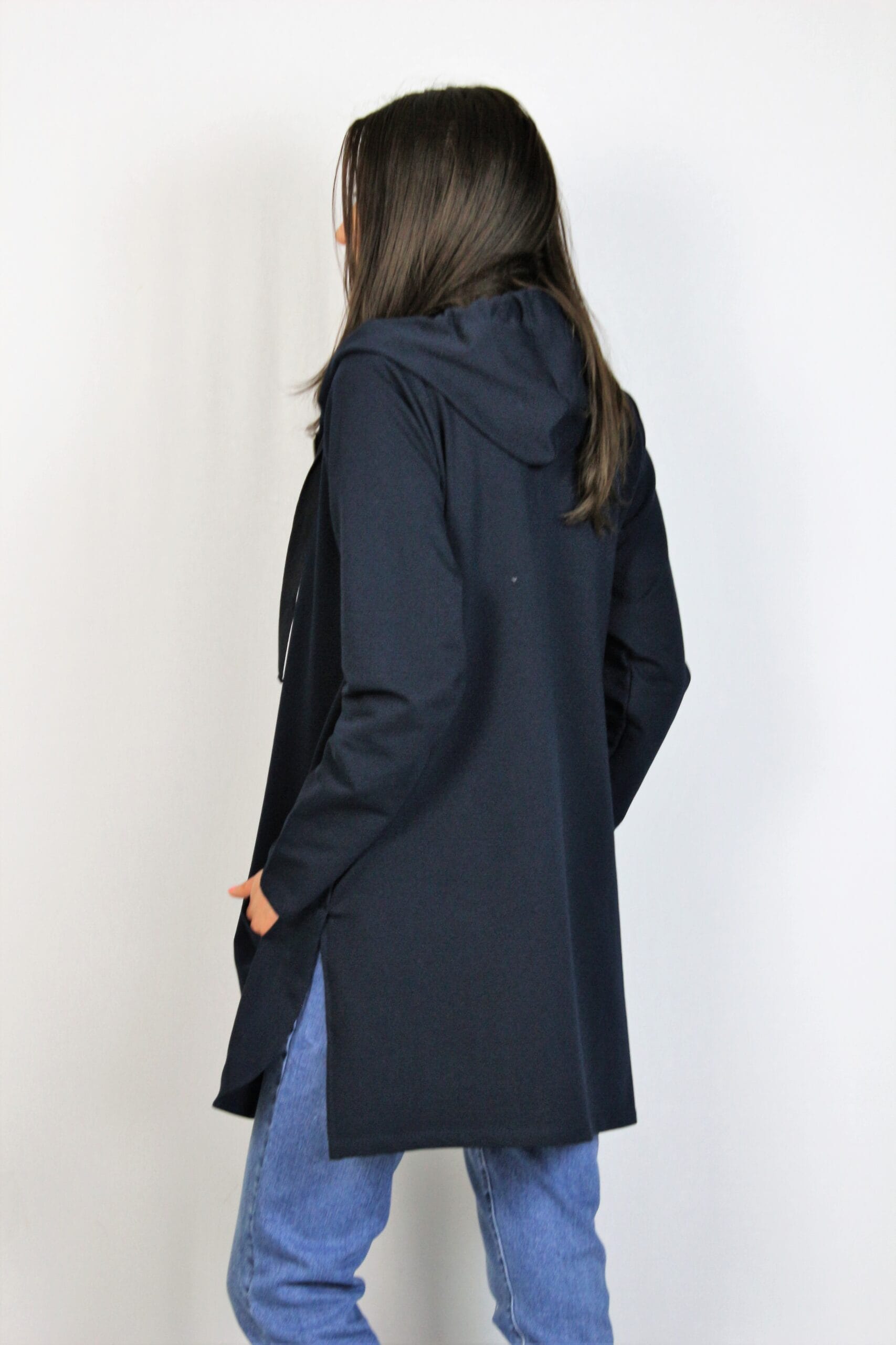 Жилетка тип суитшърт свободна кройка ,с два джоба ,качулка и метален цип. Памучна връзка на качулката.