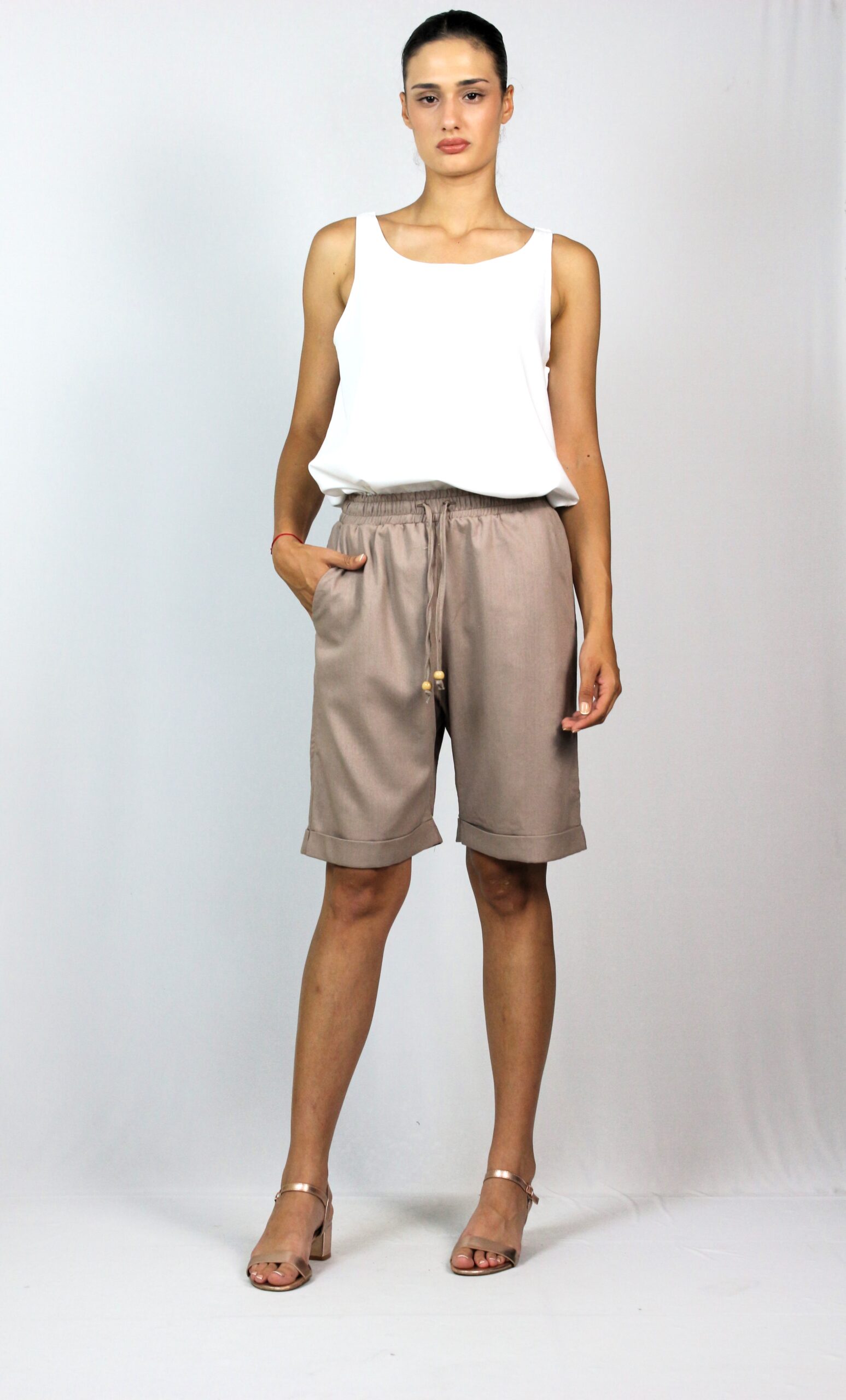 Широки бермуди с два вътрешни джоба ,с ластик , връзка на талията и маншет на крачола.