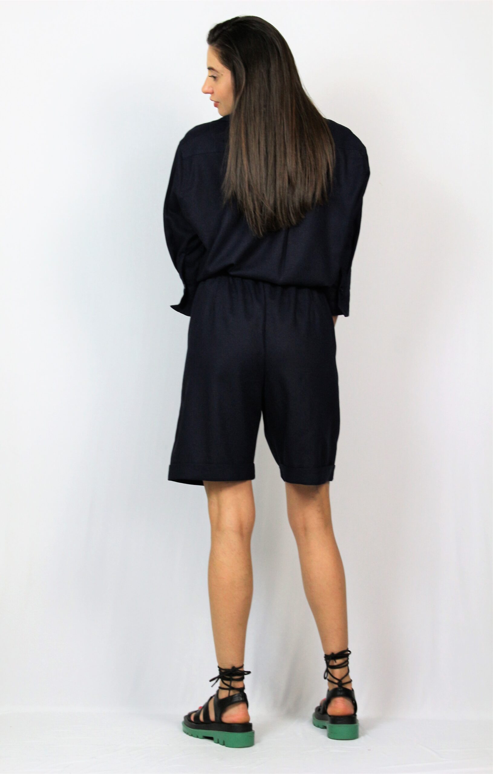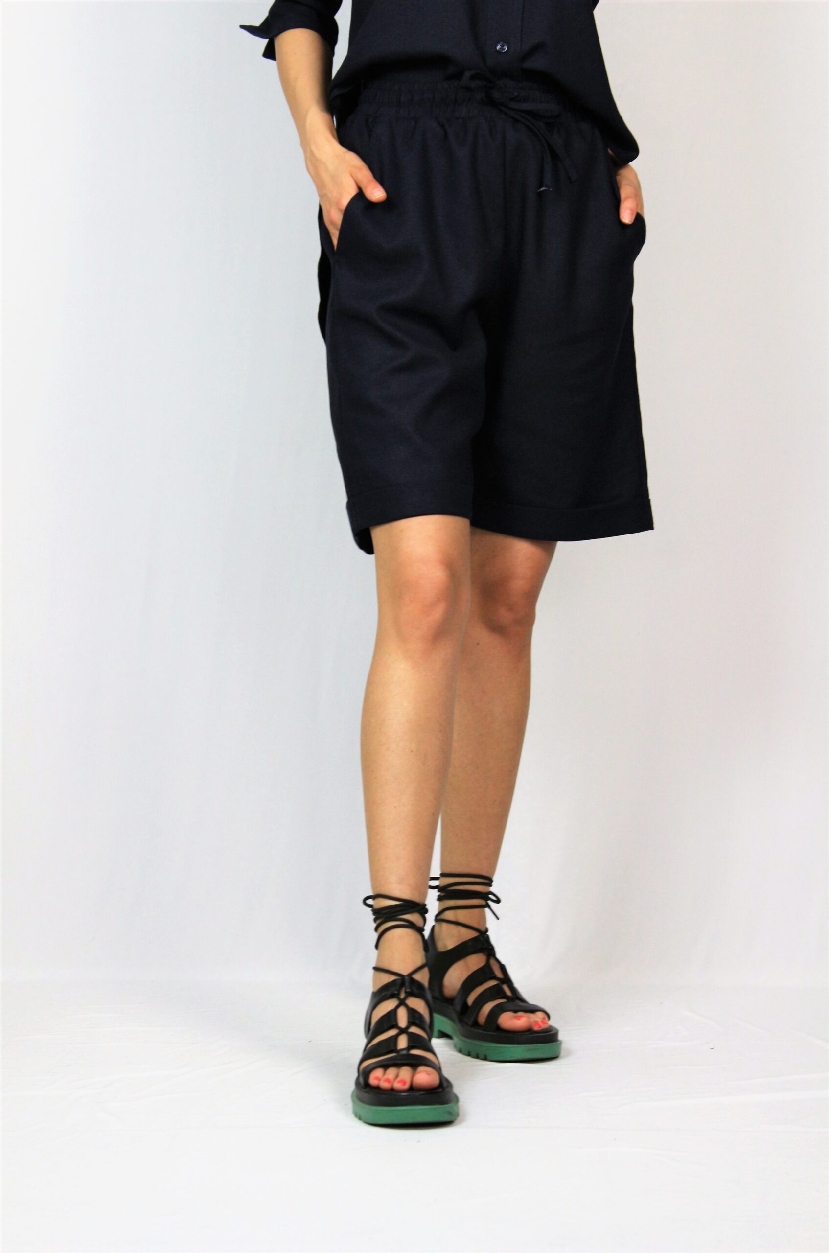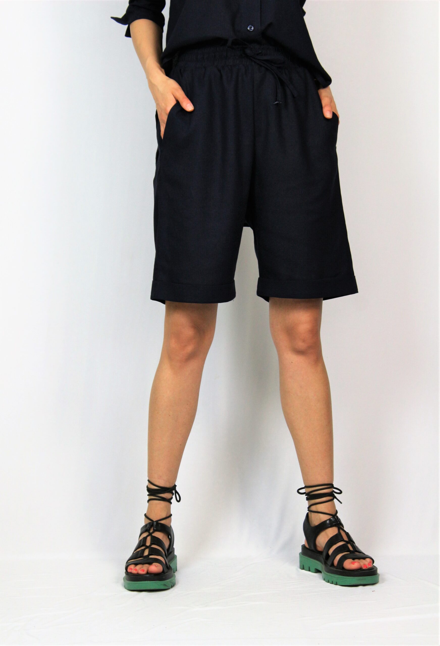 Широки бермуди с два вътрешни джоба ,с ластик , връзка на талията и маншет на крачола.