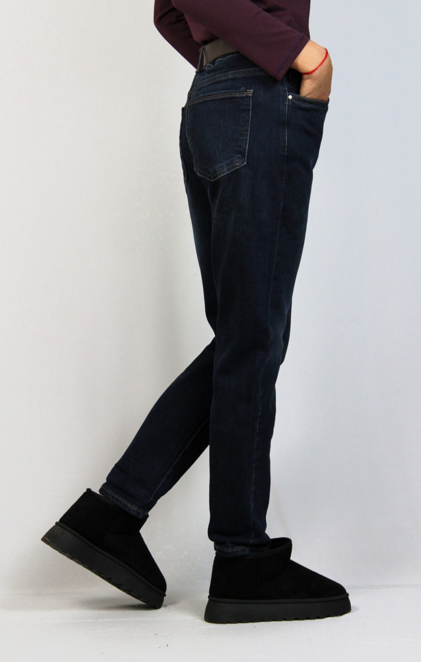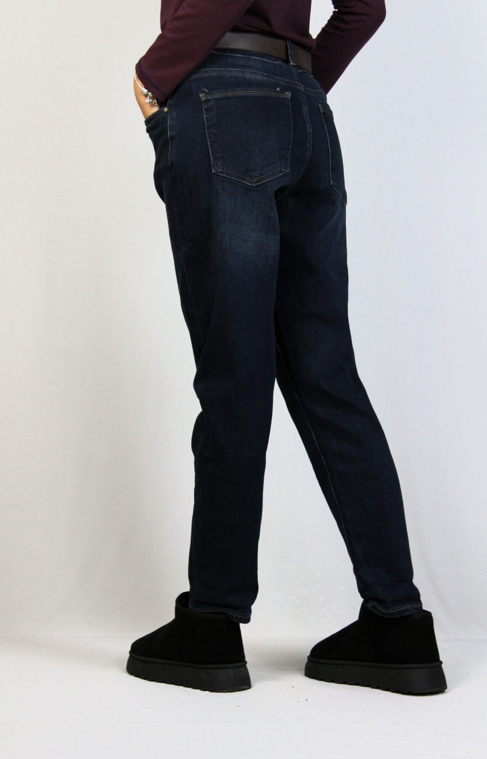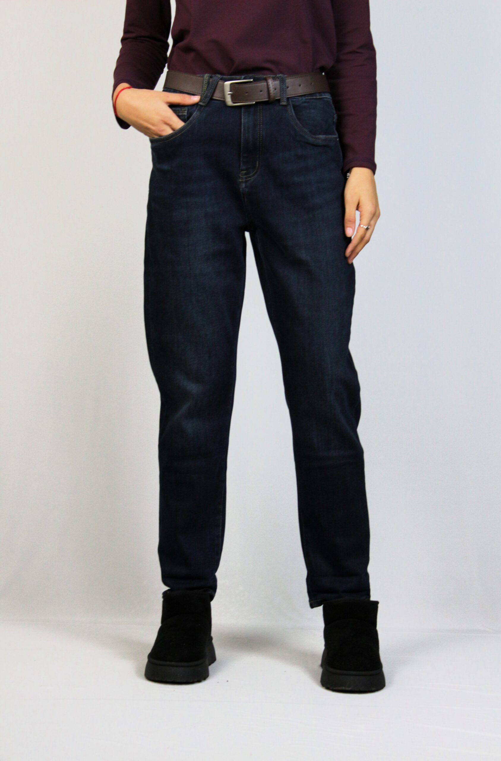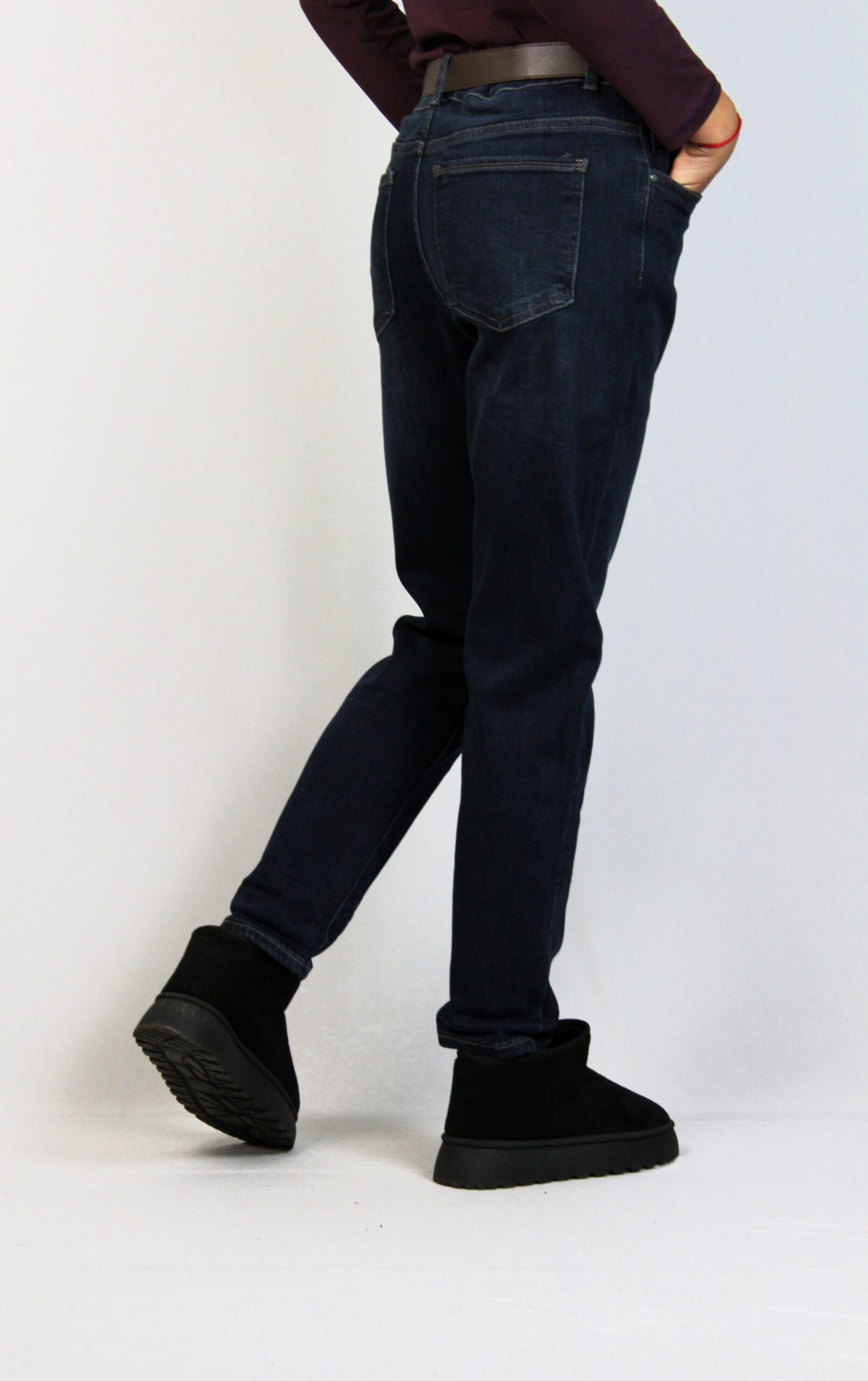 Дънки с леки ефекти от еластична тъкан за повече удобство . Модел с пет джоба. Закопчаване с цип и метално копче отпред.Имат допълнителен колан.