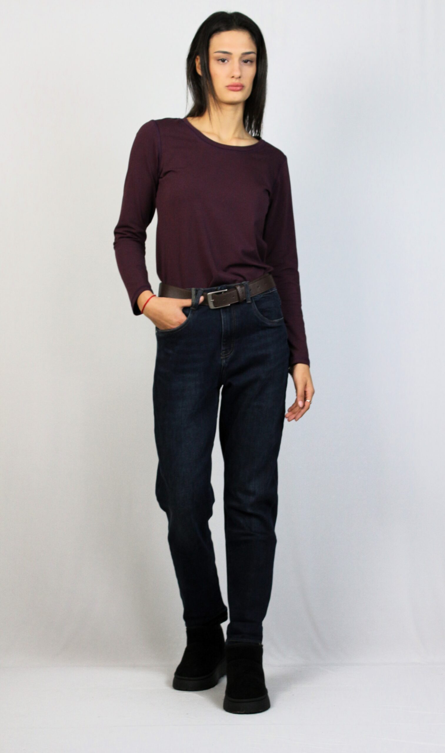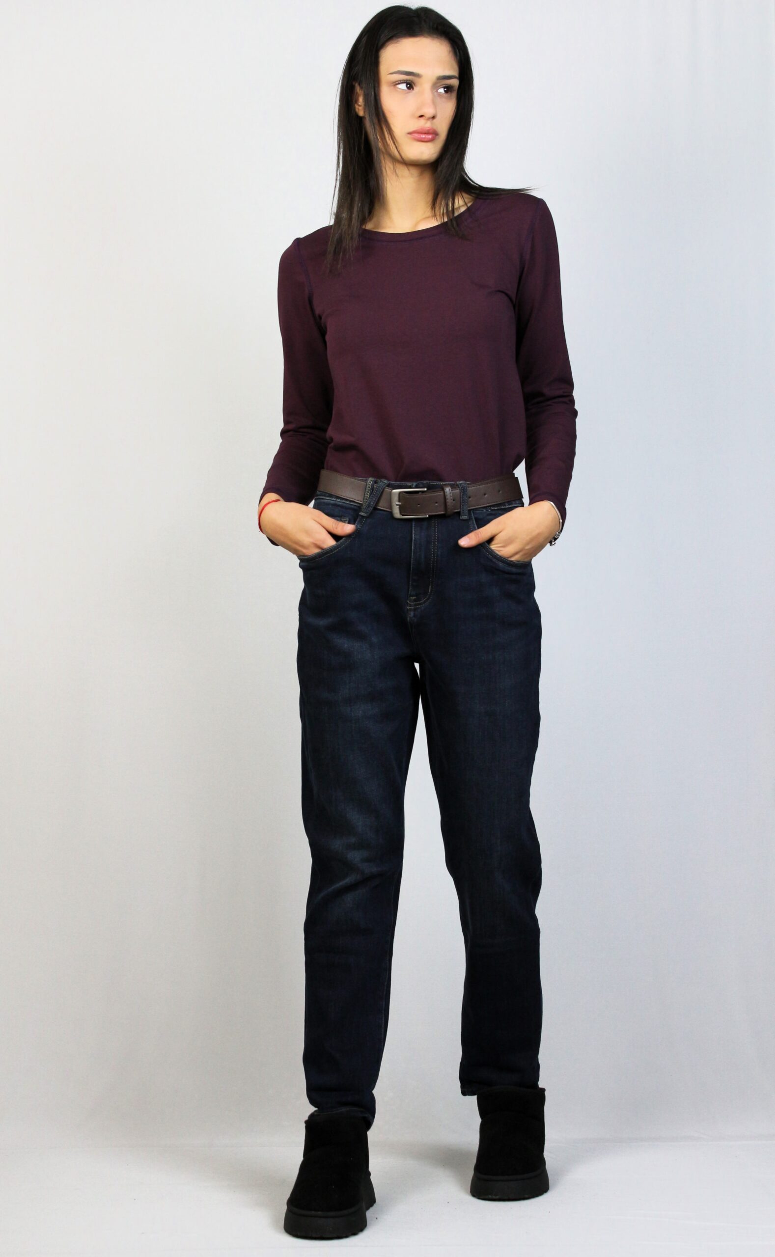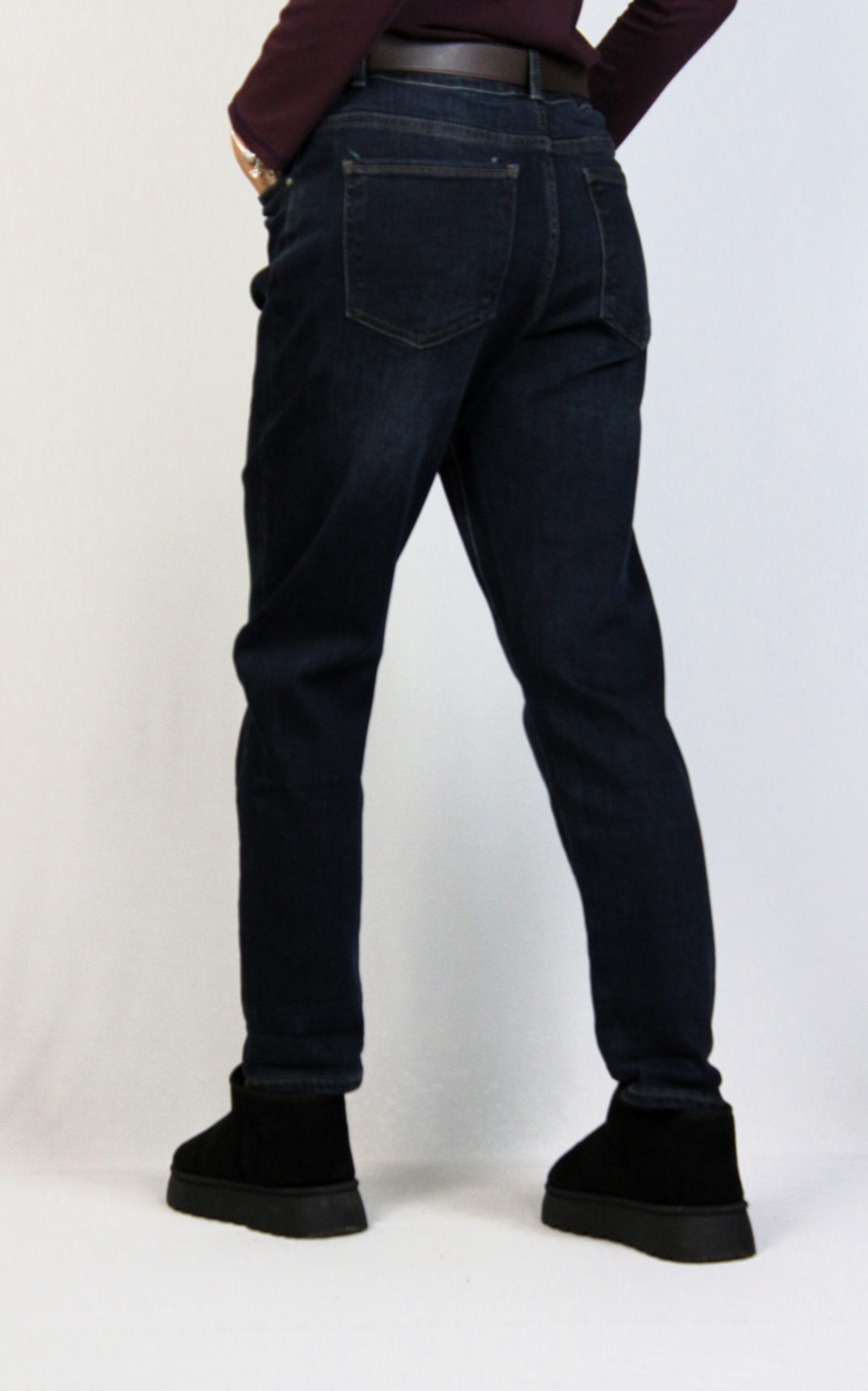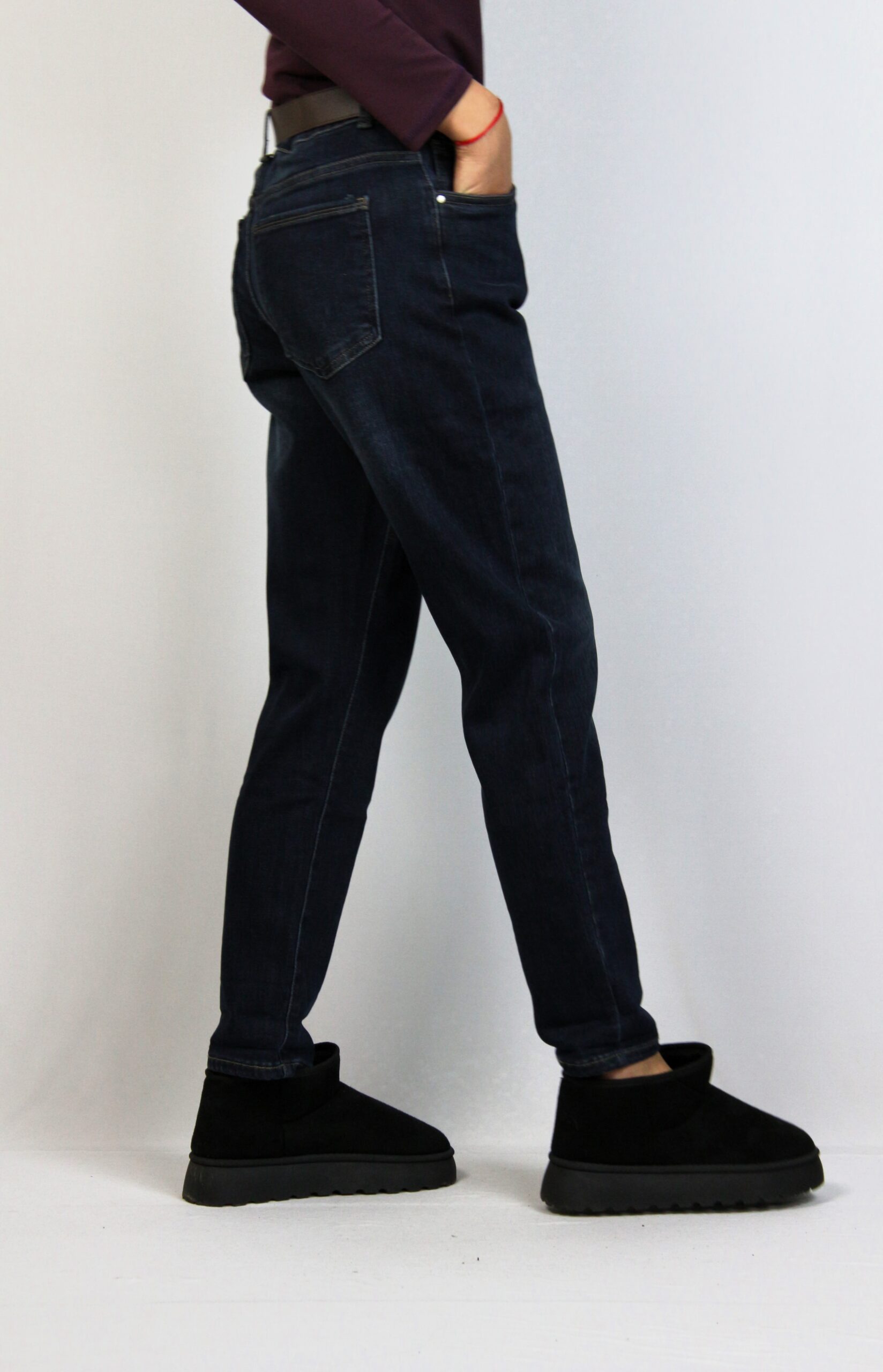 Дънки с леки ефекти от еластична тъкан за повече удобство . Модел с пет джоба. Закопчаване с цип и метално копче отпред.Имат допълнителен колан.