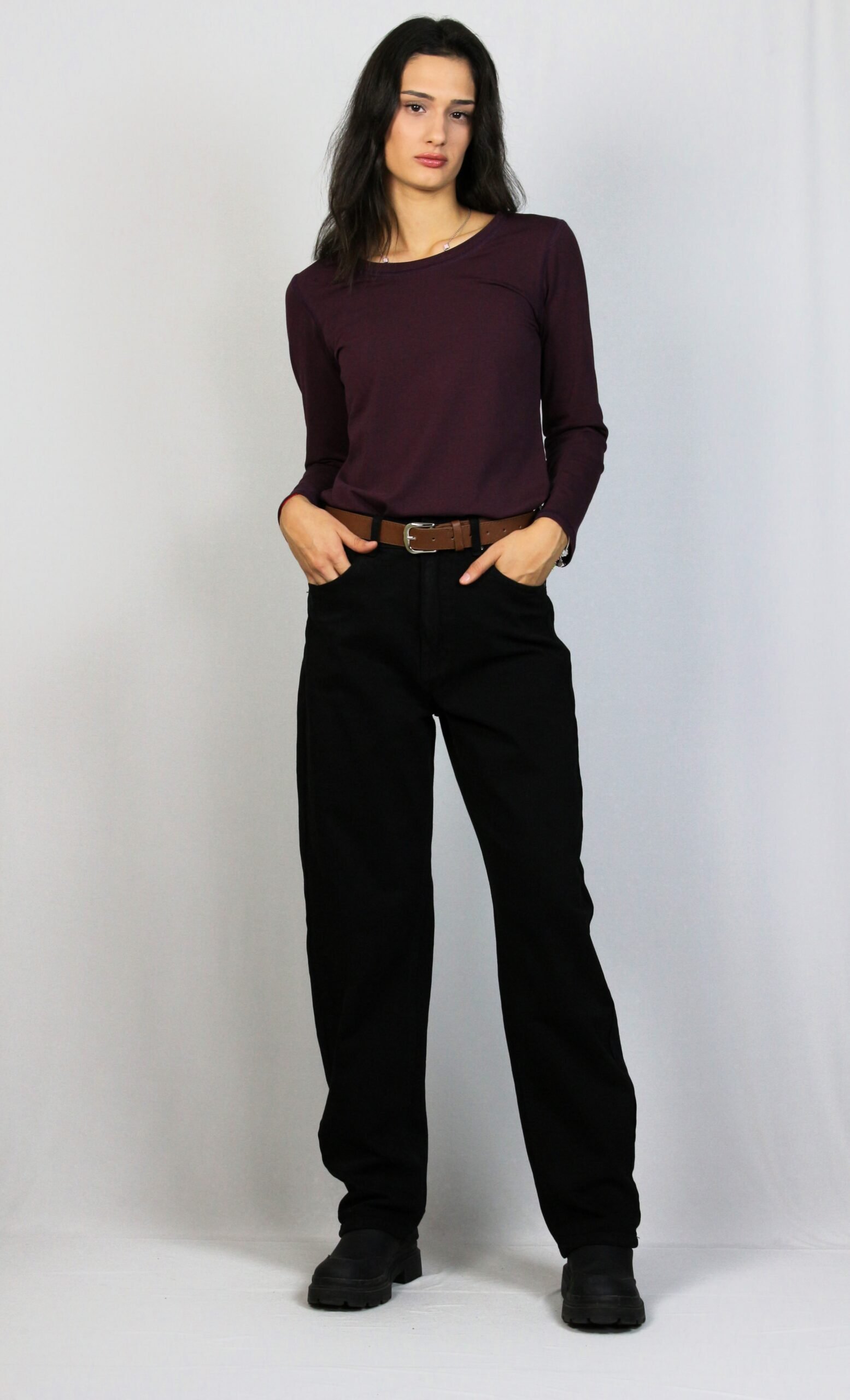 Дънки от еластична тъкан за повече удобство тип балон . Модел с пет джоба. Закопчаване с цип и метално копче отпред имат допълнителен колан.