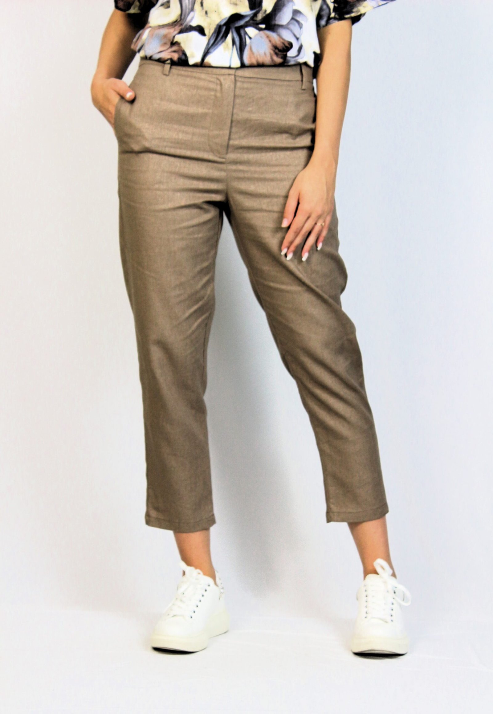 Скъсен панталон с предни джобове и декоративни джобове с филетка на гърба. Предно закопчаване с цип и копче.