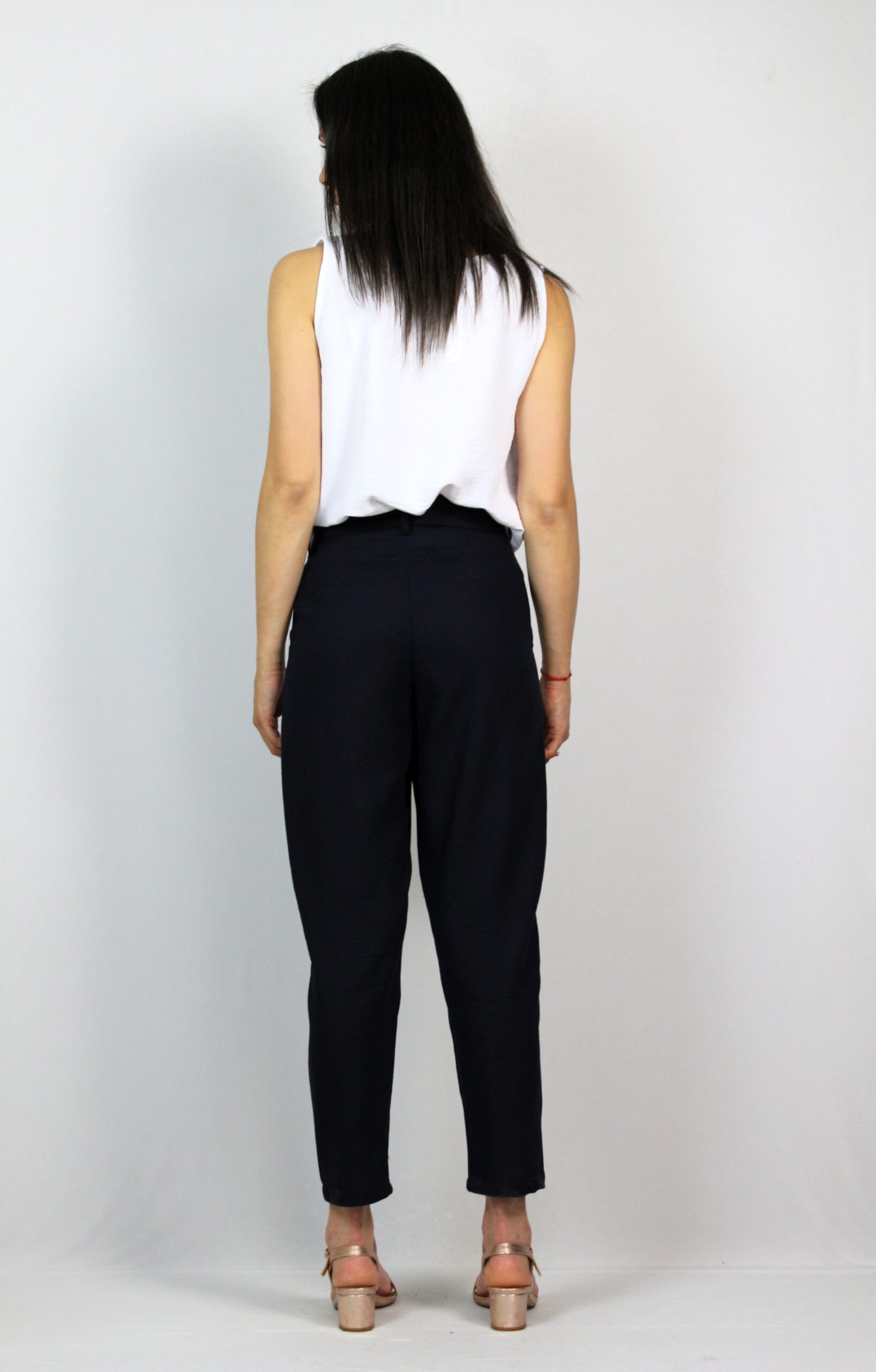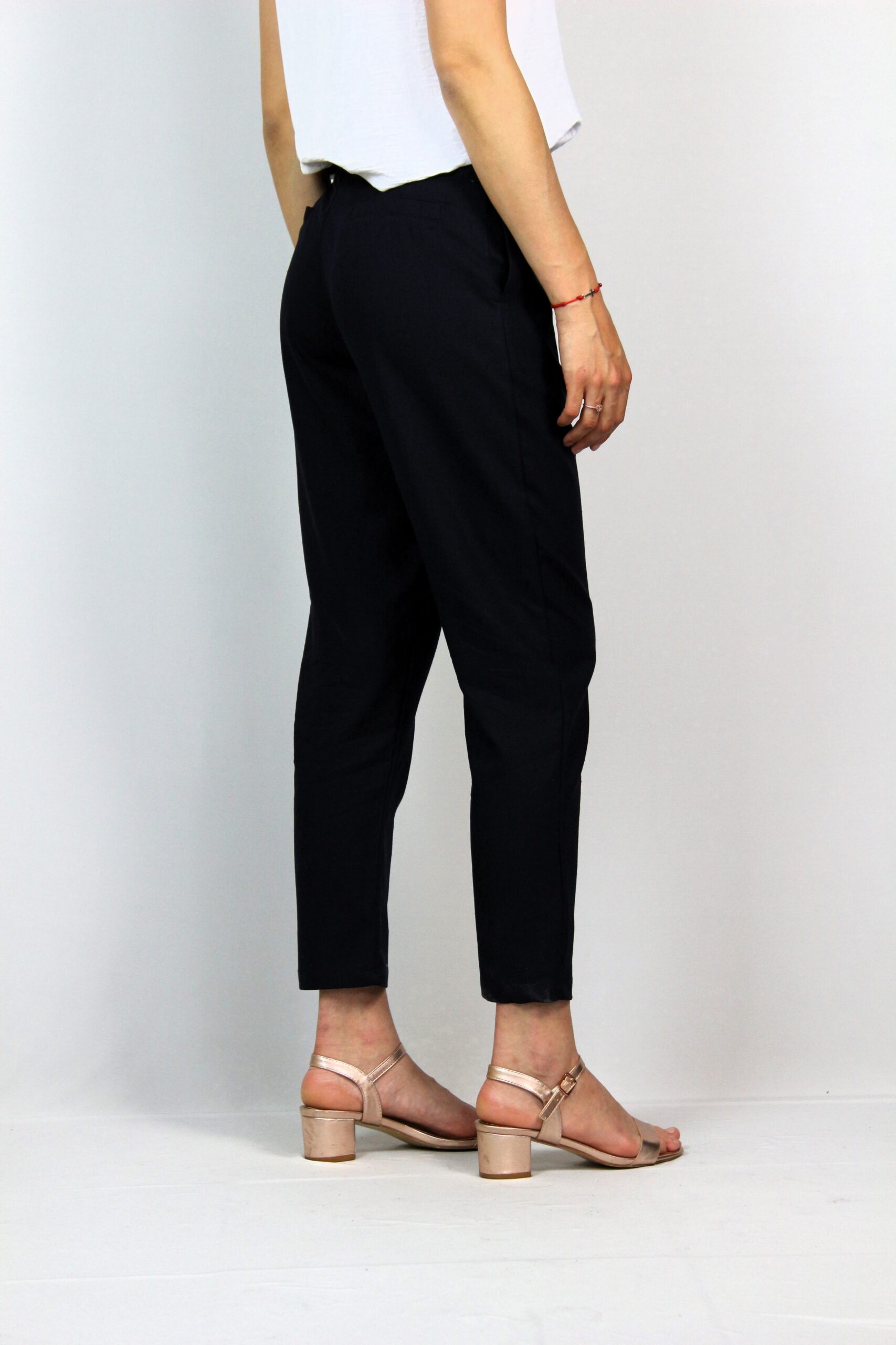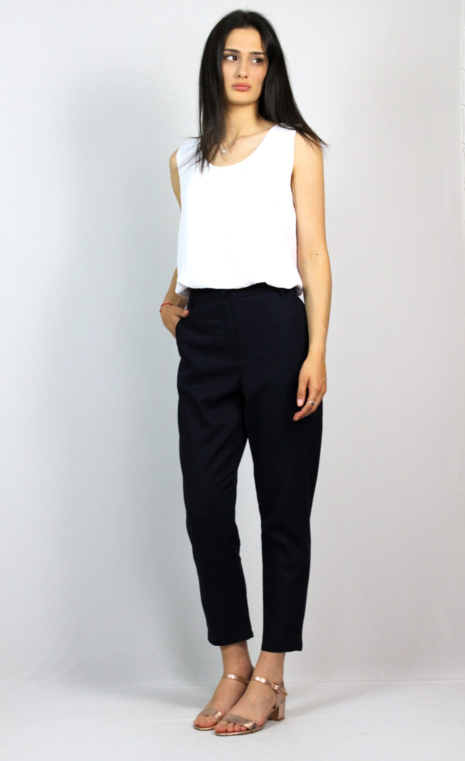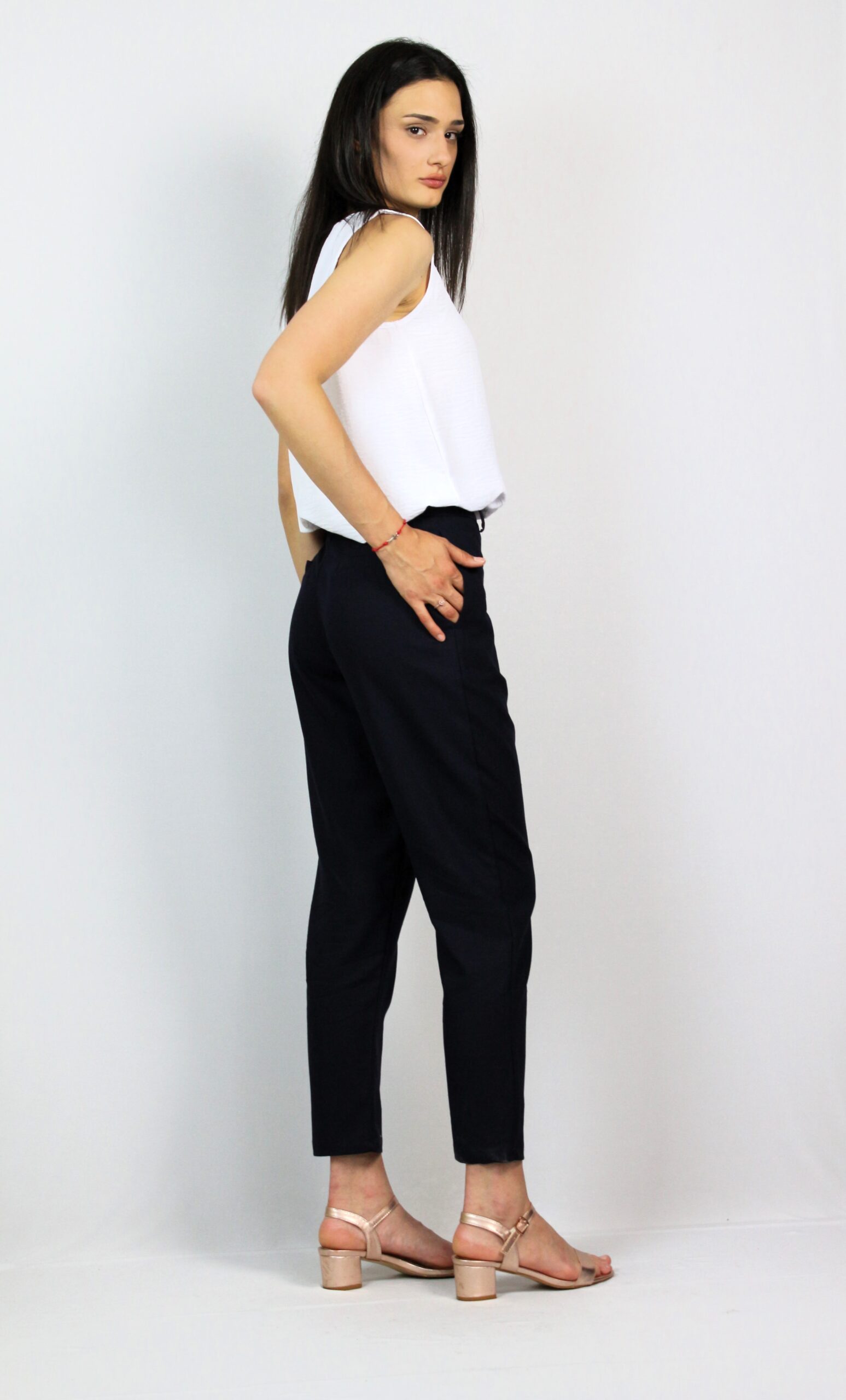 Скъсен панталон с предни джобове и декоративни джобове с филетка на гърба. Предно закопчаване с цип и копче.