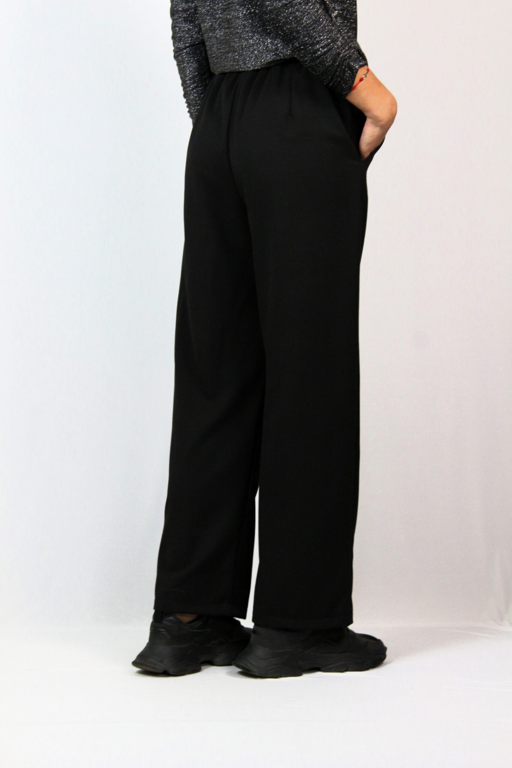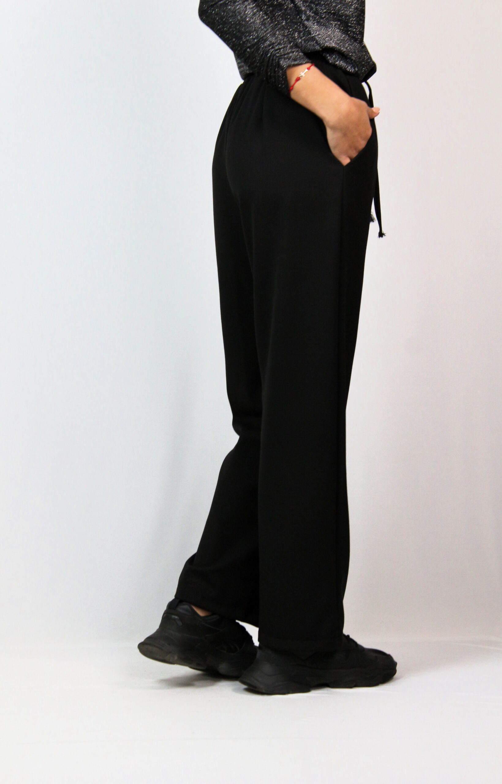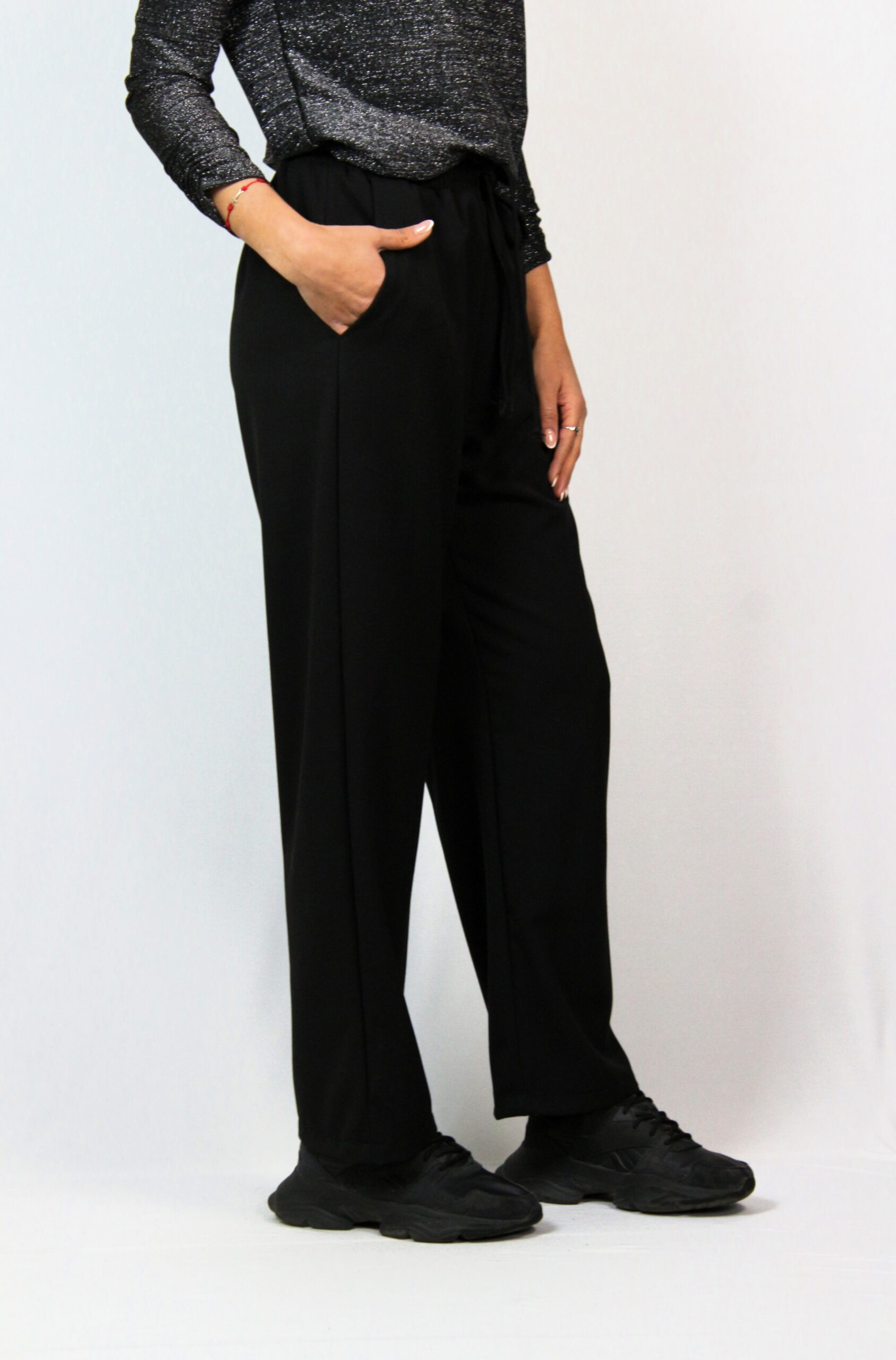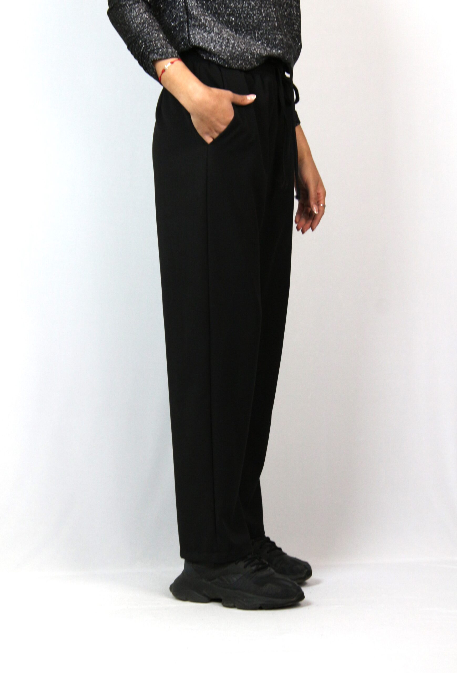 Панталон със средна талия,.ластичен колан с регулируеми връзки и широки крачоли.