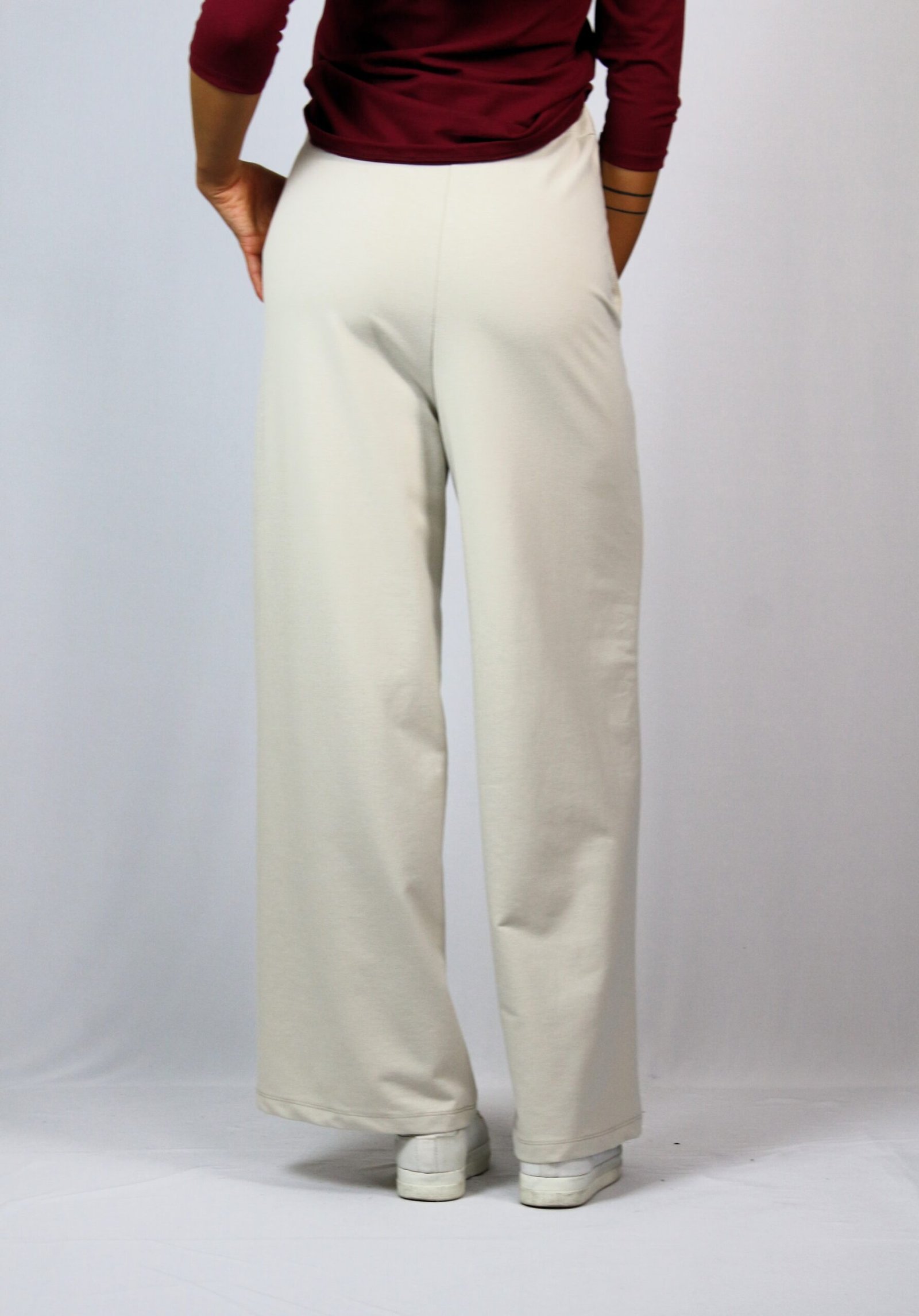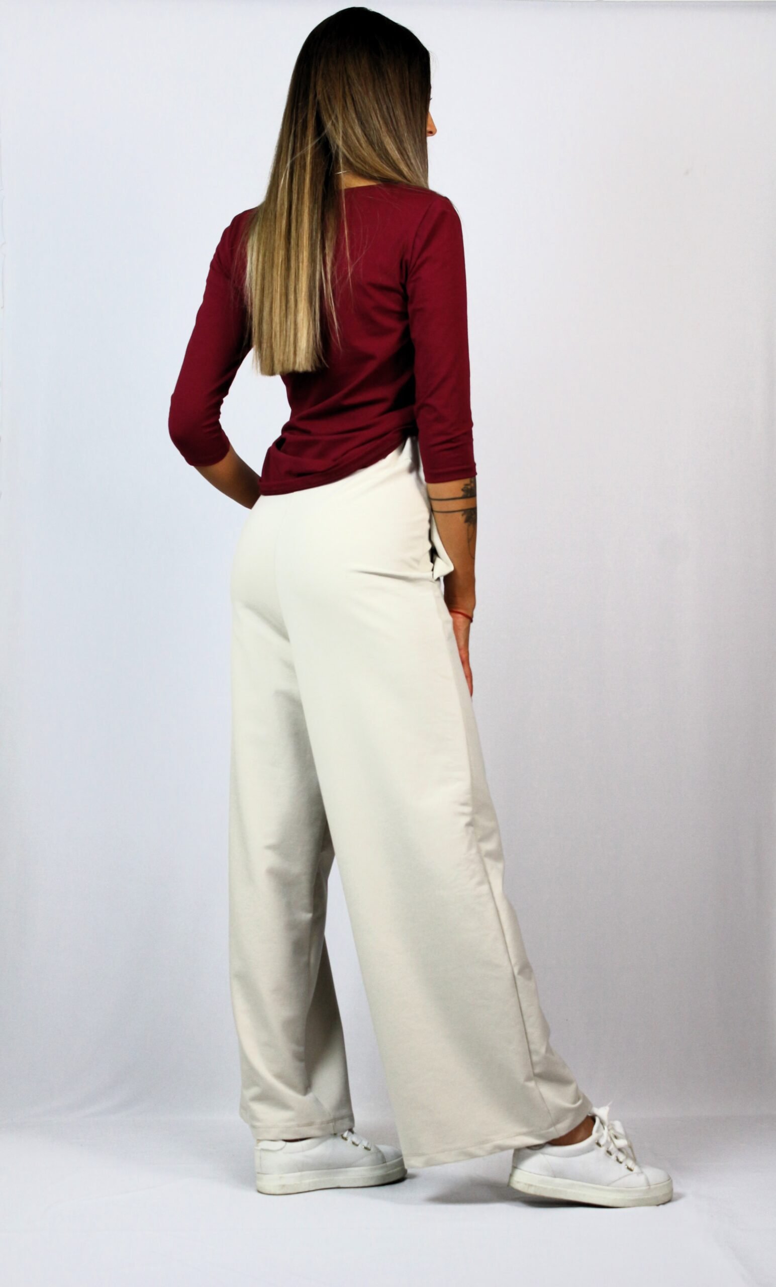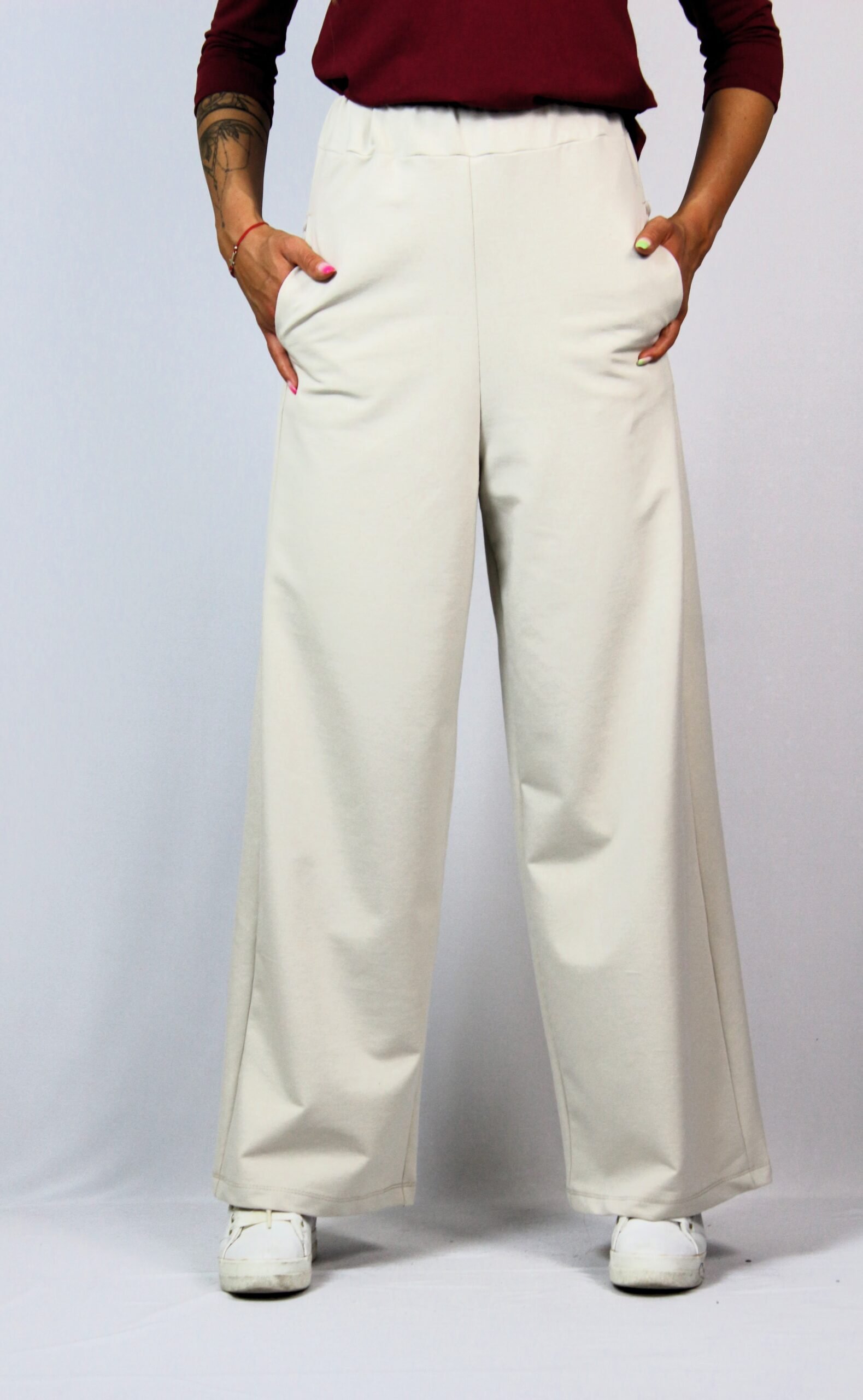 Панталон с висока талия и ластичен колан ,широки крачоли и вътрешни джобове. Изработен от високо качествено памучно трико.