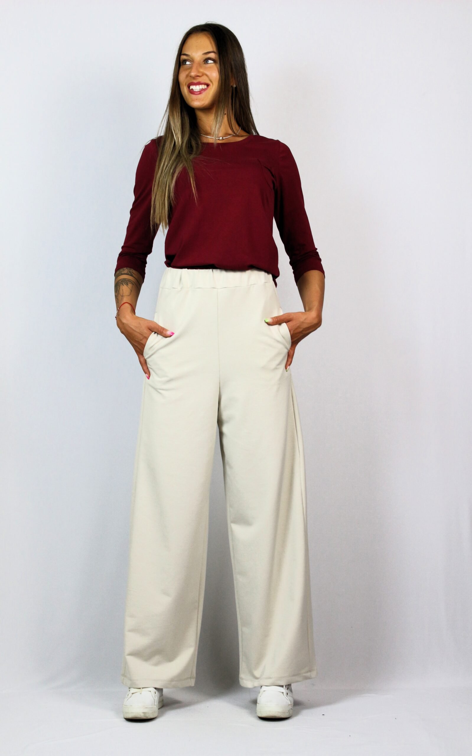 Панталон с висока талия разкроени крачоли ,два вътрешни джоба и ластичен колан