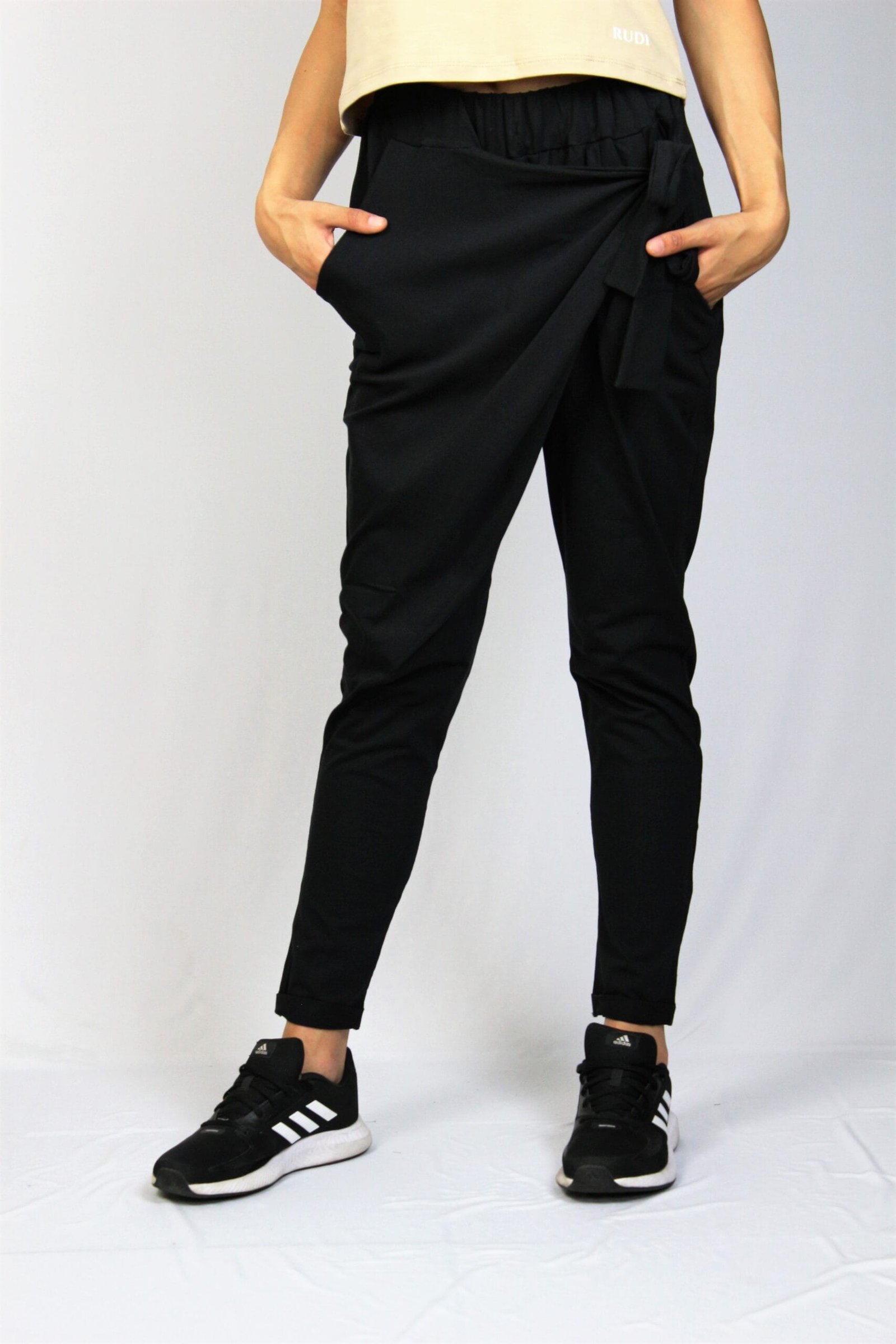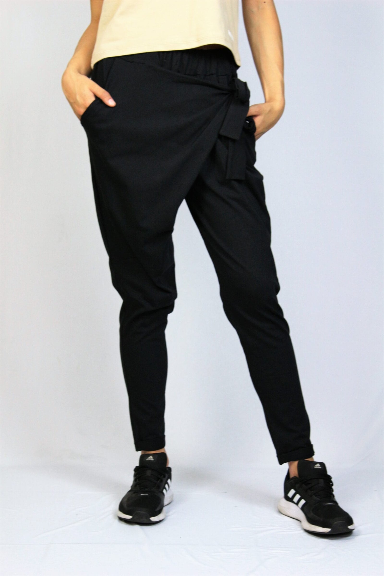 Спортно елегантен панталон от памучно тънко трико – 95% памук и 5% еластан. С прехвърляне отпред в талията с ластик , което позволява пристягане или отпускане.