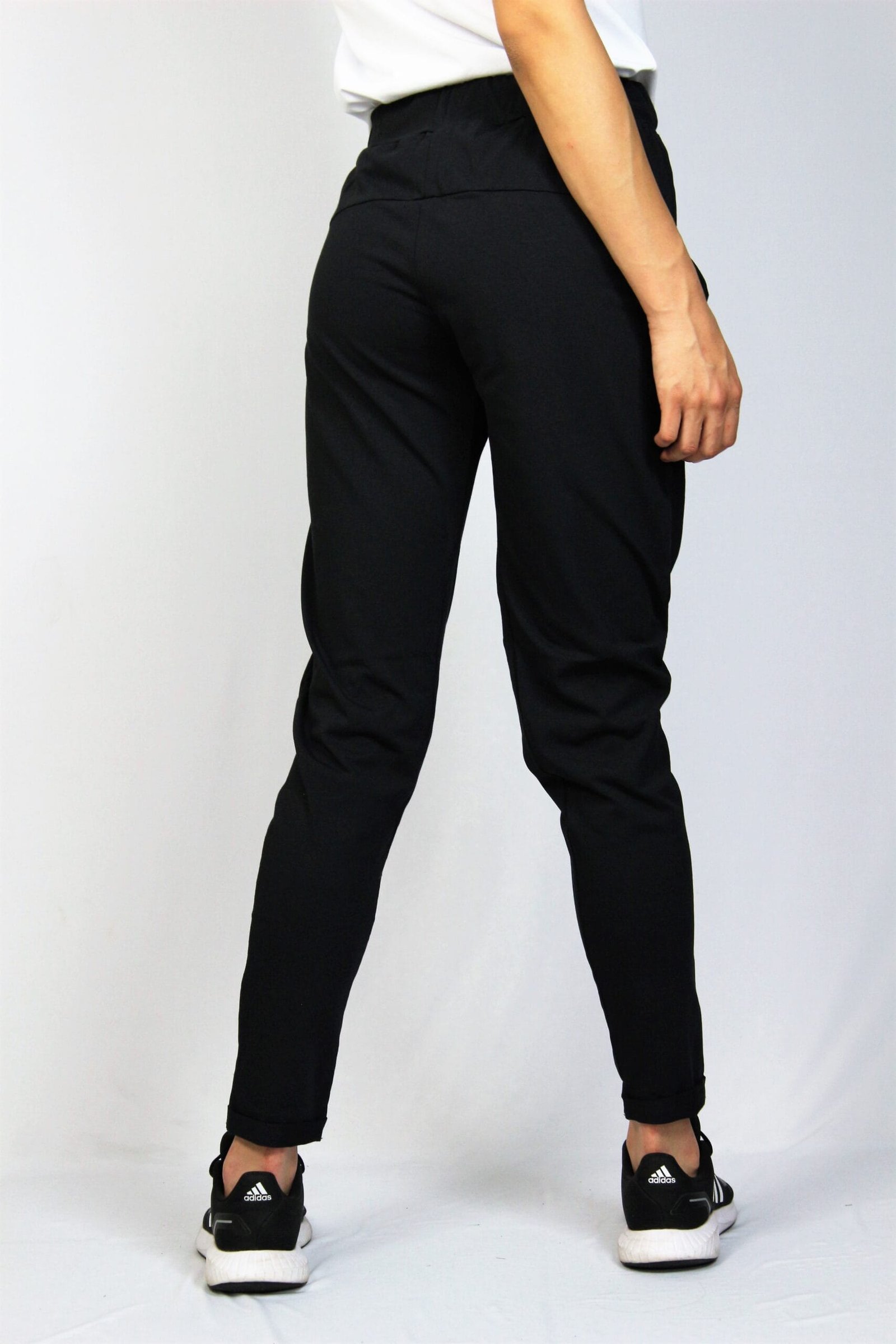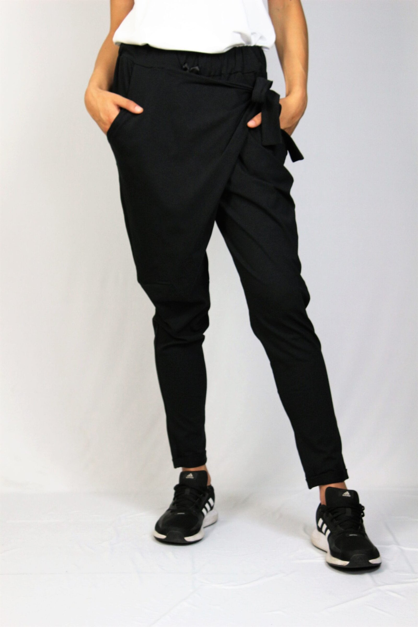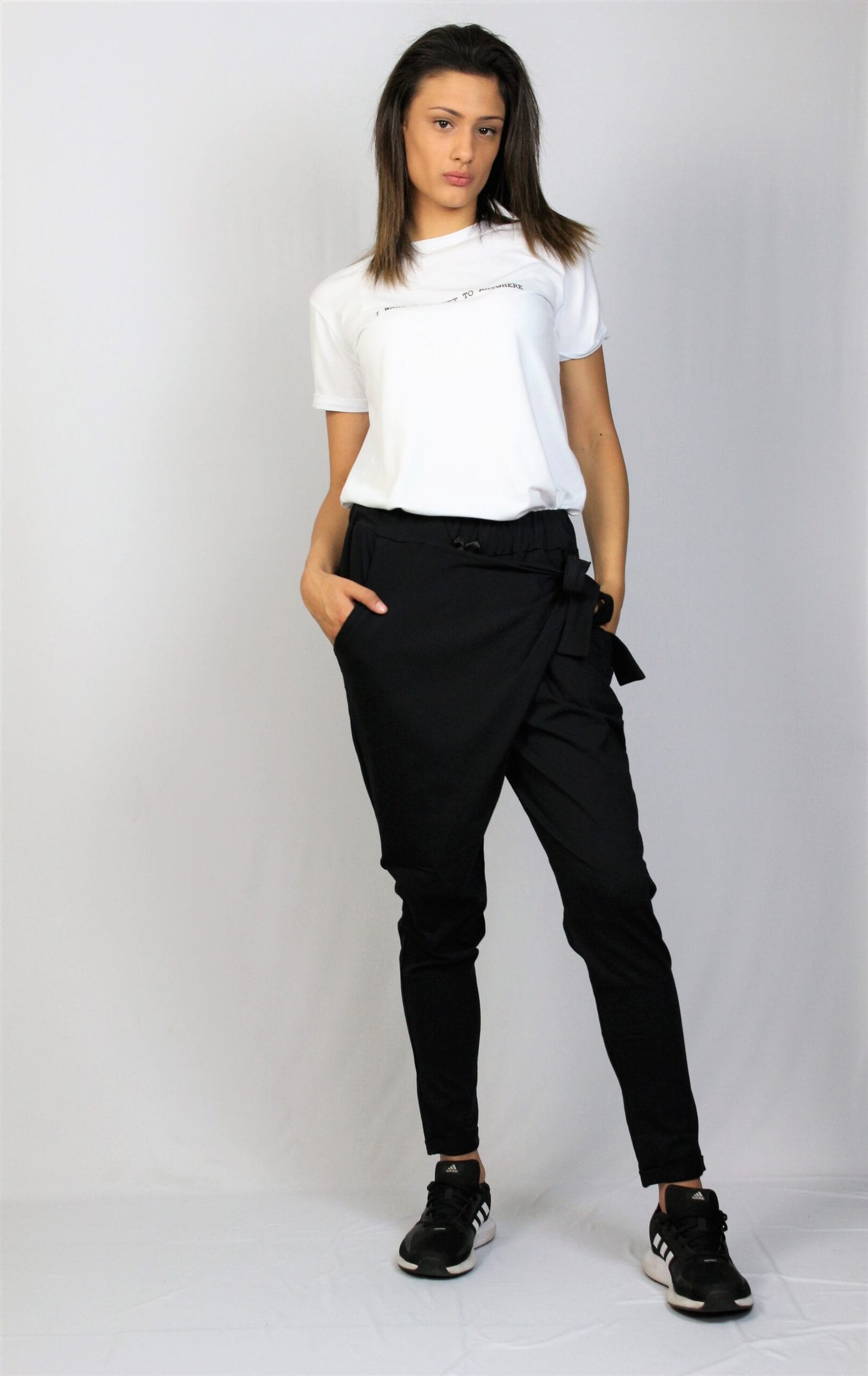 Спортно елегантен панталон от памучно тънко трико – 95% памук и 5% еластан. С прехвърляне отпред в талията с ластик , което позволява пристягане или отпускане.