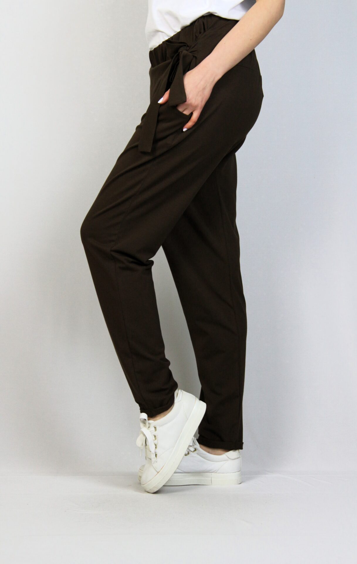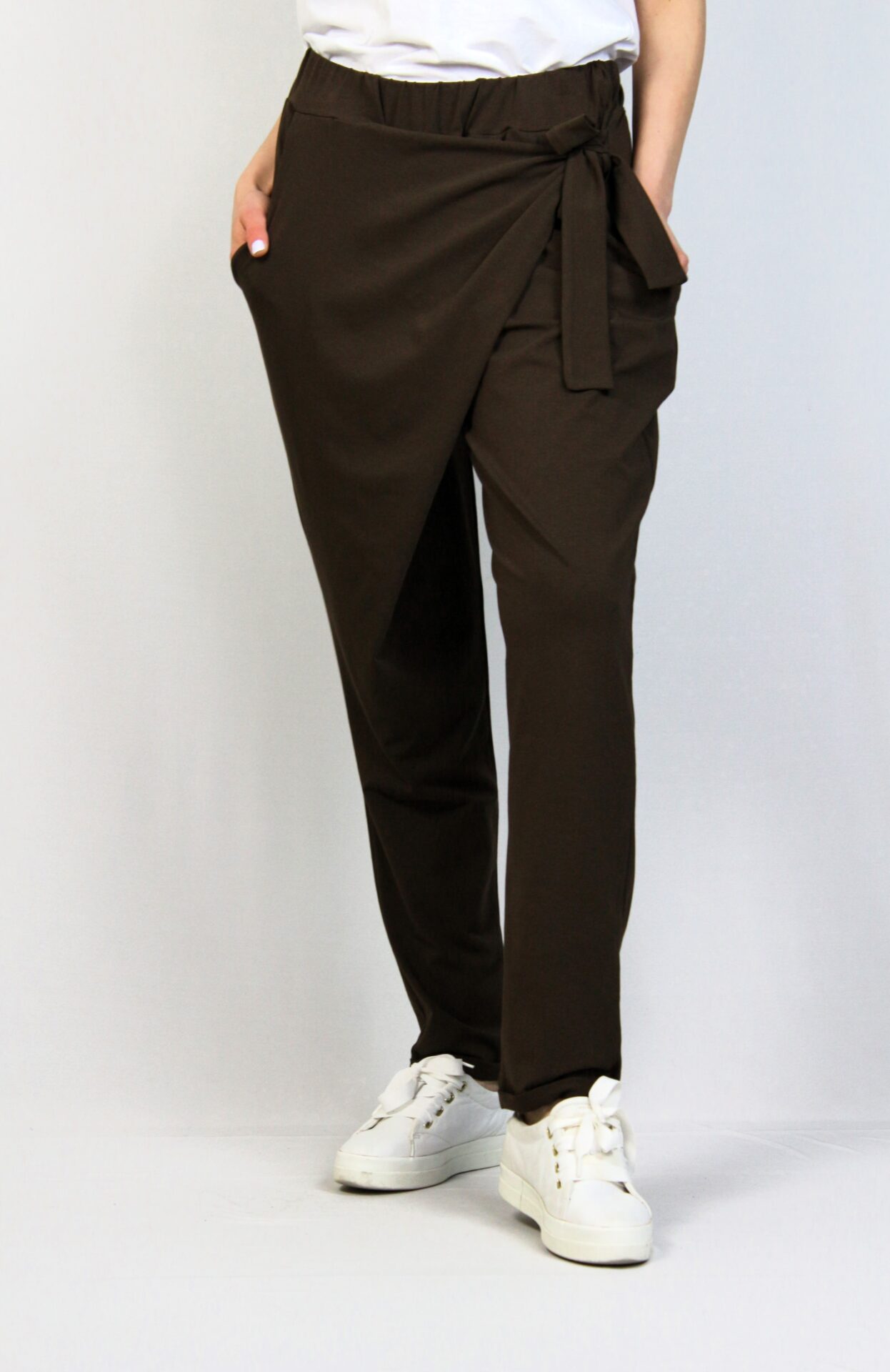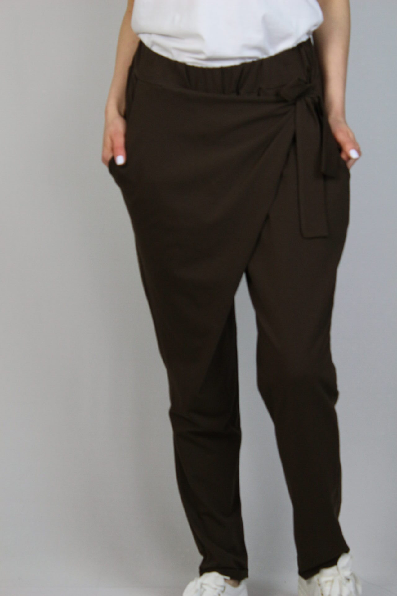 Спортно елегантен панталон от памучно тънко трико – 95% памук и 5% еластан. С прехвърляне отпред в талията с ластик , което позволява пристягане или отпускане.