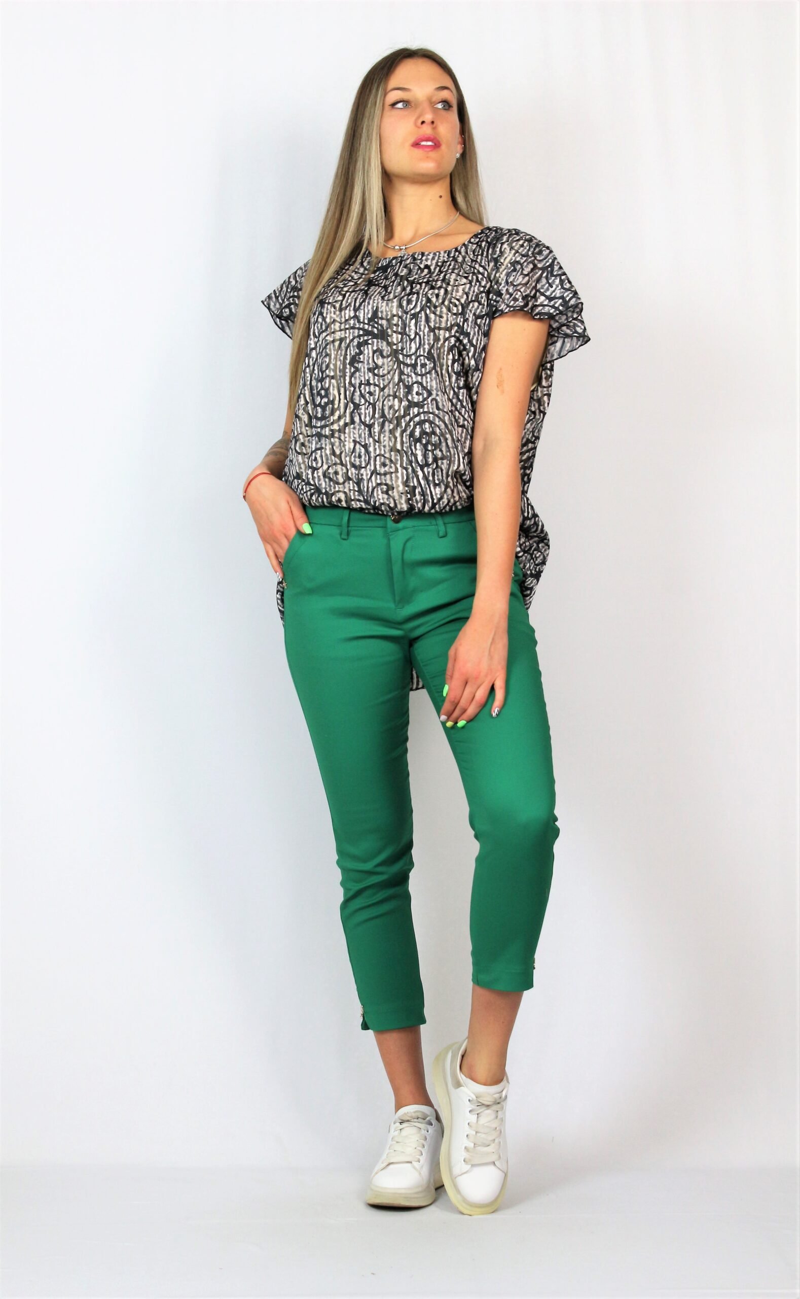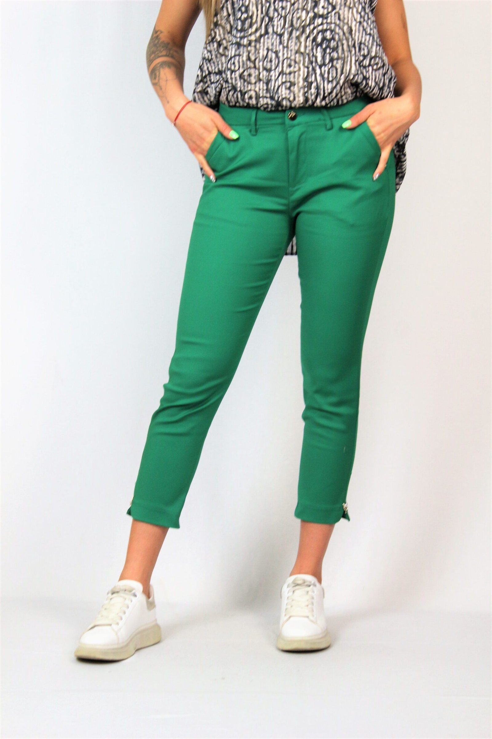 Панталон със средна талия , предни джобове и декоративни задни джобове с филетка. С цепки отстрани. Закопчаване с цип .