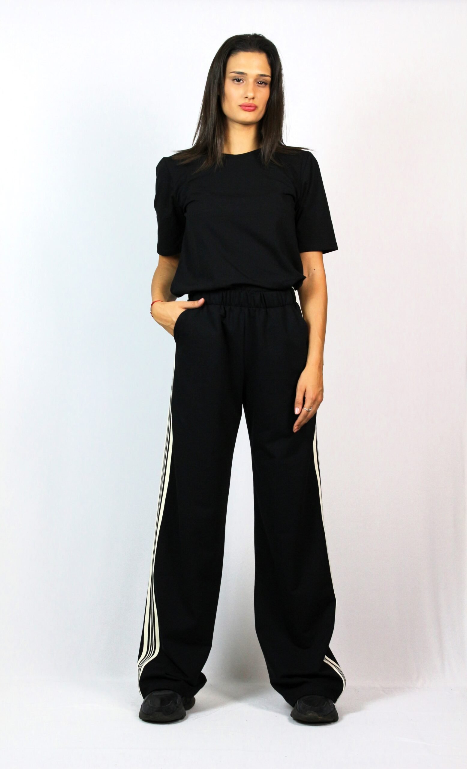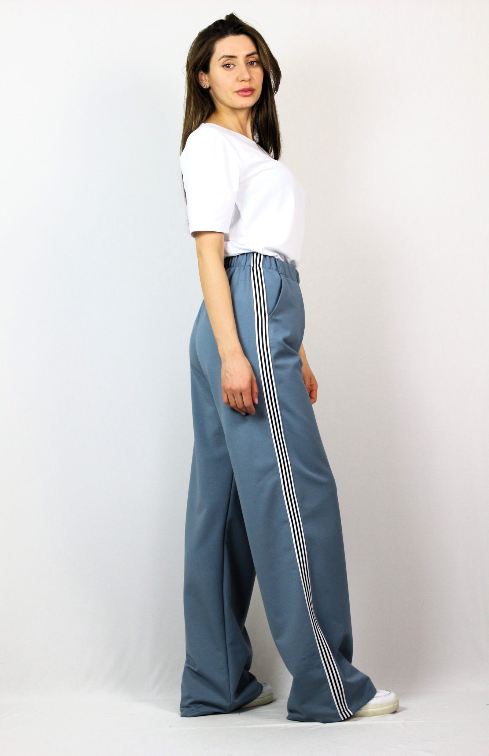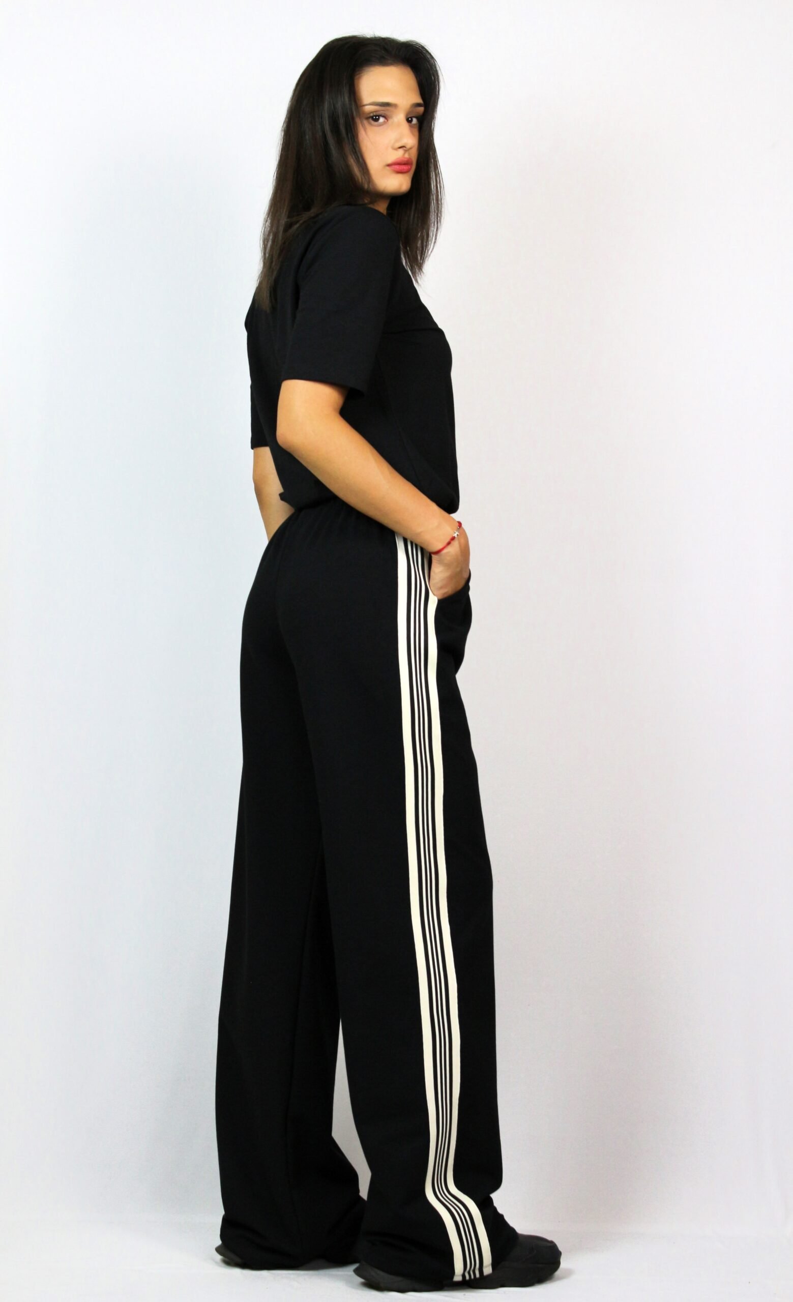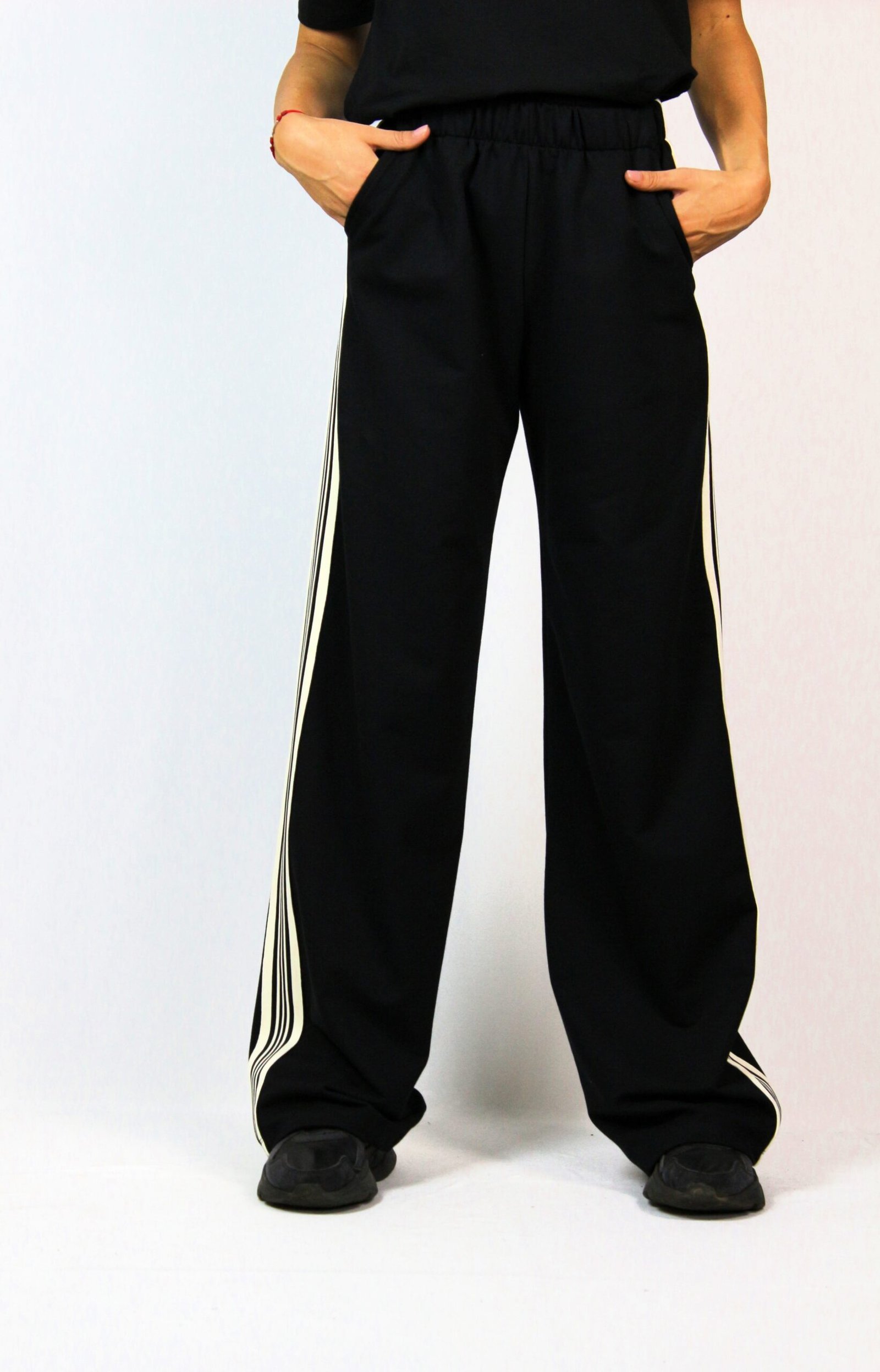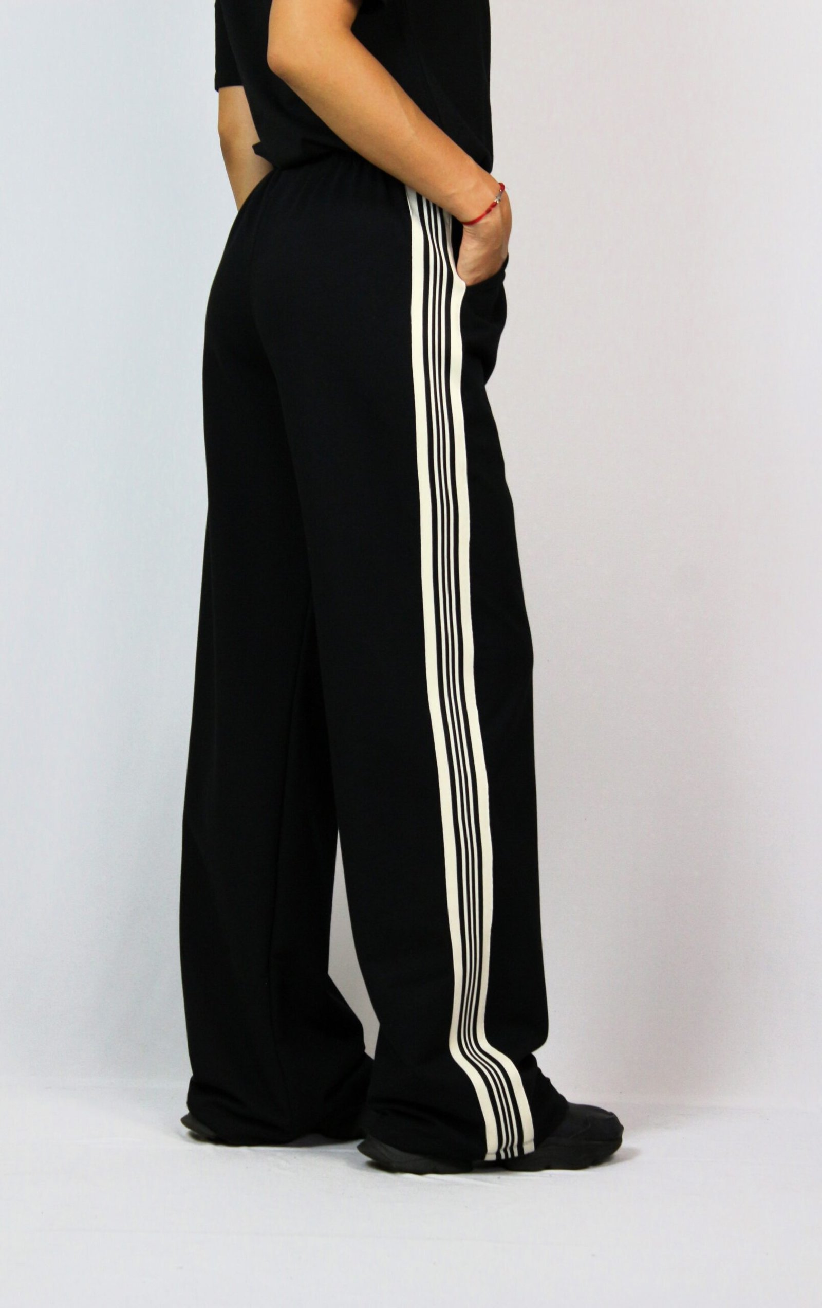 Свободен панталон с ластичен колан , италиански джоб и с ивица отстрани.