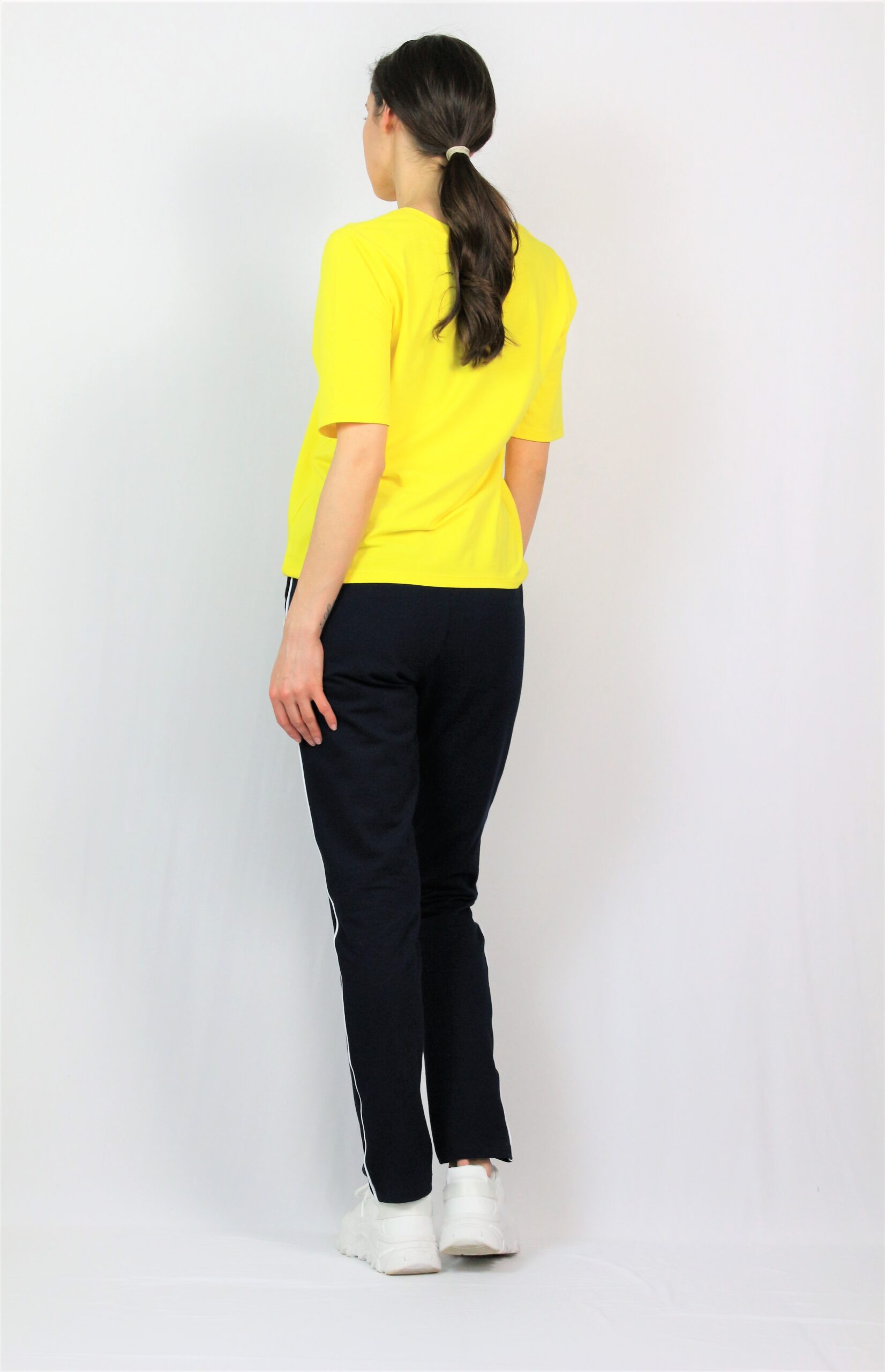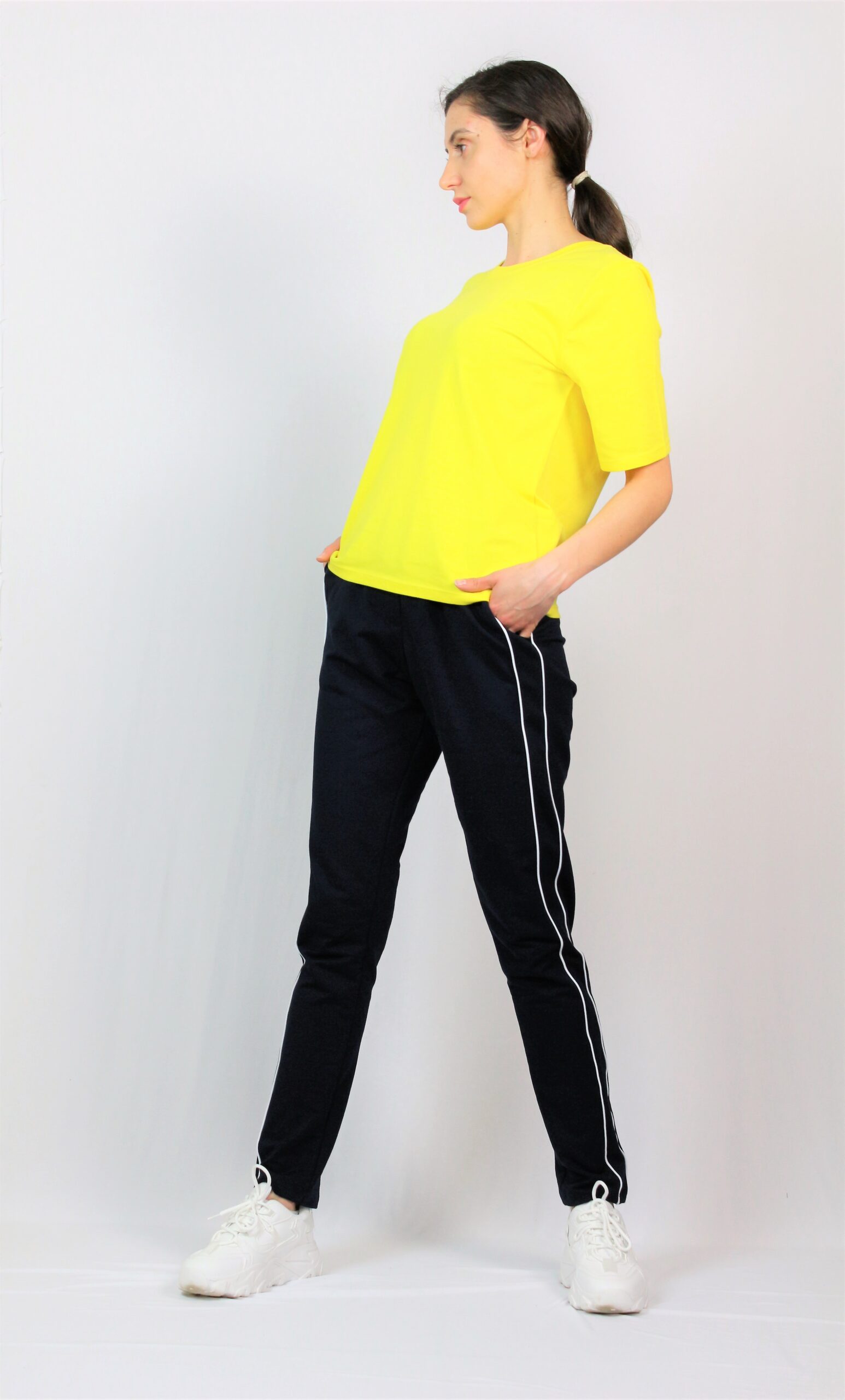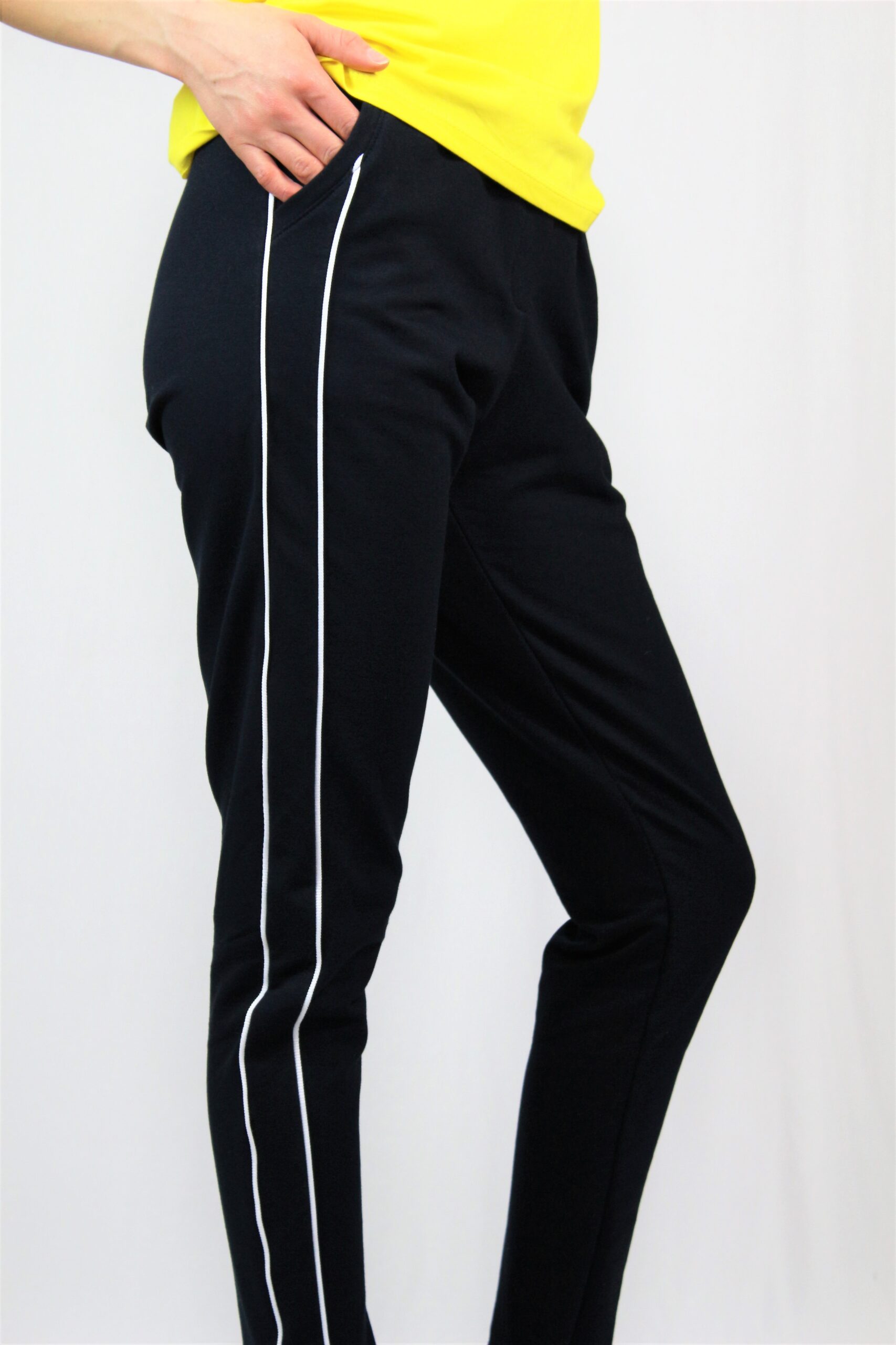 Спортен панталон с кантове, два джоба, ластик на талията. Изработен от висококачествено памучно трико.