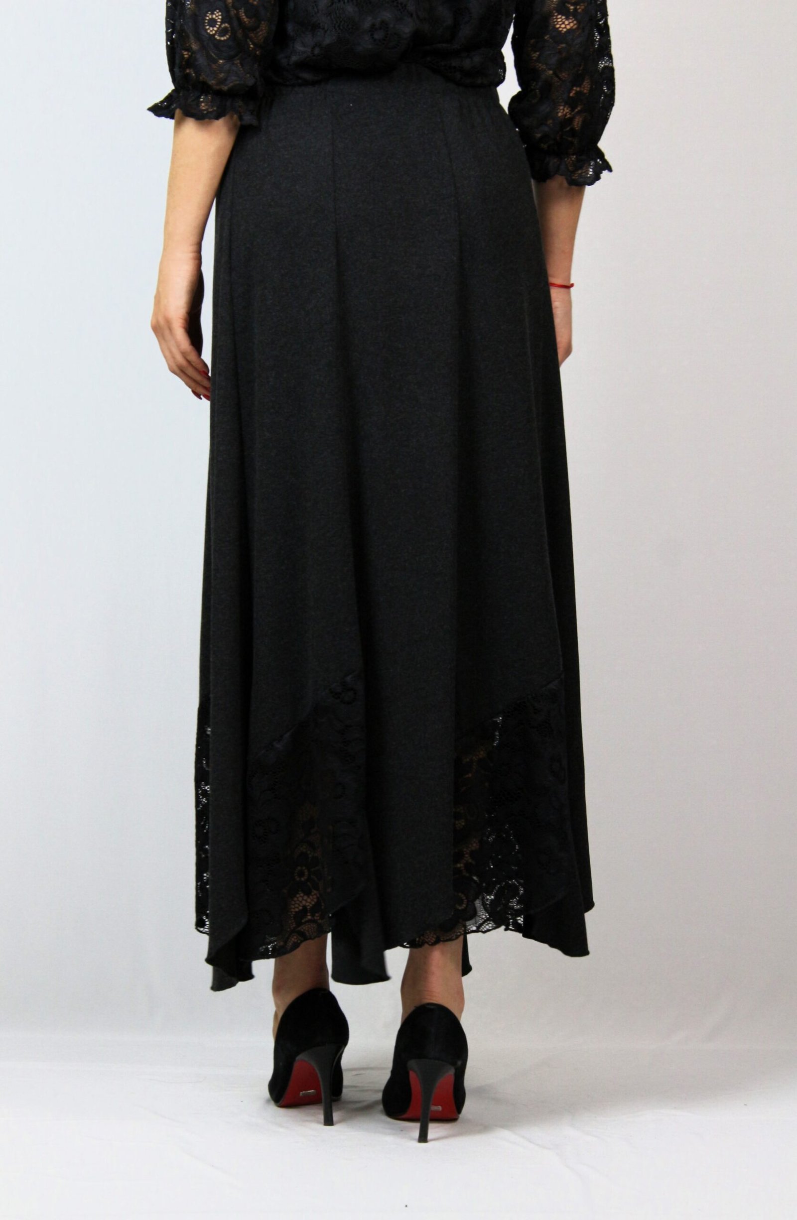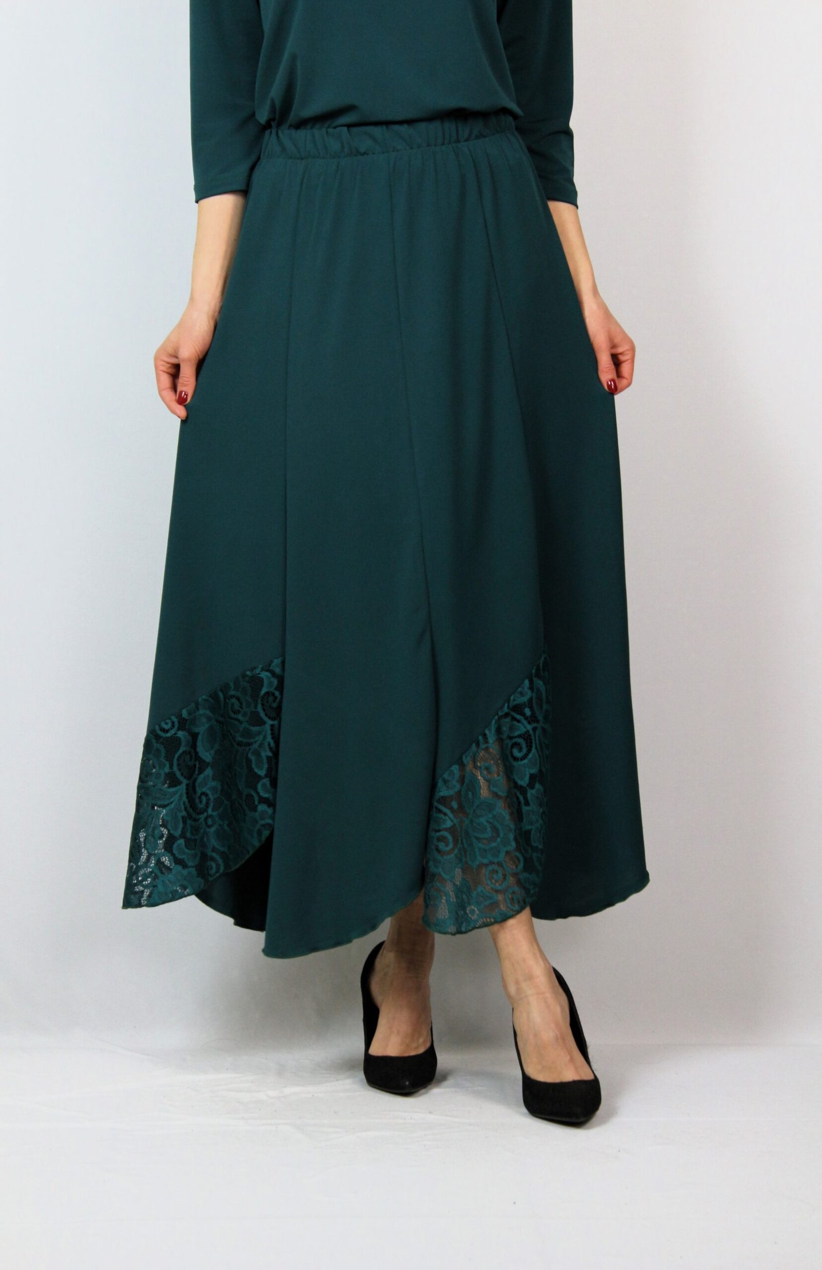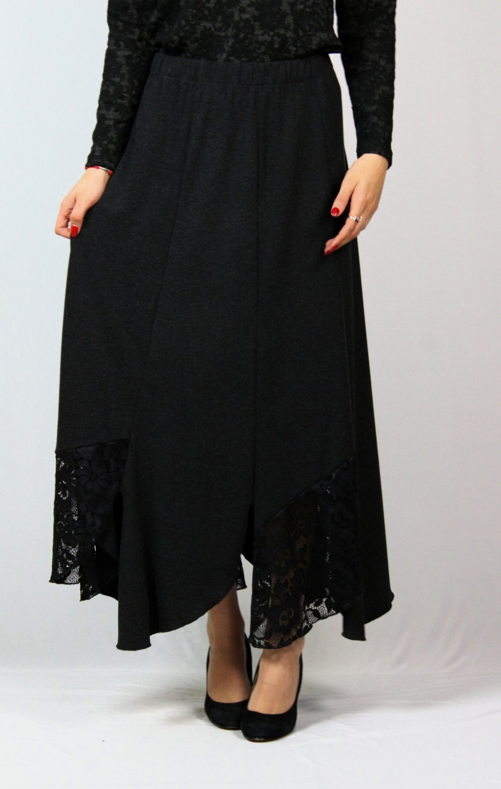 Дълга пола на осем парчета комбинирани в долната част с дантела , с ластичен колан.