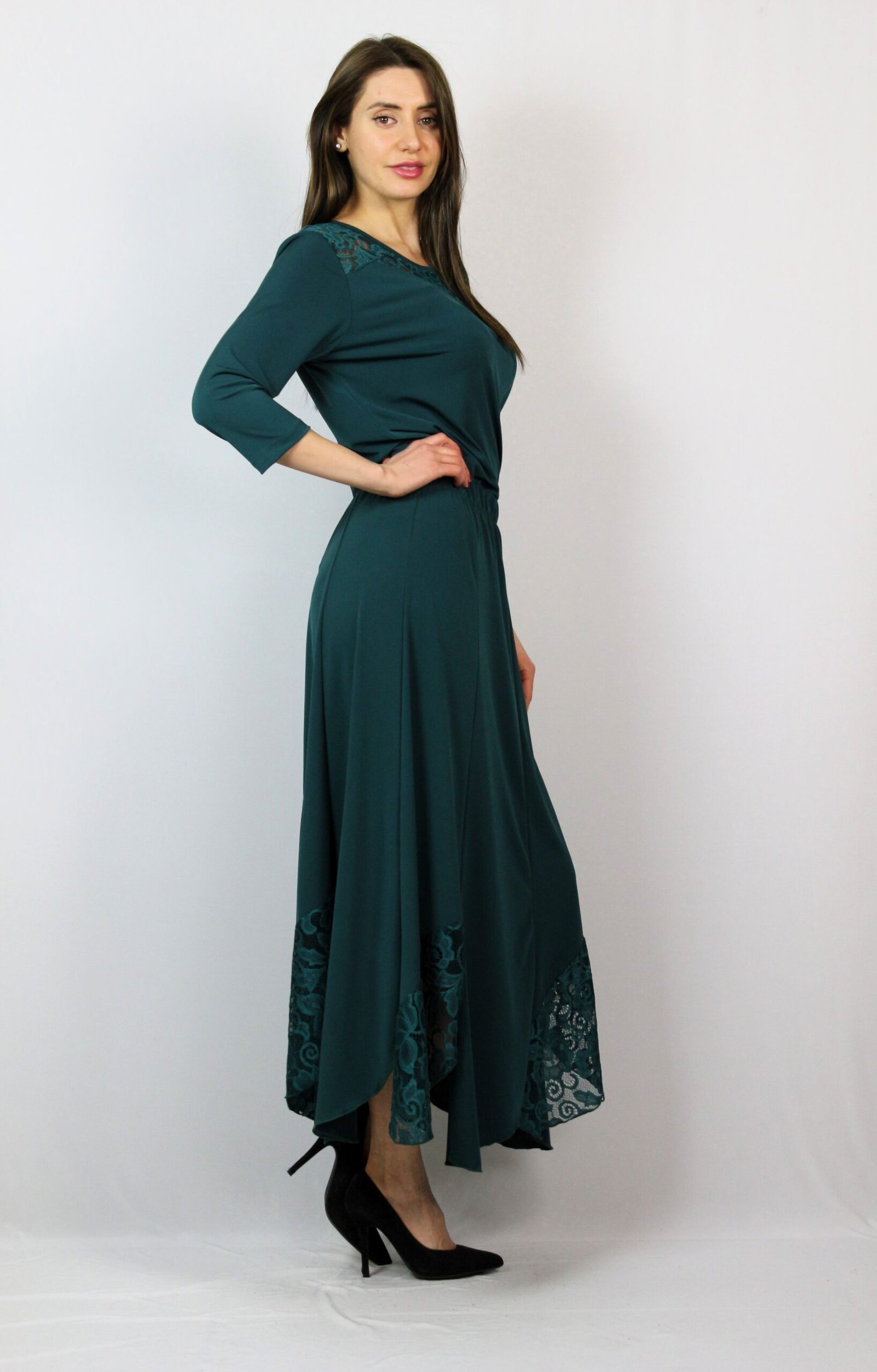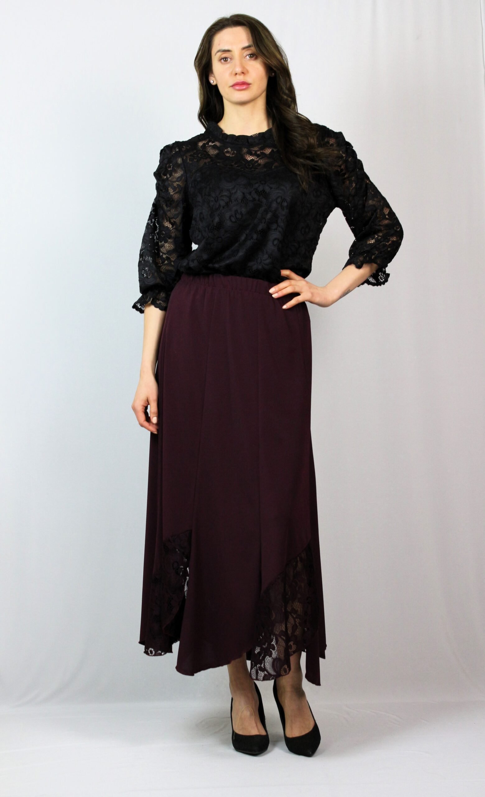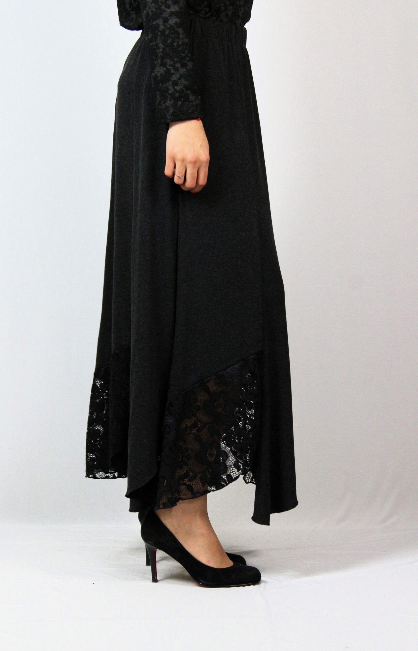Дълга пола на осем парчета комбинирани в долната част с дантела , с ластичен колан.