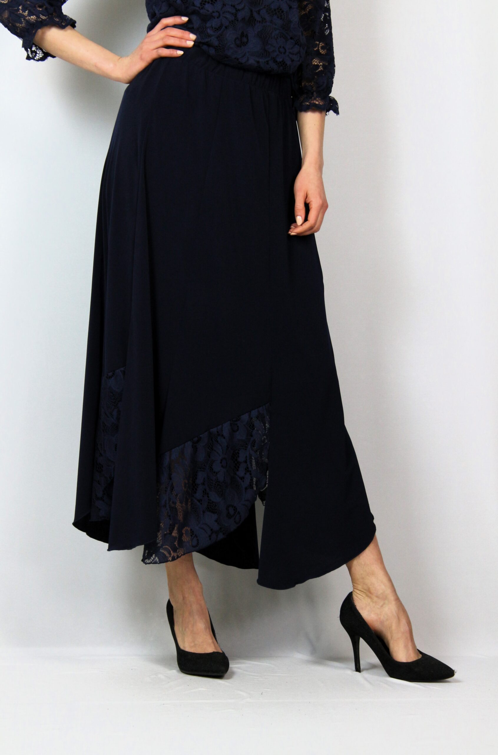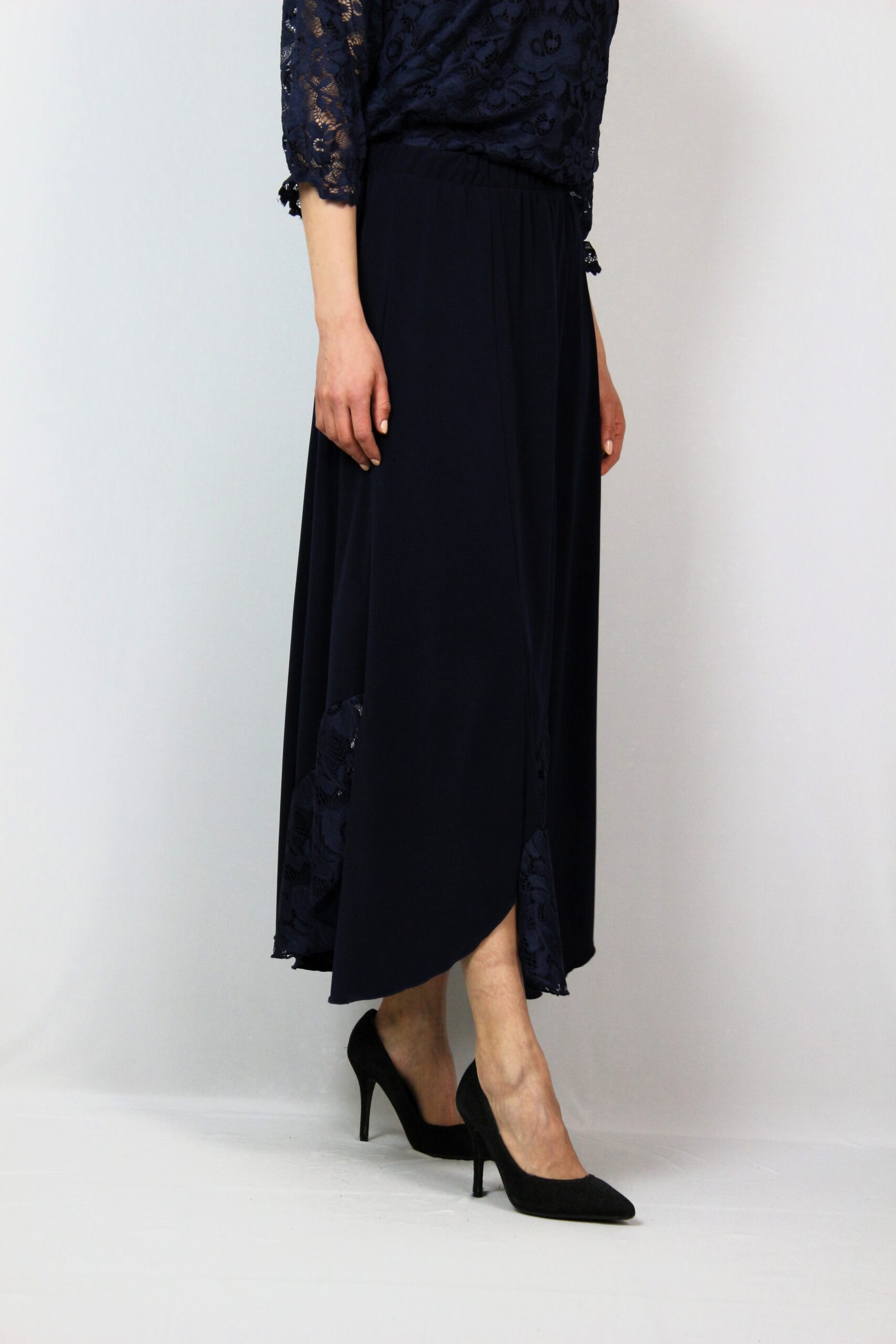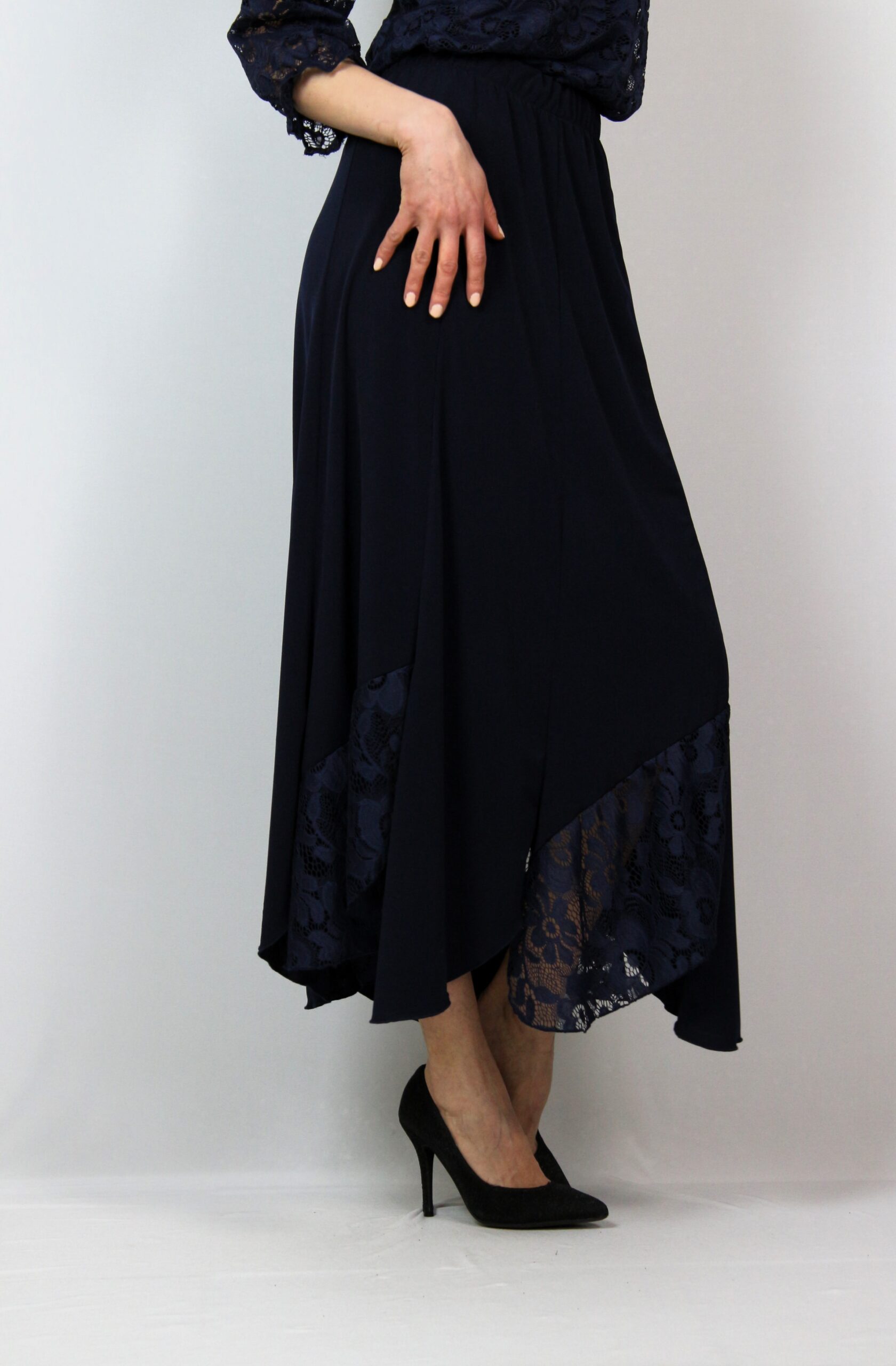 Дълга разкроена пола комбинирана с дантела с ластик на талията .