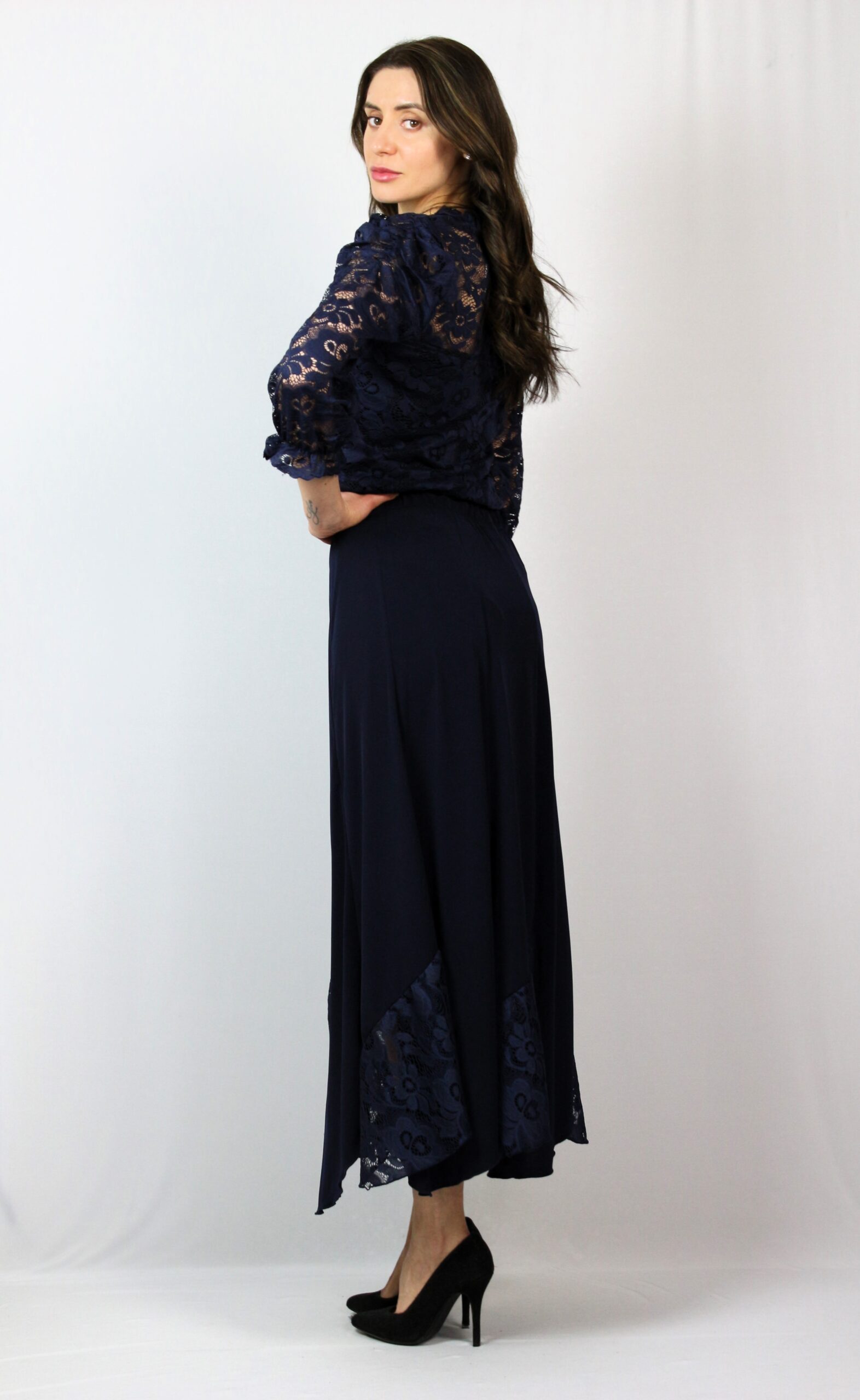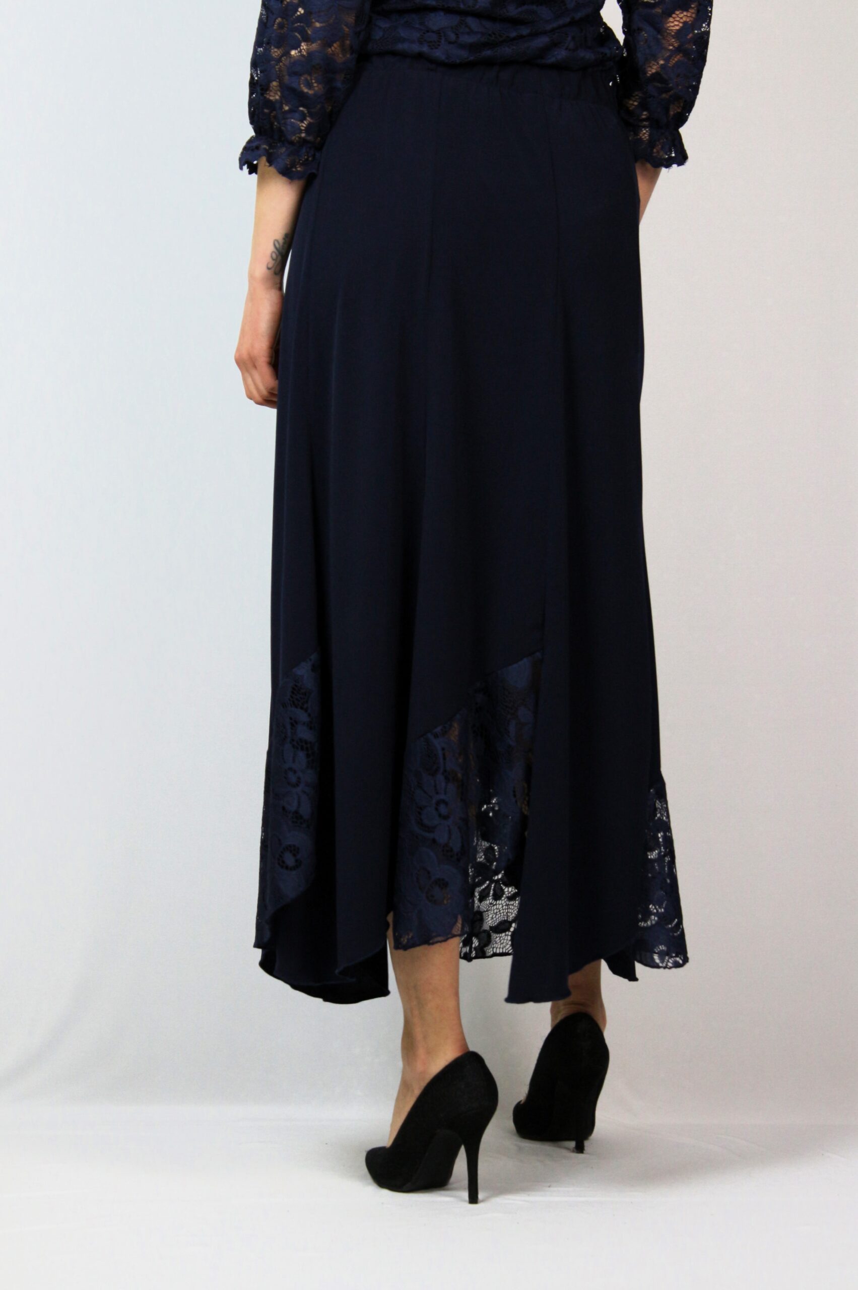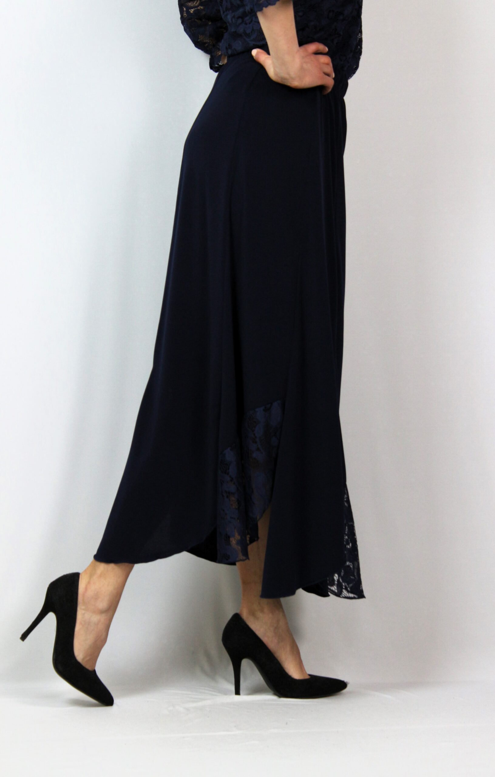Дълга разкроена пола комбинирана с дантела с ластик на талията .